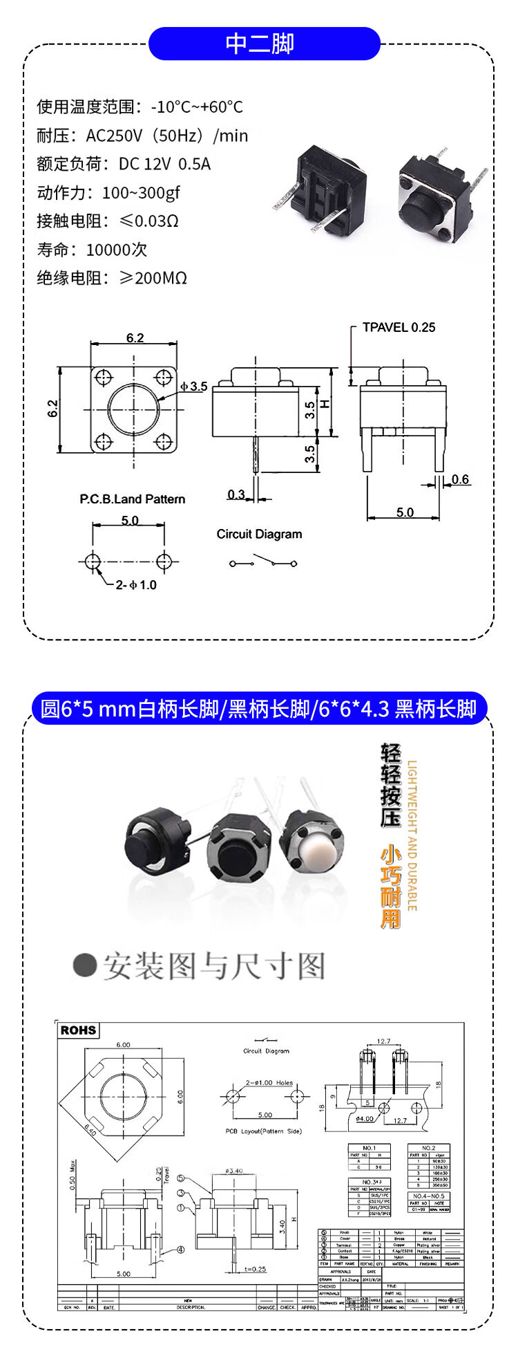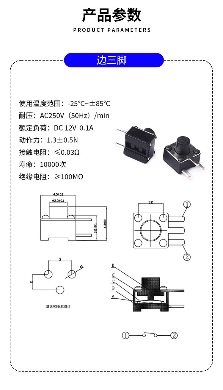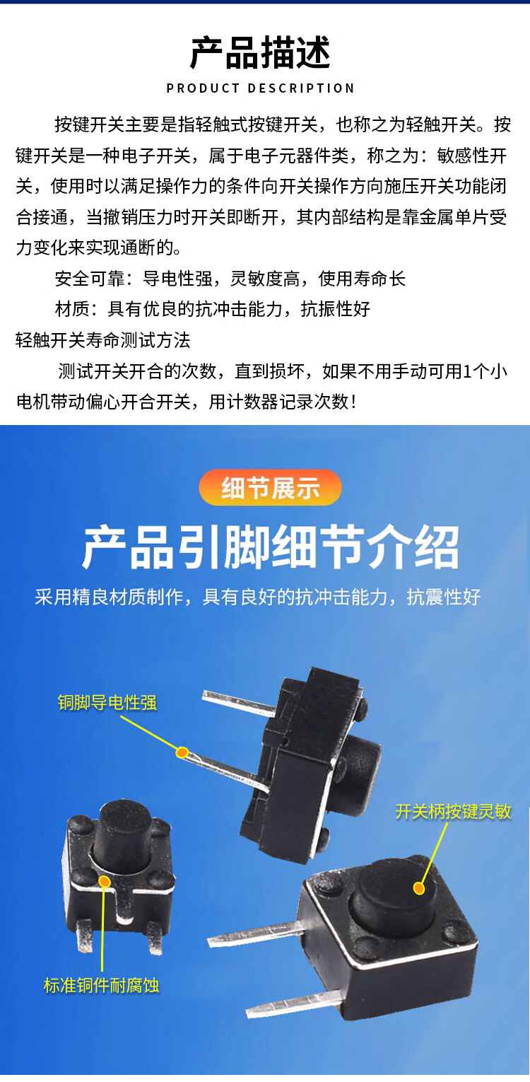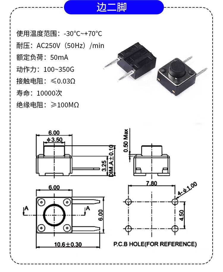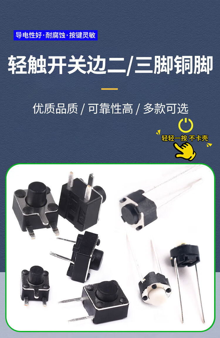 Side two/three-pin tact switch 6*6*5/7 4.5*4.5*5 micro button, middle 2-pin side insert copper pin, middle second-pin 6*6*7mm (20 pieces)