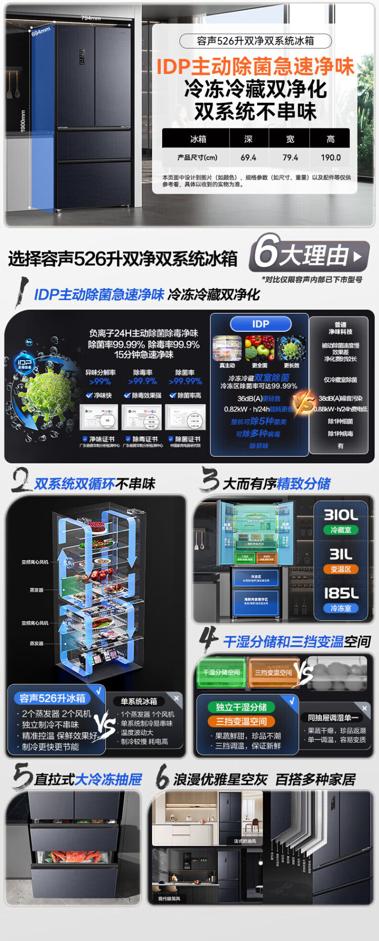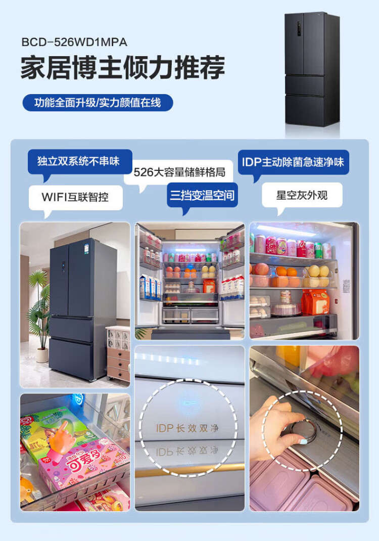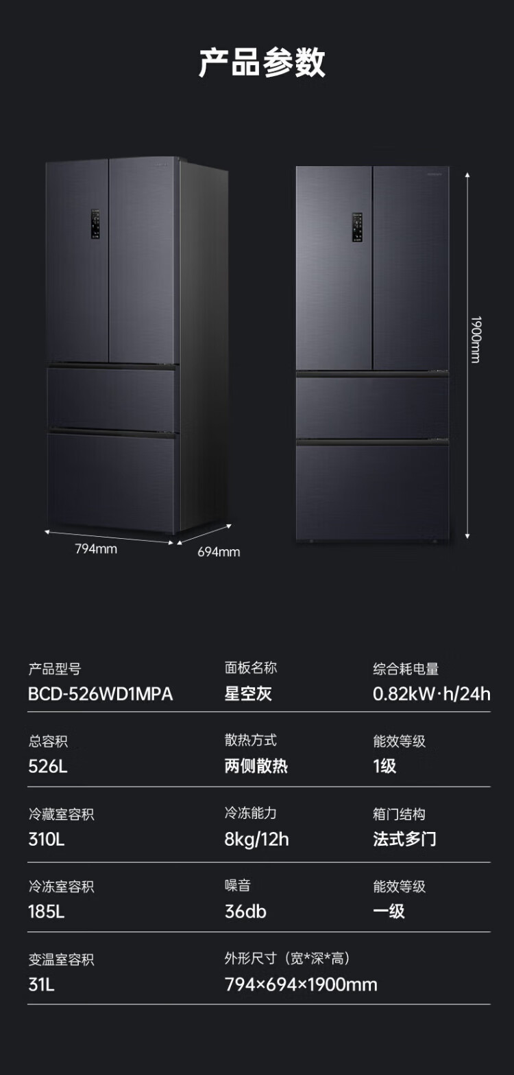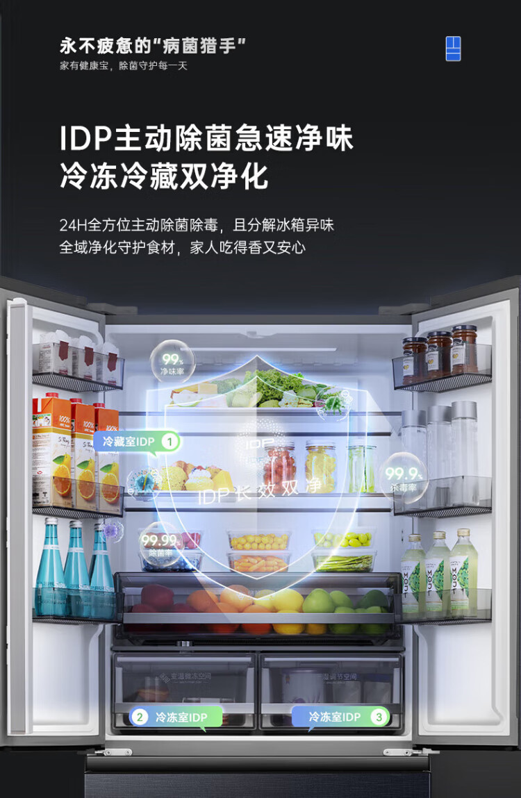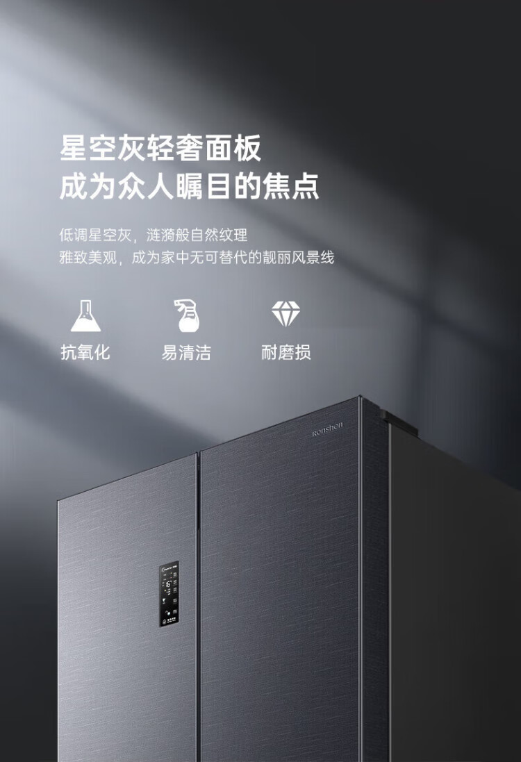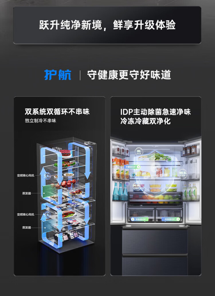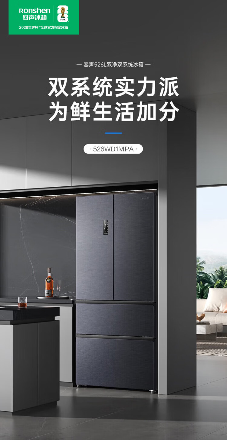 Rongsheng 526-liter dual-purification dual-system double-circulation French-style multi-door four-door refrigerator household large-capacity first-class energy-saving dual-frequency IDP active sterilization air-cooled frost-free Rongsheng 526-liter dual-purification dual-system sterilization refrigerator