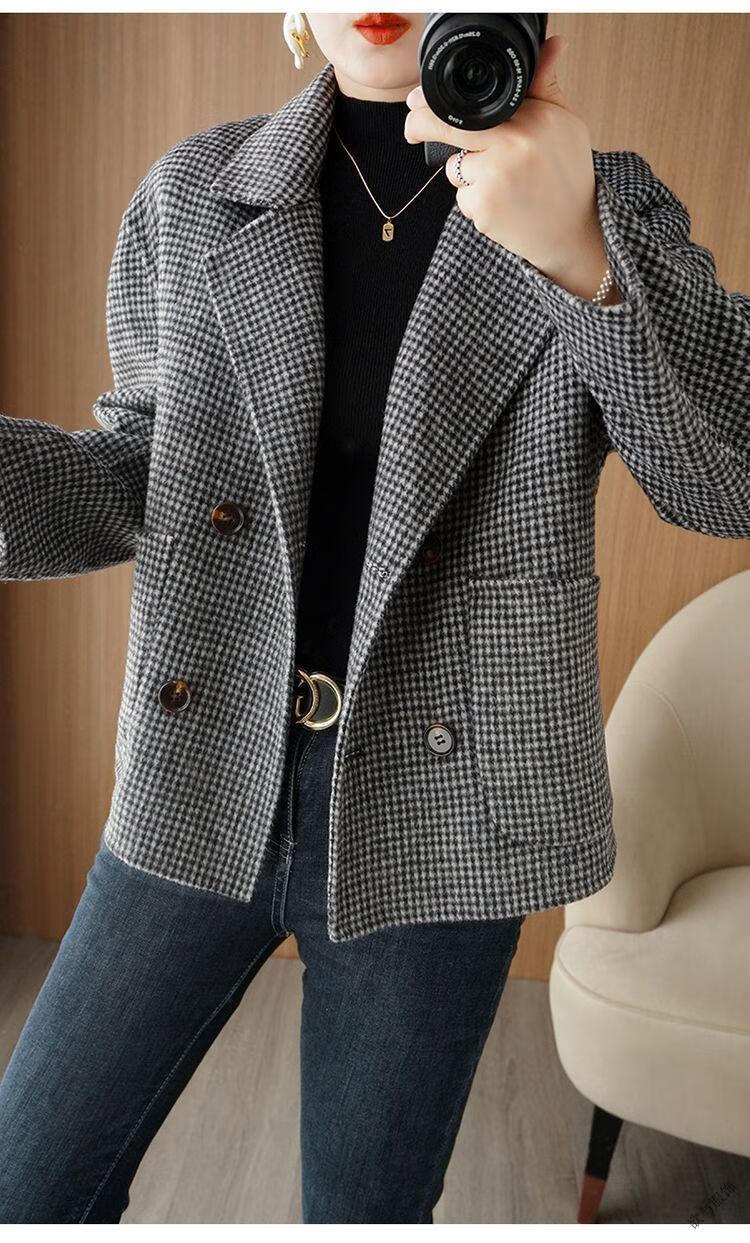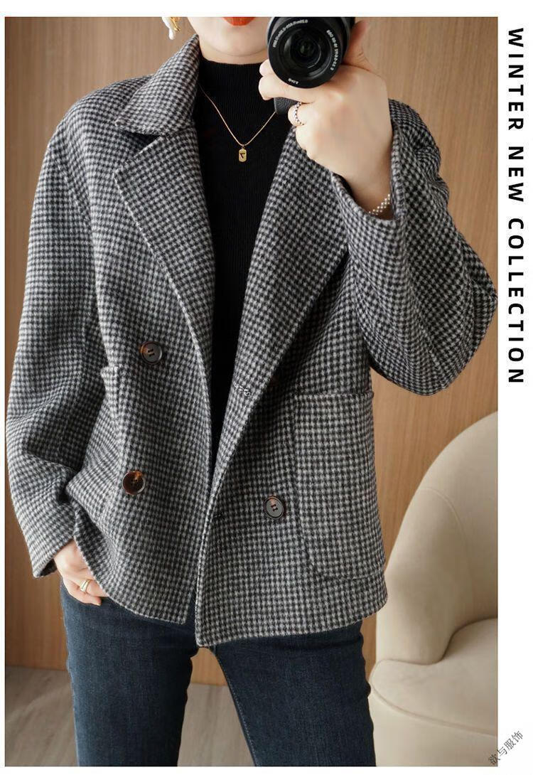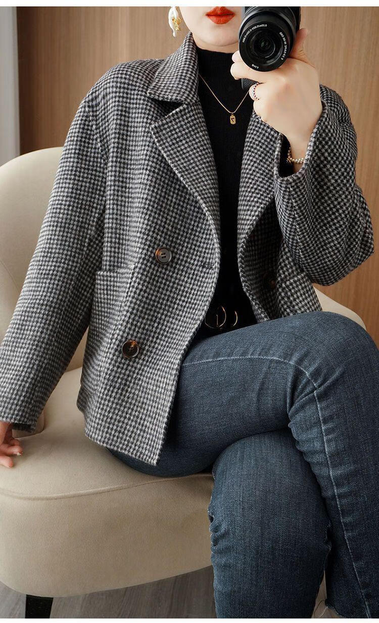 Pierre Cardin Houndstooth Plaid Woolen Coat Women's Short Small 2025 Spring and Autumn New High-end Fashion Plaid Woolen Coat Black Plaid XL 112-122 Jin
