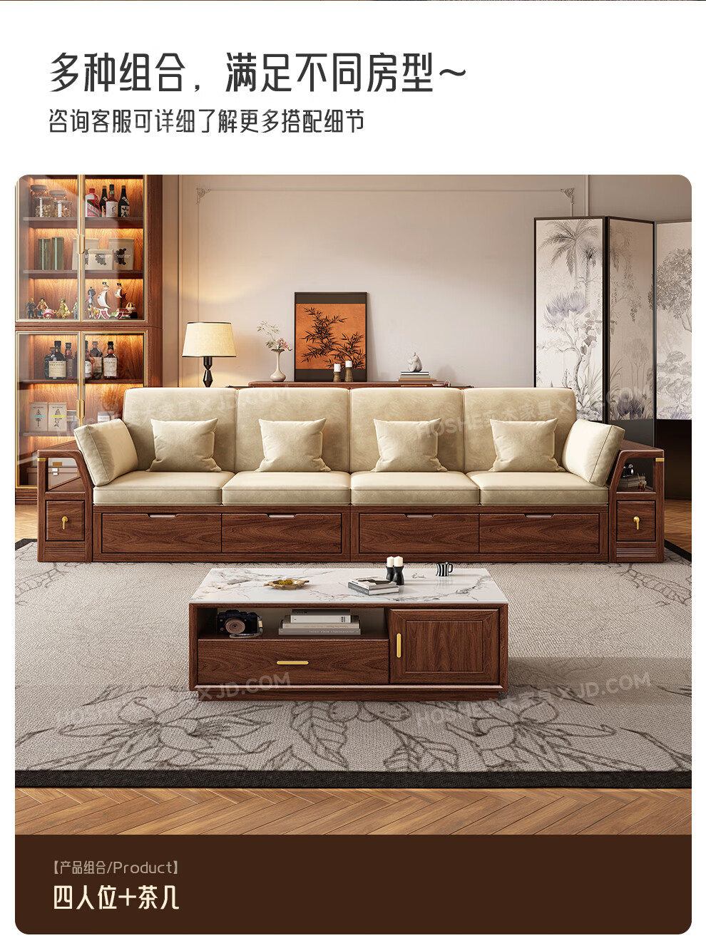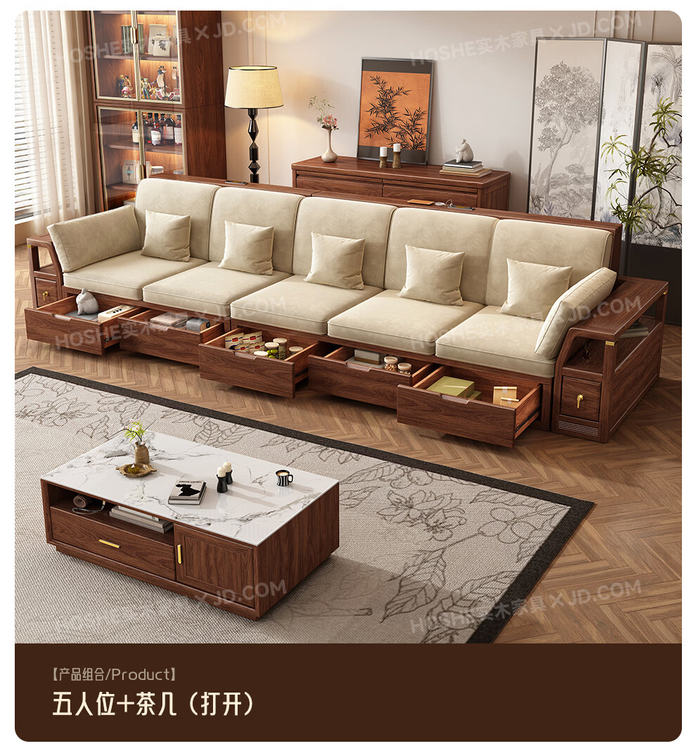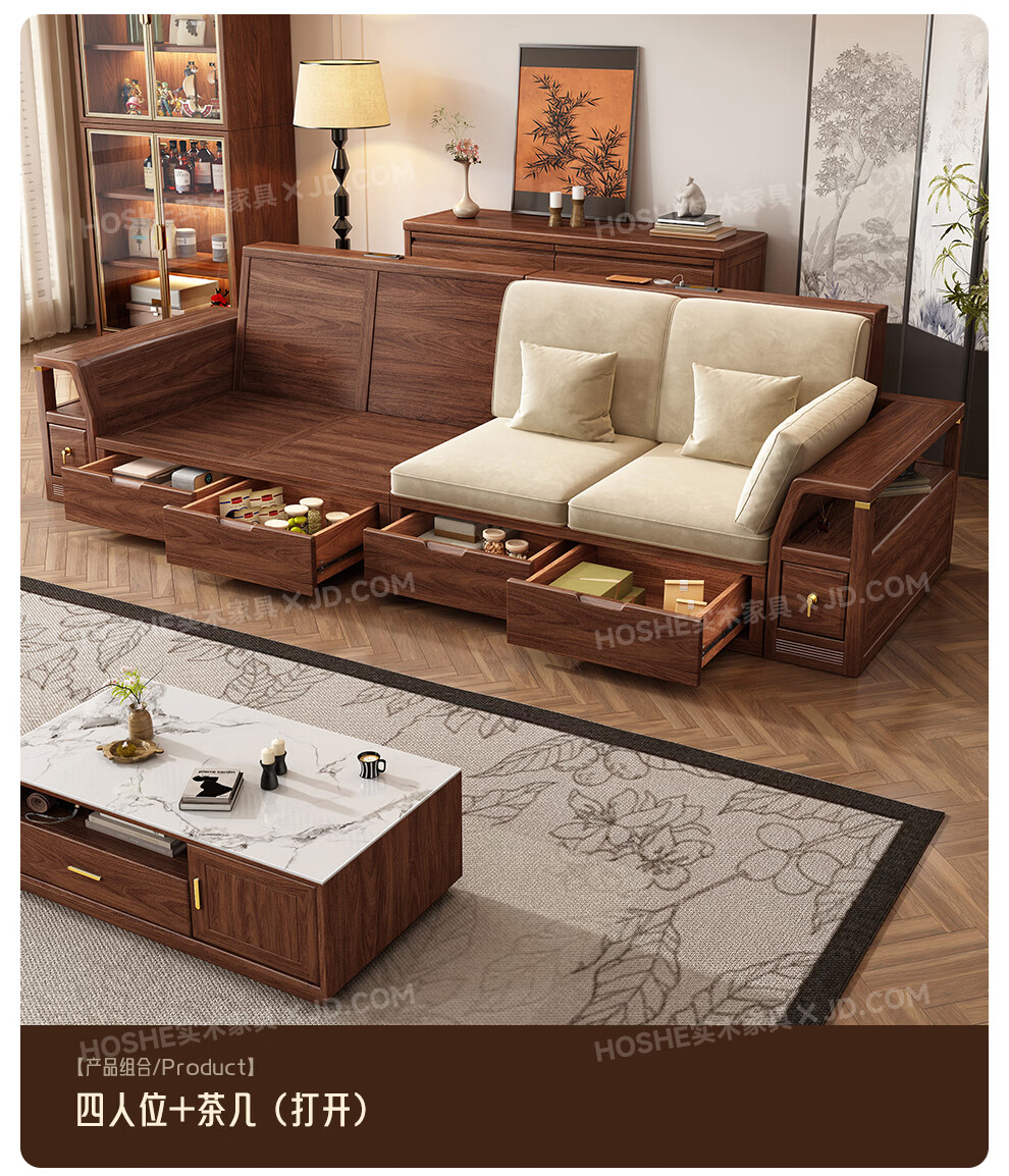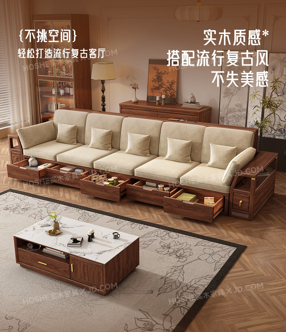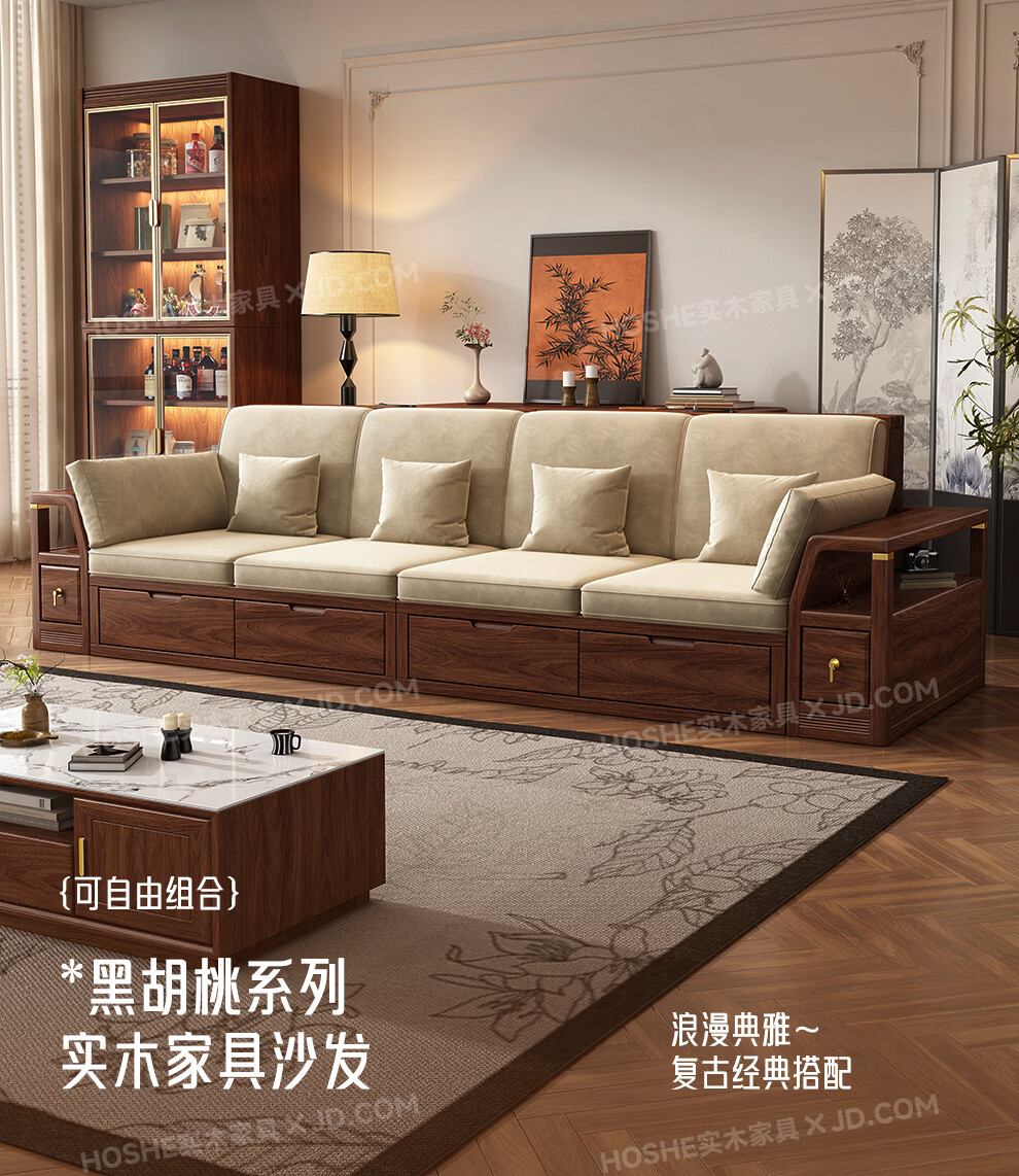 Harmony Home Sofa Medieval style black walnut solid wood sofa living room 2025 new storage furniture fabric sofa combination straight four-seater 2+2 with armrest pillow assembly