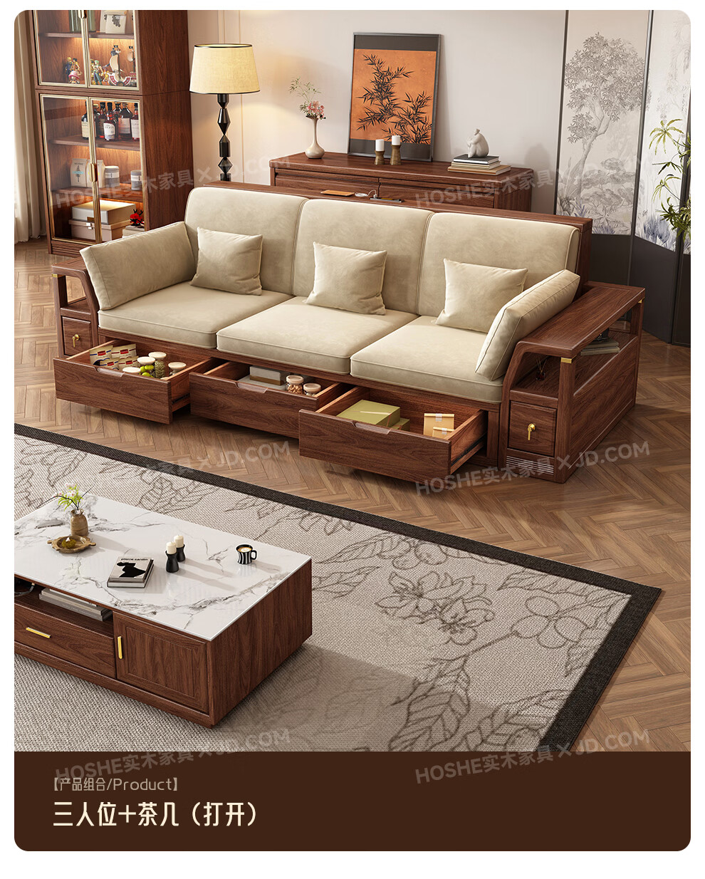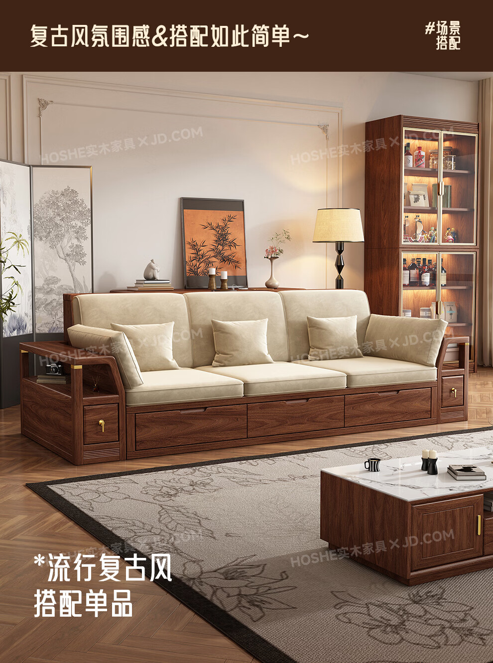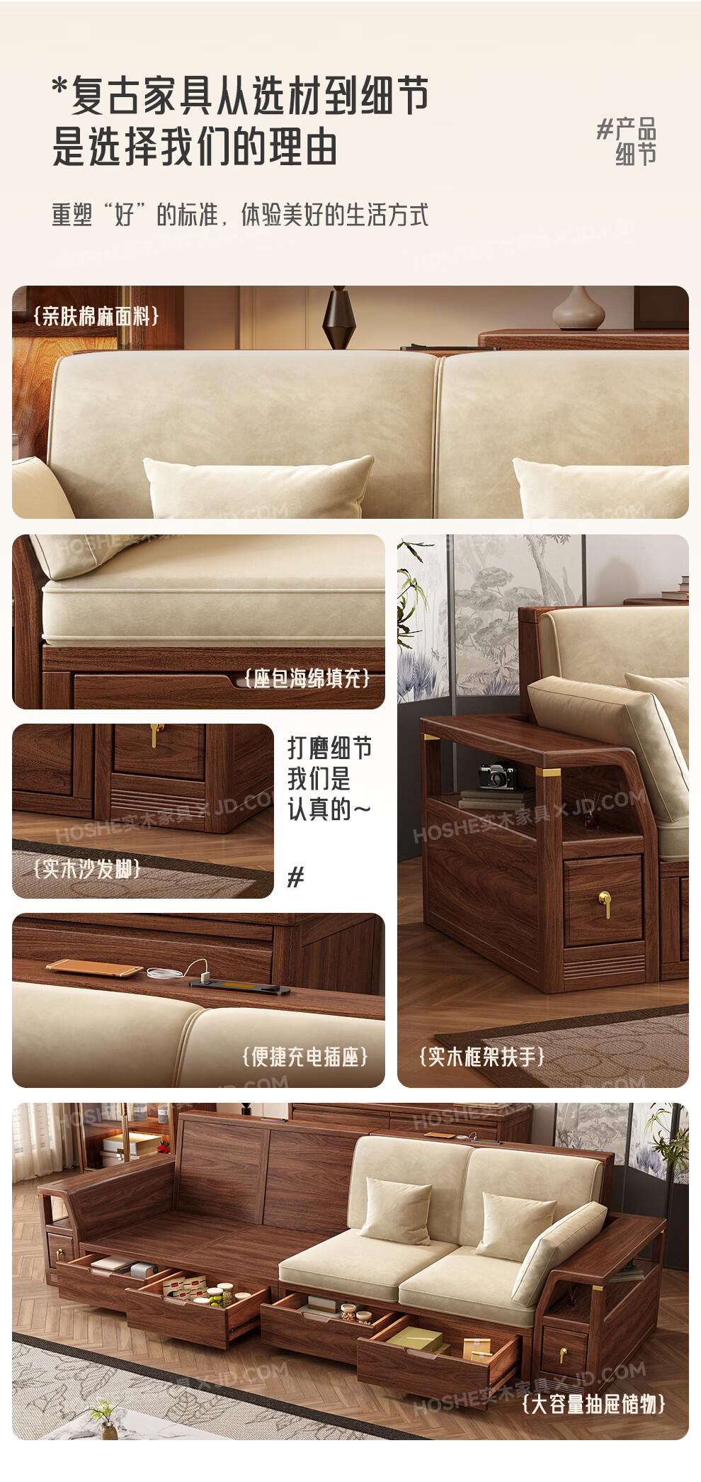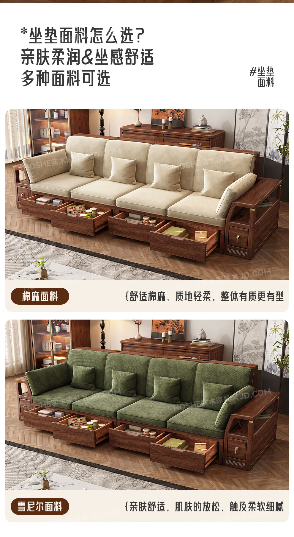 Harmony Home Sofa Medieval style black walnut solid wood sofa living room 2025 new storage furniture fabric sofa combination straight four-seater 2+2 with armrest pillow assembly