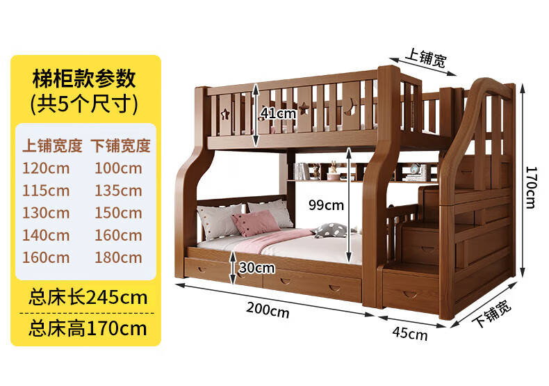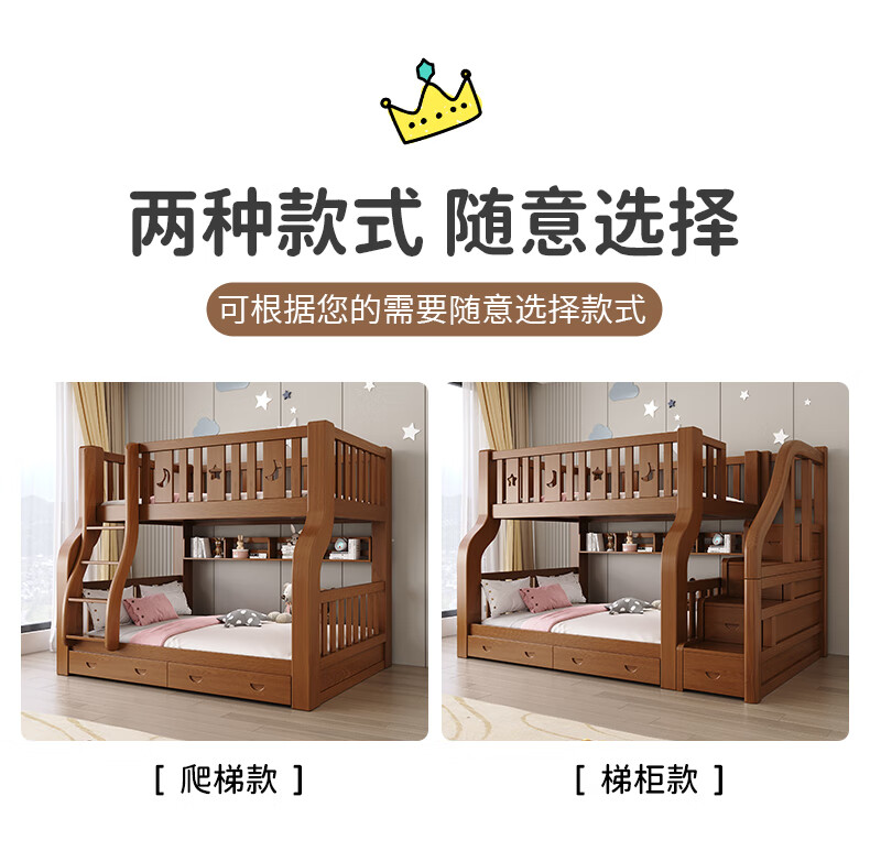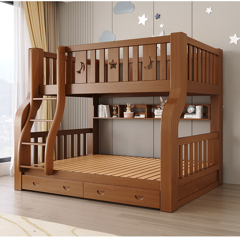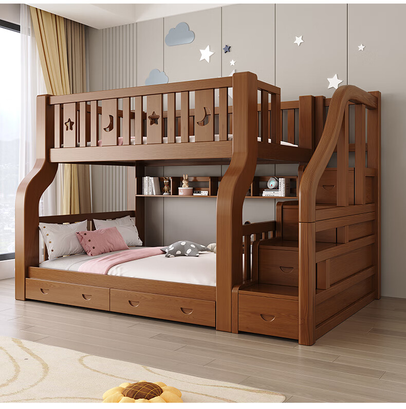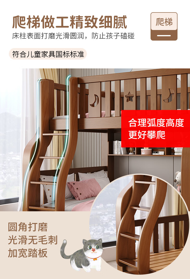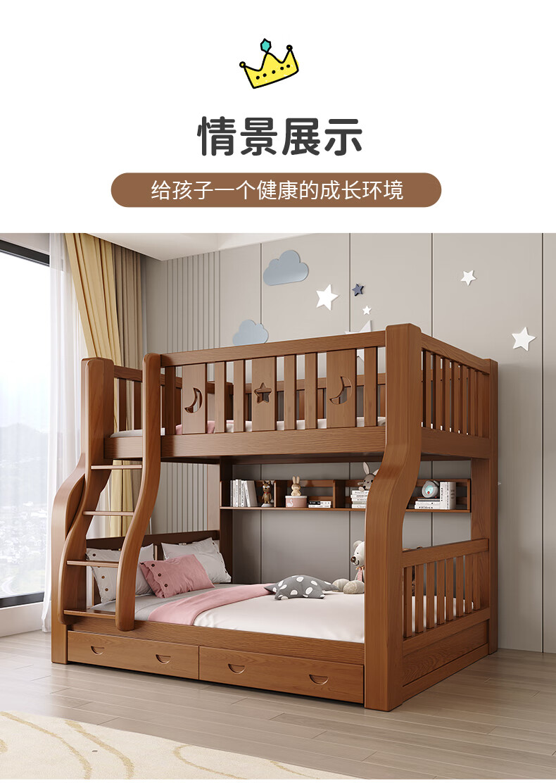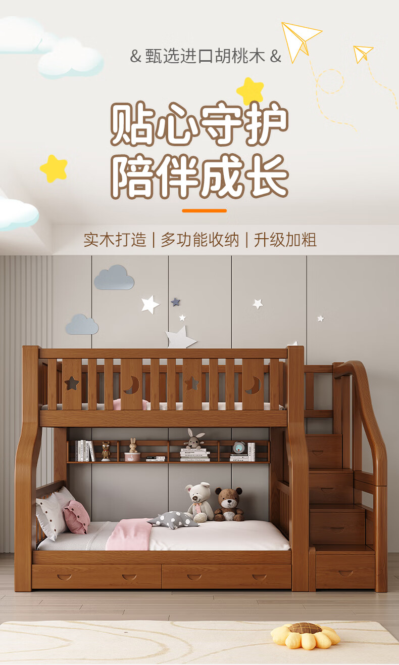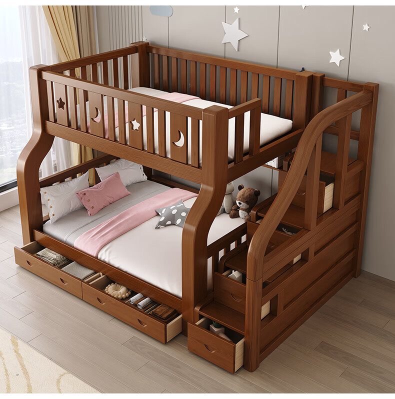 Fengxuantang walnut wood children's bunk bed solid wood high and low bed bunk bed upper bunk bed two-layer wooden bed double bed ladder cabinet style bare bed + mattress + bookshelf + double drawers upper bunk width 160 bottom bunk width 180