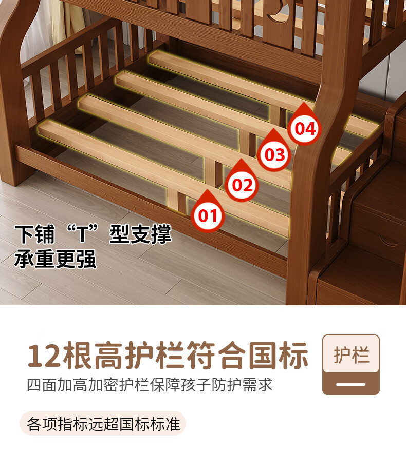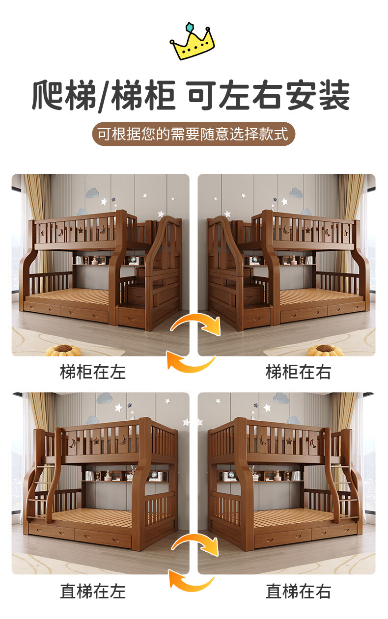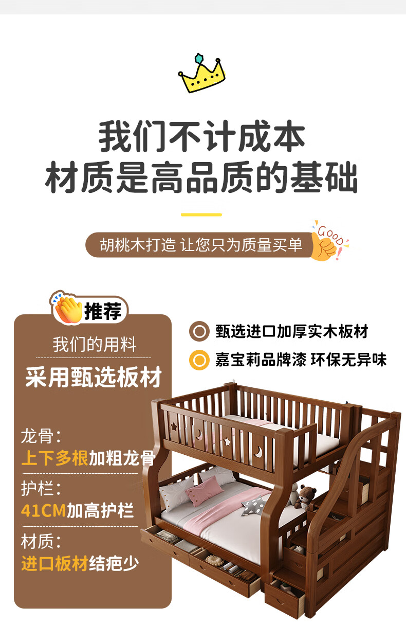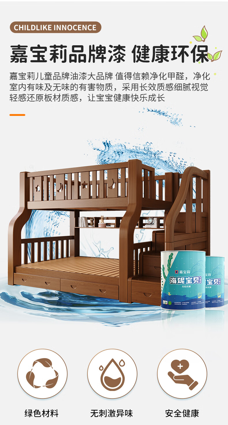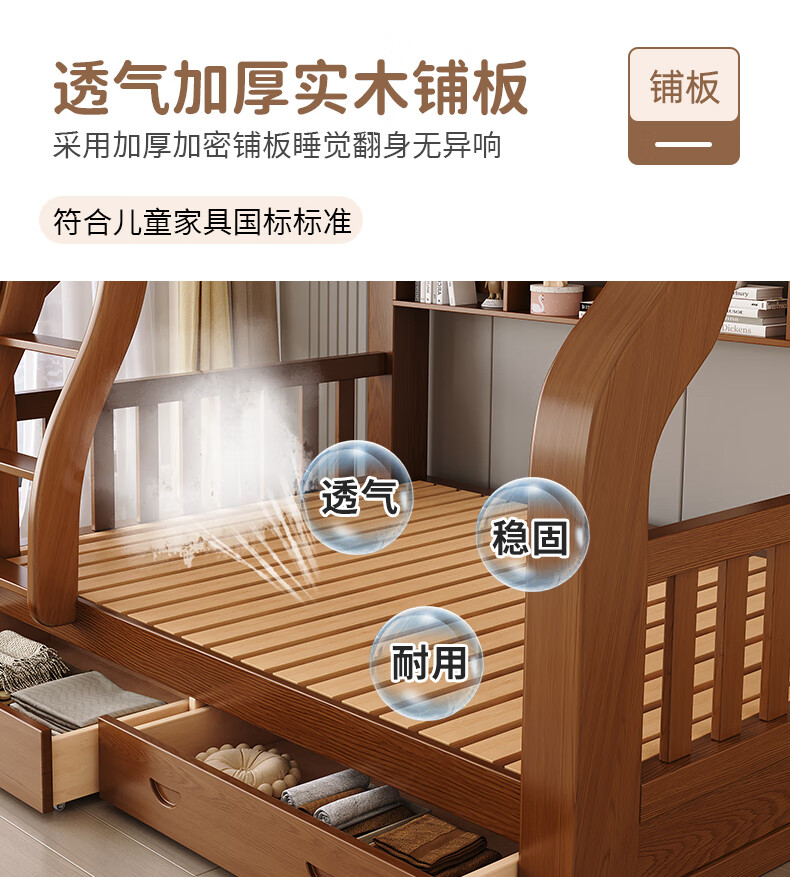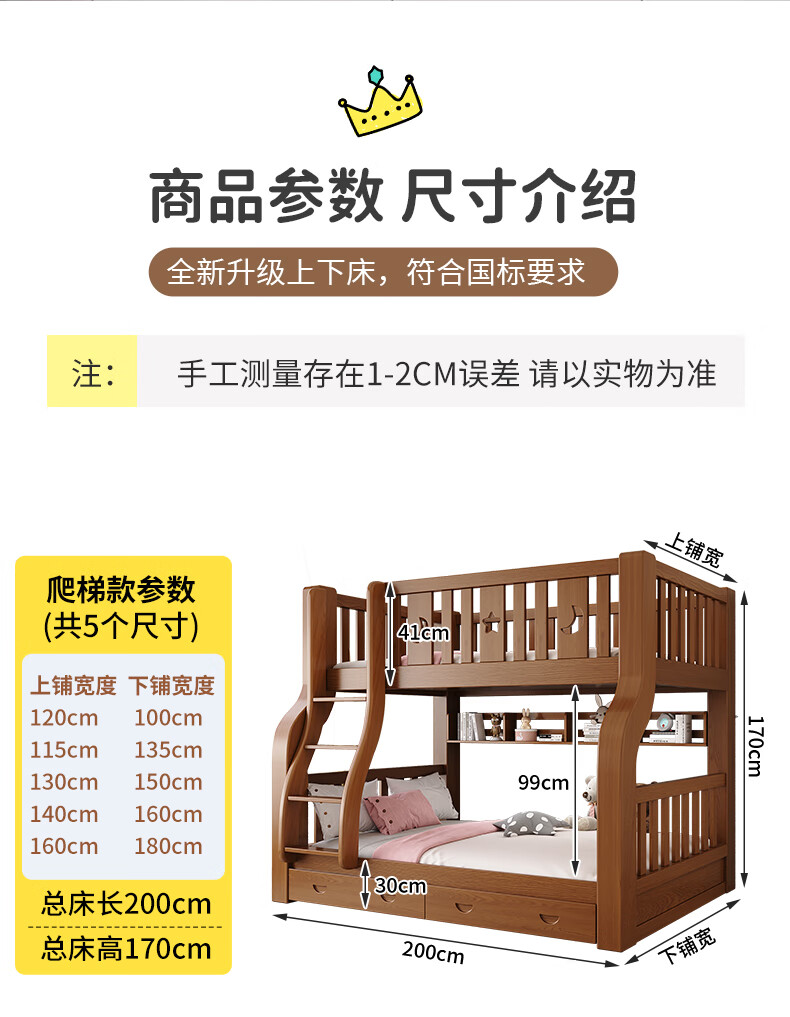 Fengxuantang walnut wood children's bunk bed solid wood high and low bed bunk bed upper bunk bed two-layer wooden bed double bed ladder cabinet style bare bed + mattress + bookshelf + double drawers upper bunk width 160 bottom bunk width 180