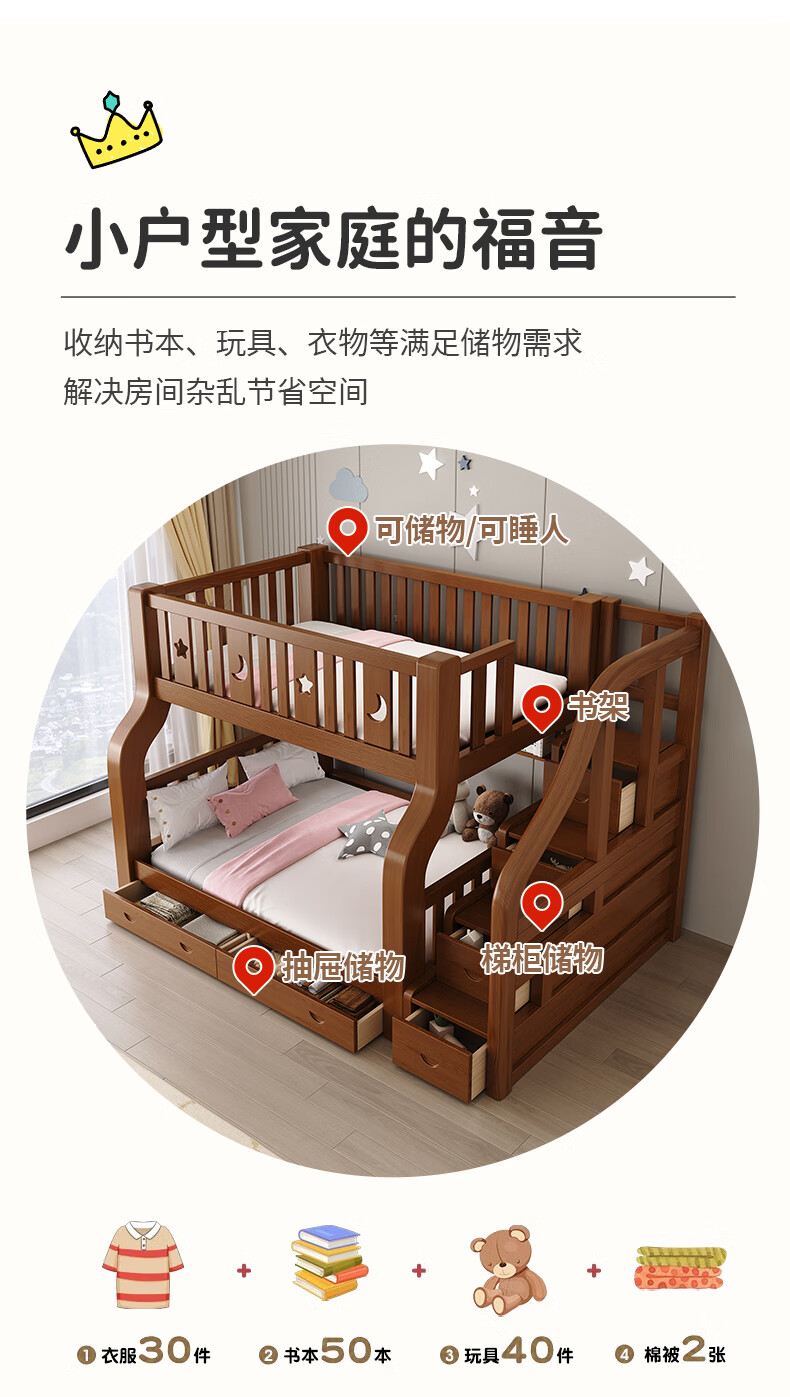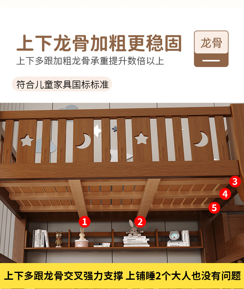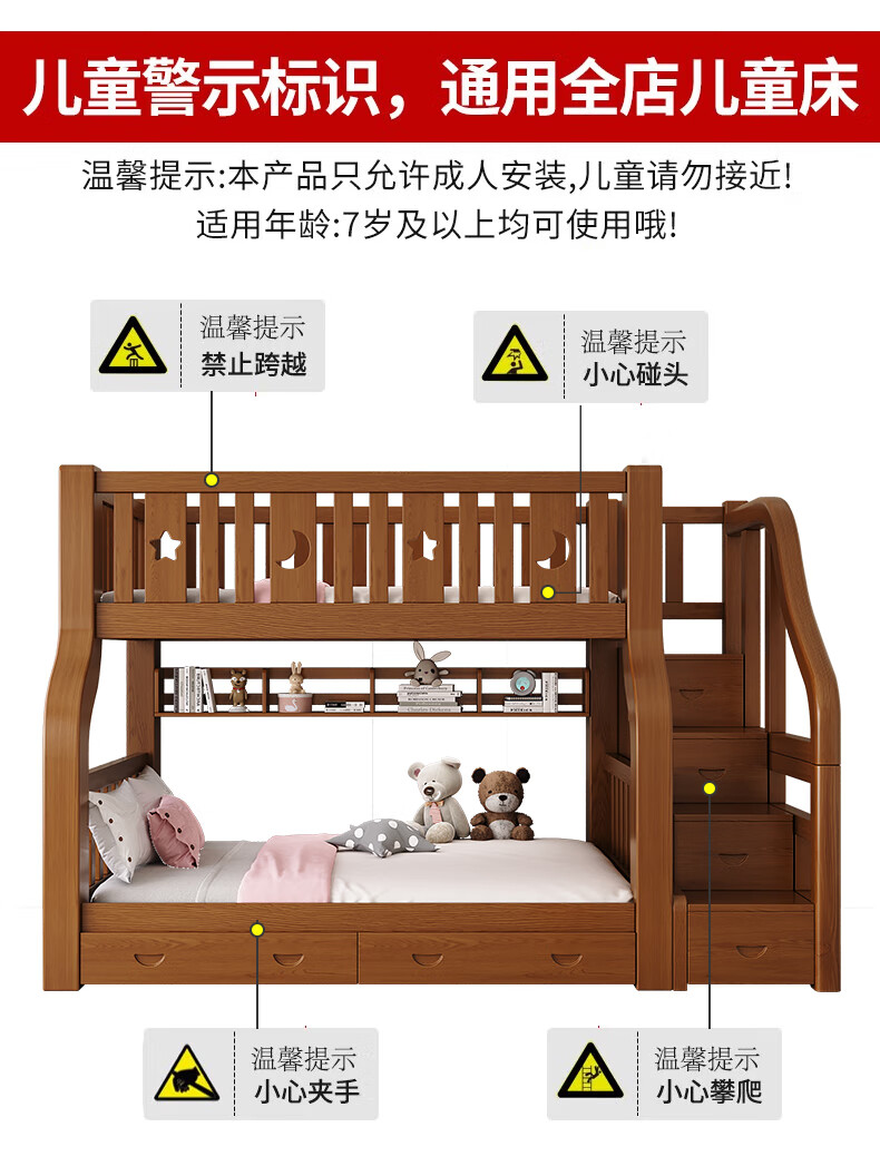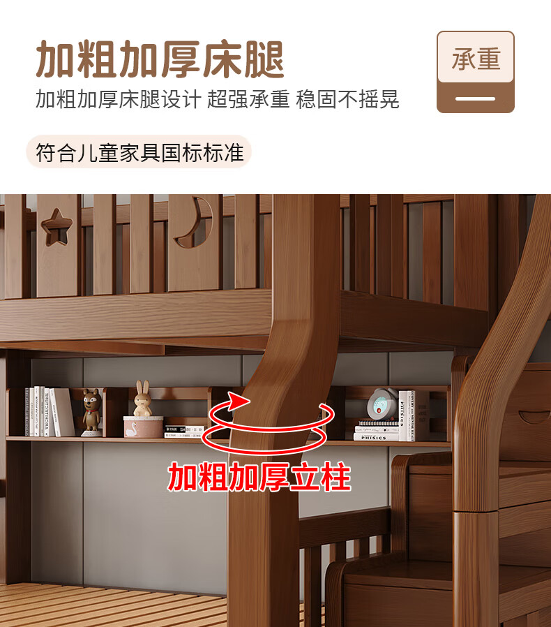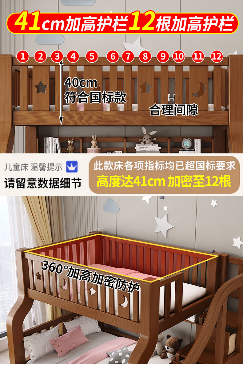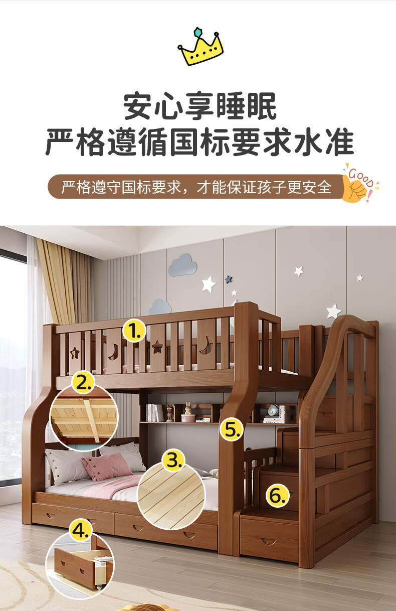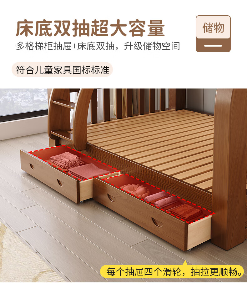 Fengxuantang walnut wood children's bunk bed solid wood high and low bed bunk bed upper bunk bed two-layer wooden bed double bed ladder cabinet style bare bed + mattress + bookshelf + double drawers upper bunk width 160 bottom bunk width 180