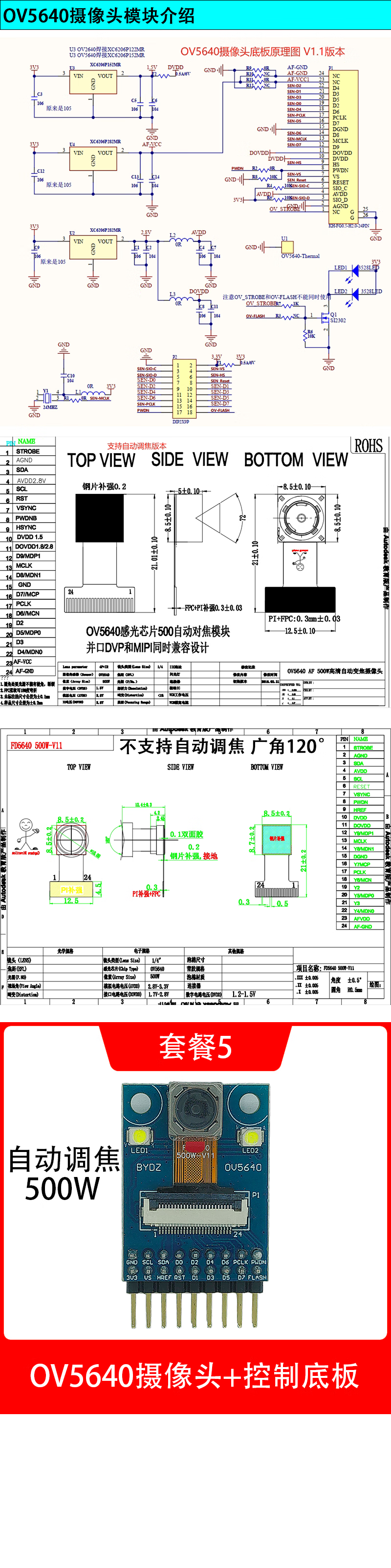 OV2640 camera OV5640 module 200W pixel hardware compatible with friends STM32F103ZE/F4/F7 set of 4 OV5640 driver base plate without camera (supports automatic focus