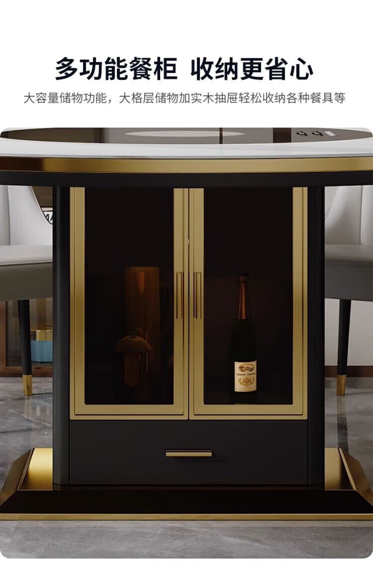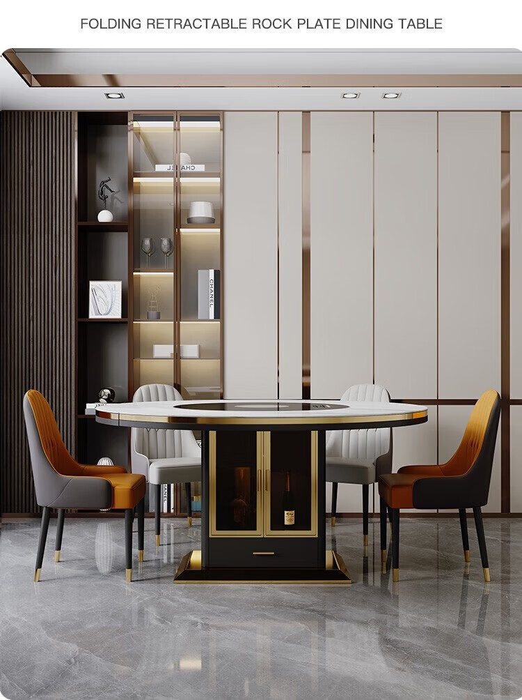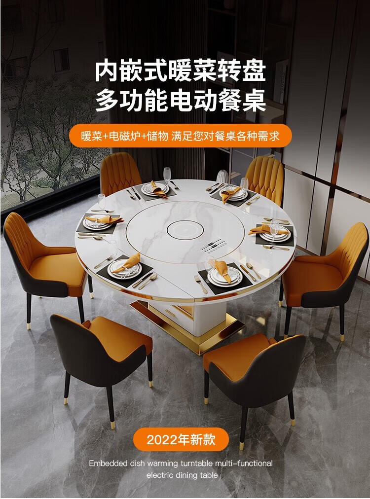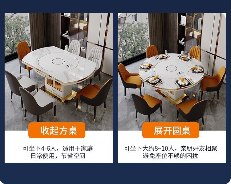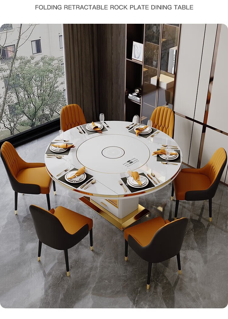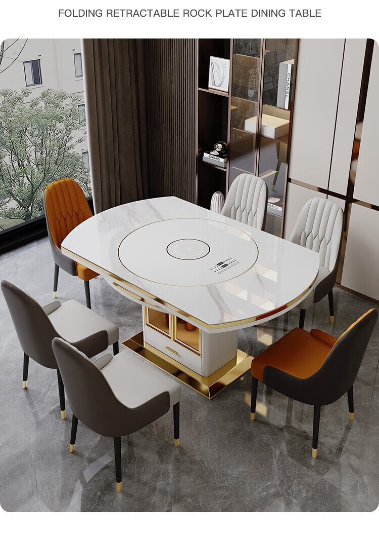Light luxury high-end slate dining table and chairs, multi-functional household induction cooker, smart dining table, modern simple retractable and foldable 1.5-meter dining table, induction cooker turntable for warming dishes