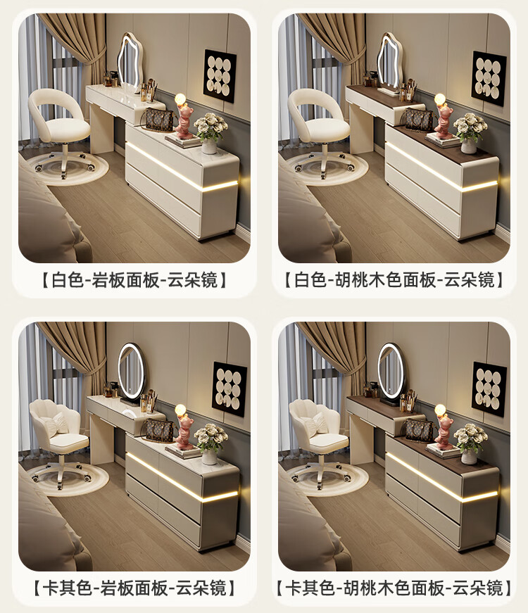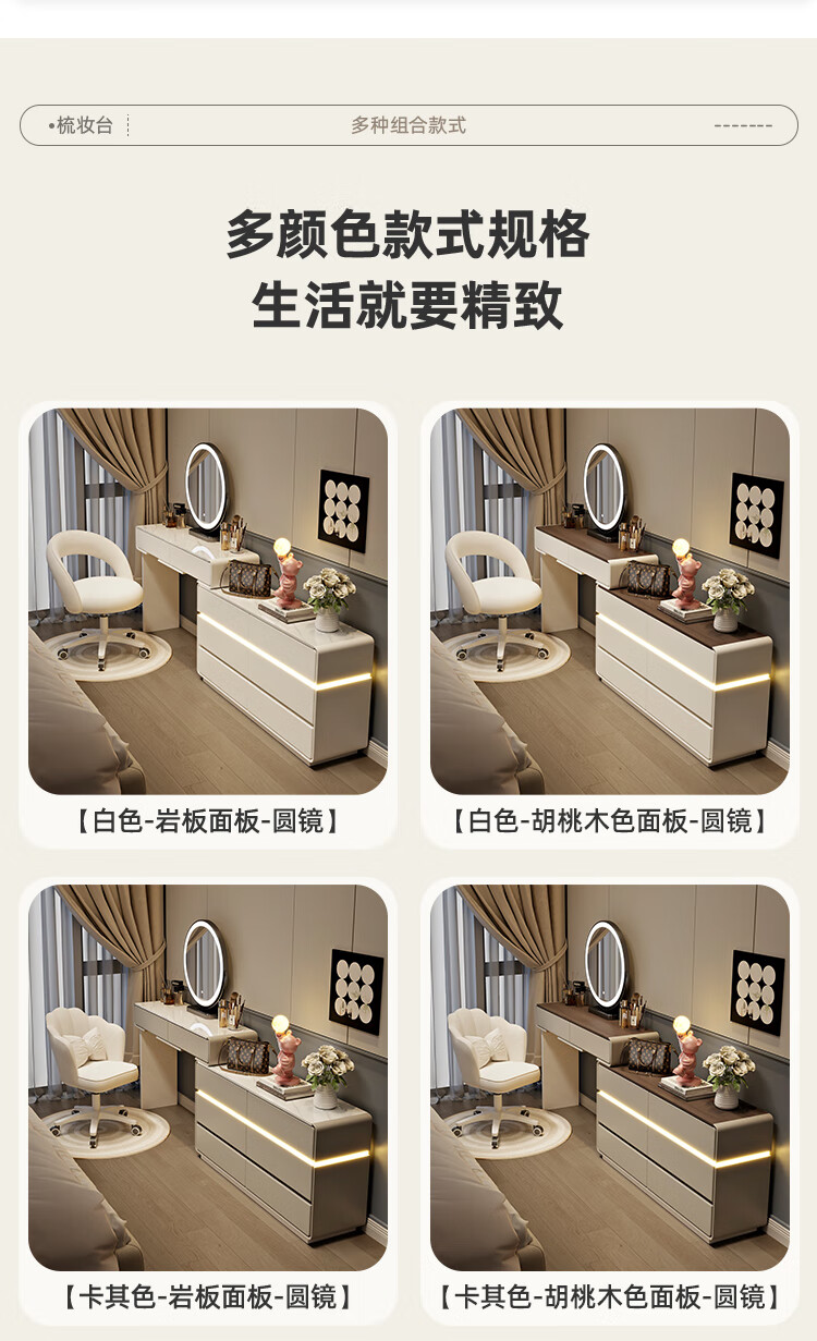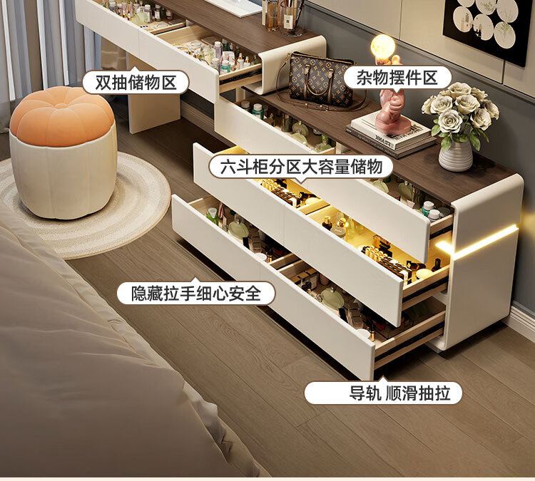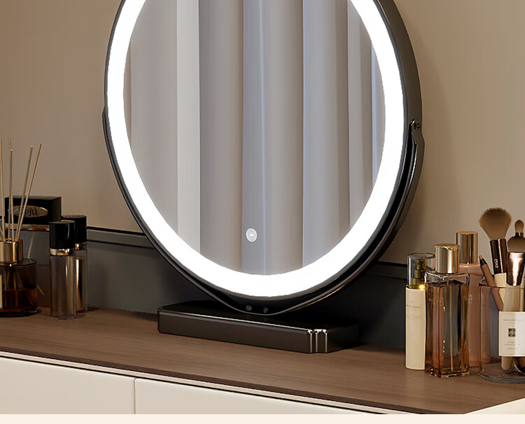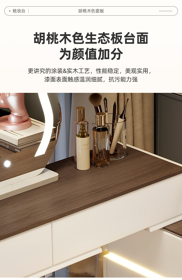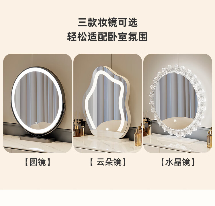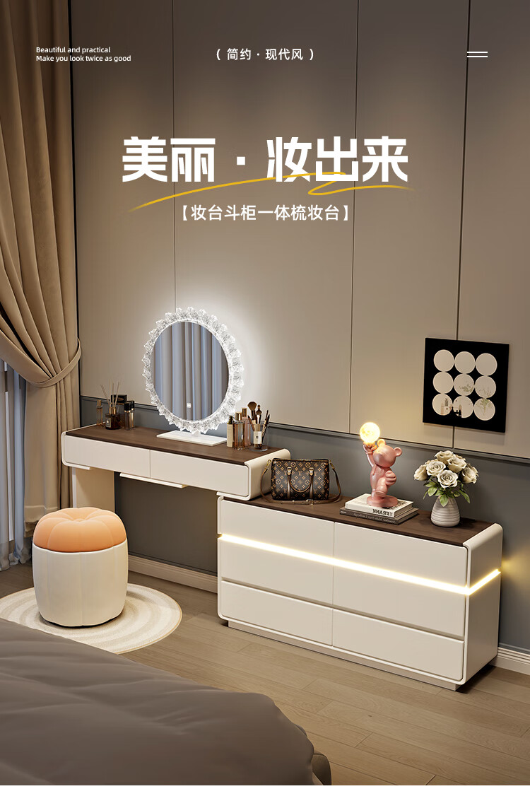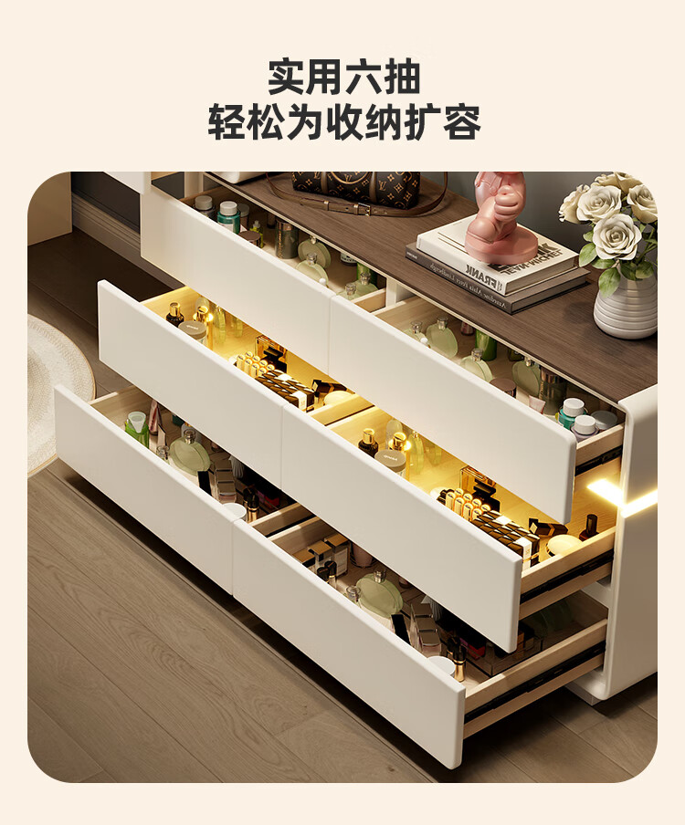 Yuke Dressing Table with Lights New Solid Wood Small Apartment Modern Simple Dressing Table Bedroom Drawer Cabinet Integrated Light Luxurious and High-Level 100cm White Walnut Surface + Six Drawer Cabinet + Round Mirror + Storage Pumpkin Stool