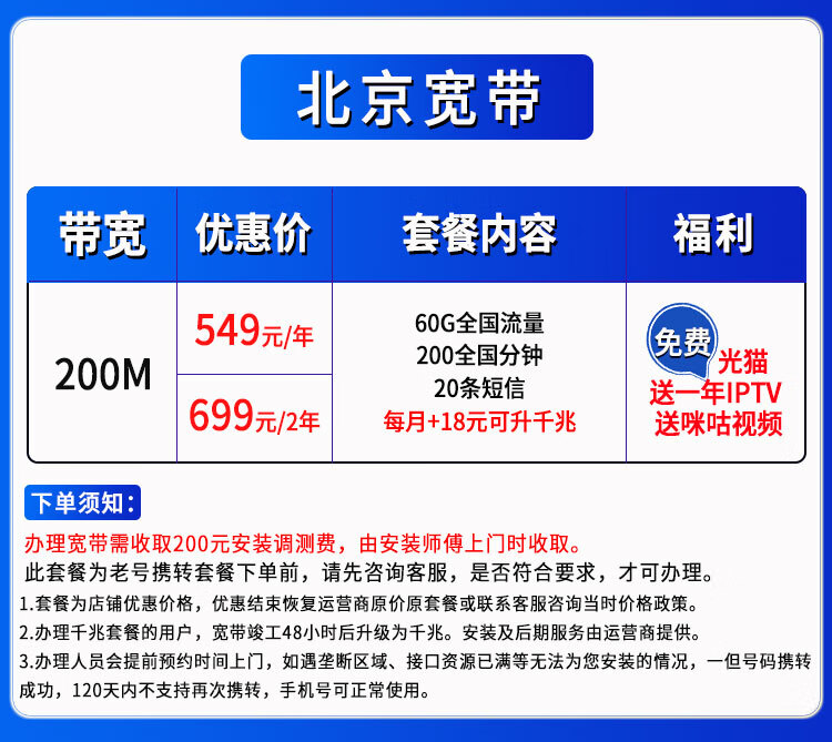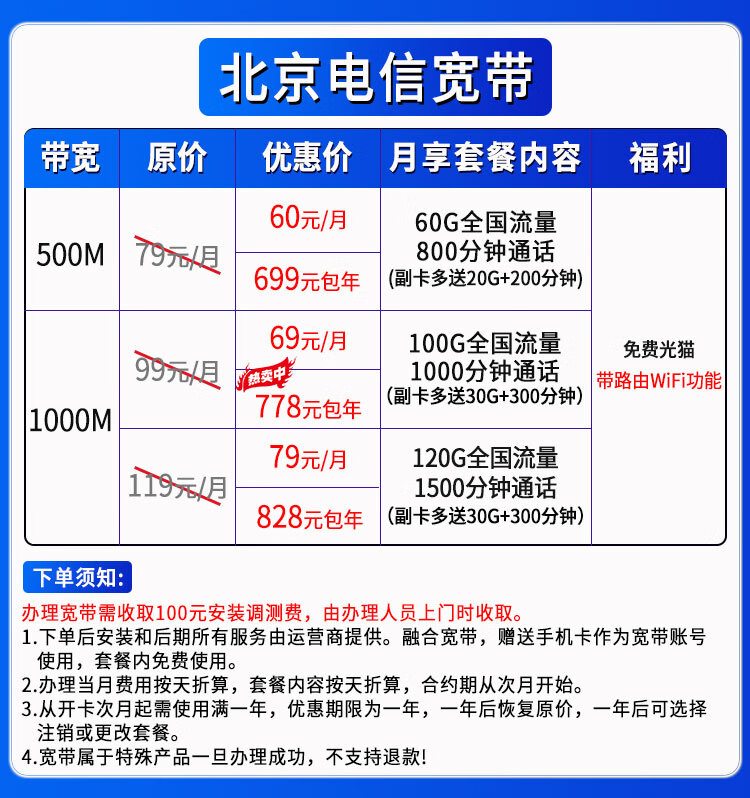 China Telecom Beijing Telecom Broadband handles door-to-door installation and integration package, number portability and network transfer, household single broadband. Beijing Telecom Broadband handles and installs 60 yuan/month fiber optic 500M with optical cat.
