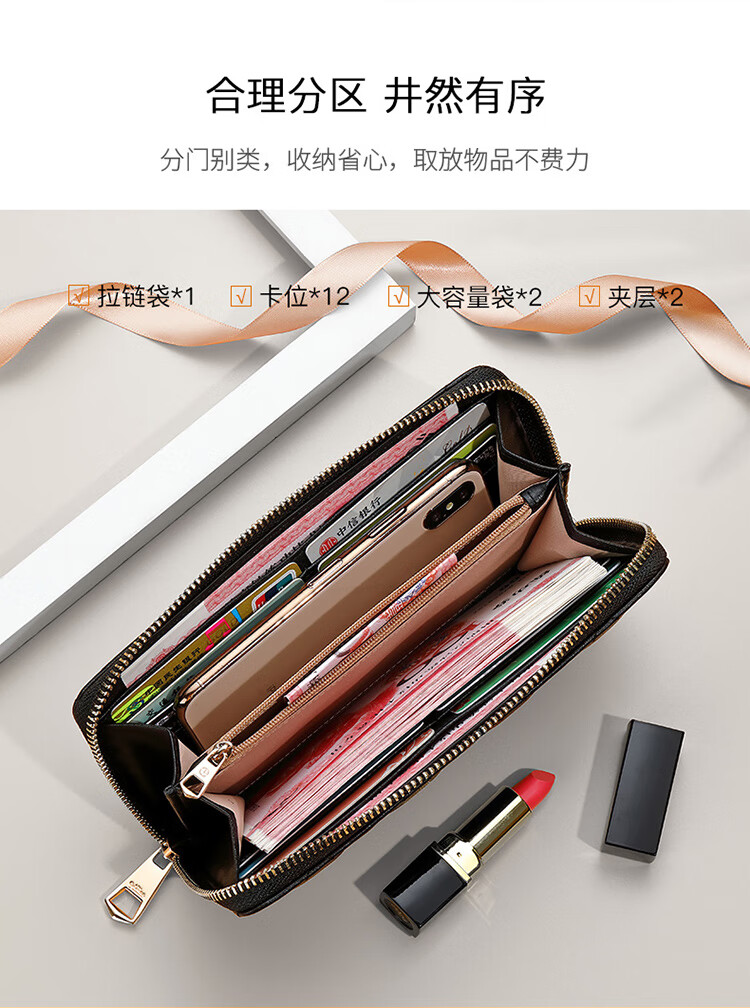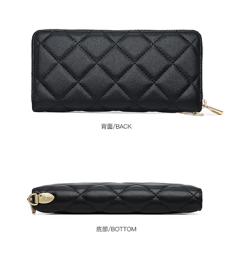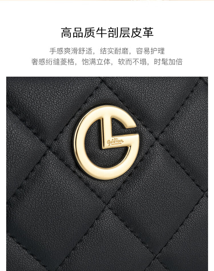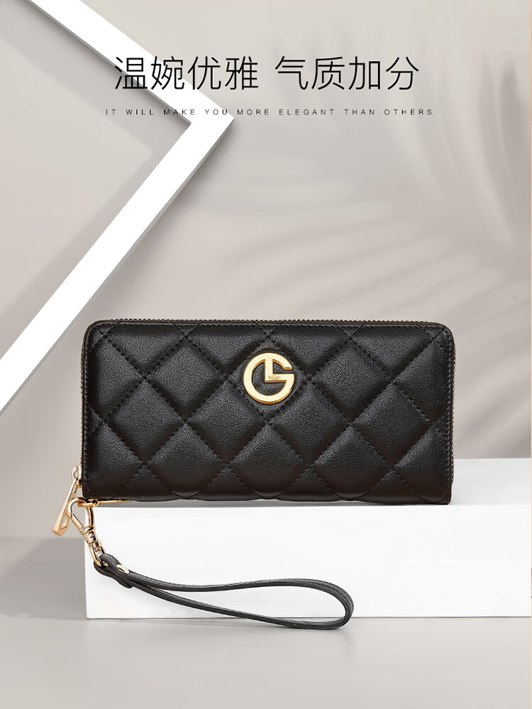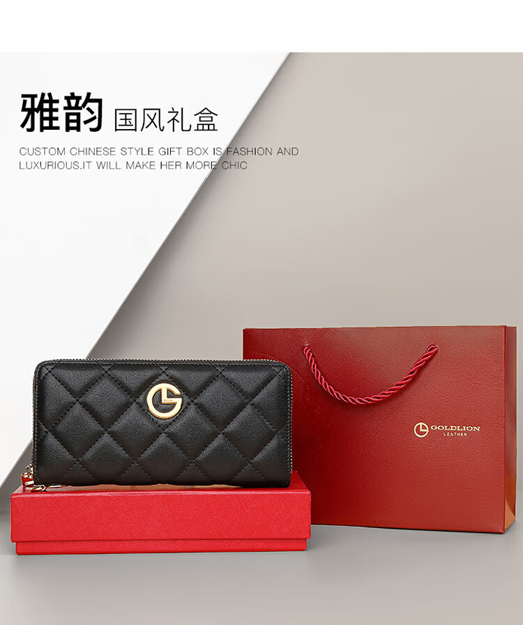 Goldlion long wallet for women 2025 new style cowhide clutch bag small fragrant rhombus wallet multi-card slot wallet trendy black.