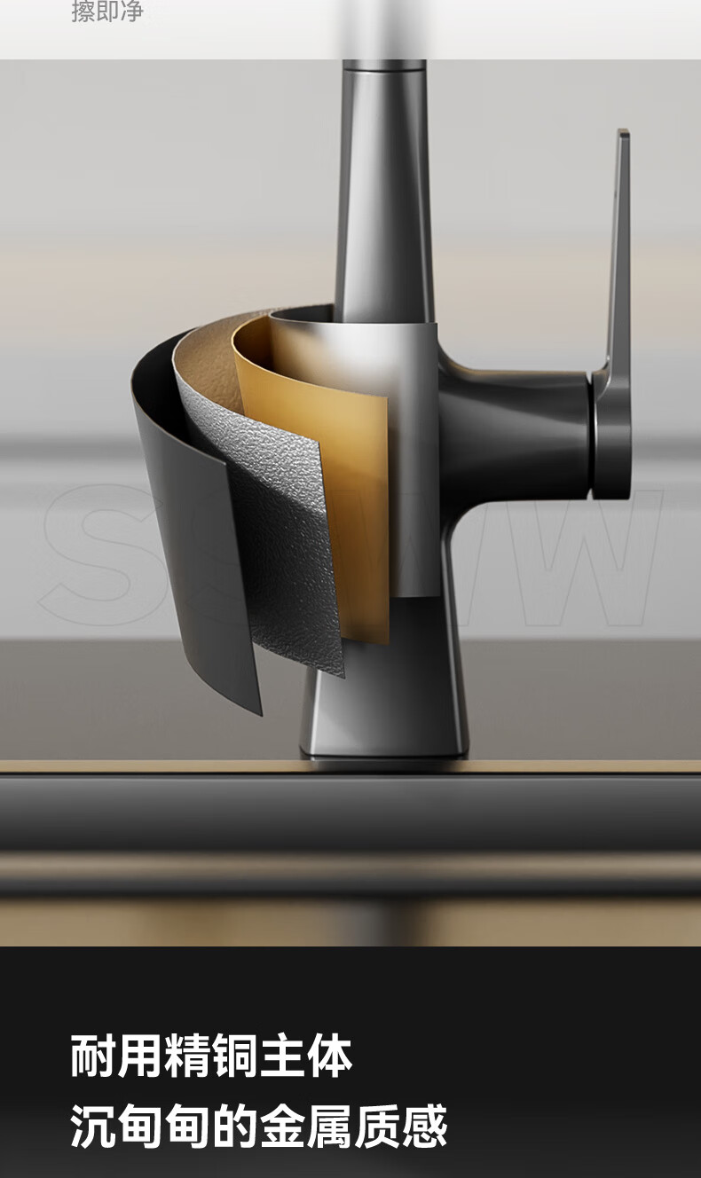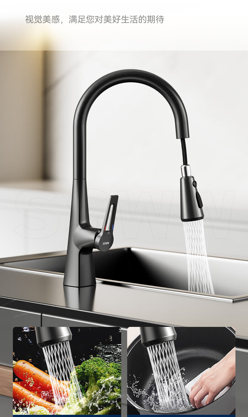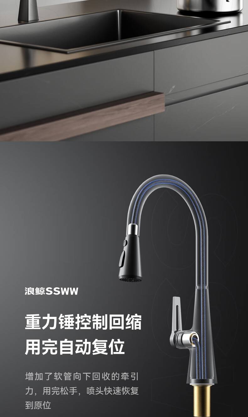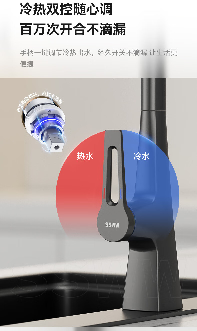 SSWW three-function kitchen pull-out faucet 360, rotating hot and cold dual controls, fine copper body kitchen sink faucet, Feitian series, fine copper hot and cold pull-out - silver