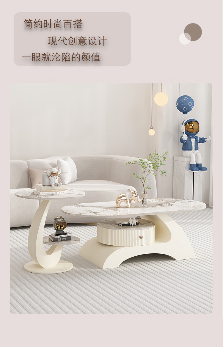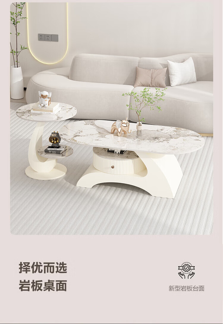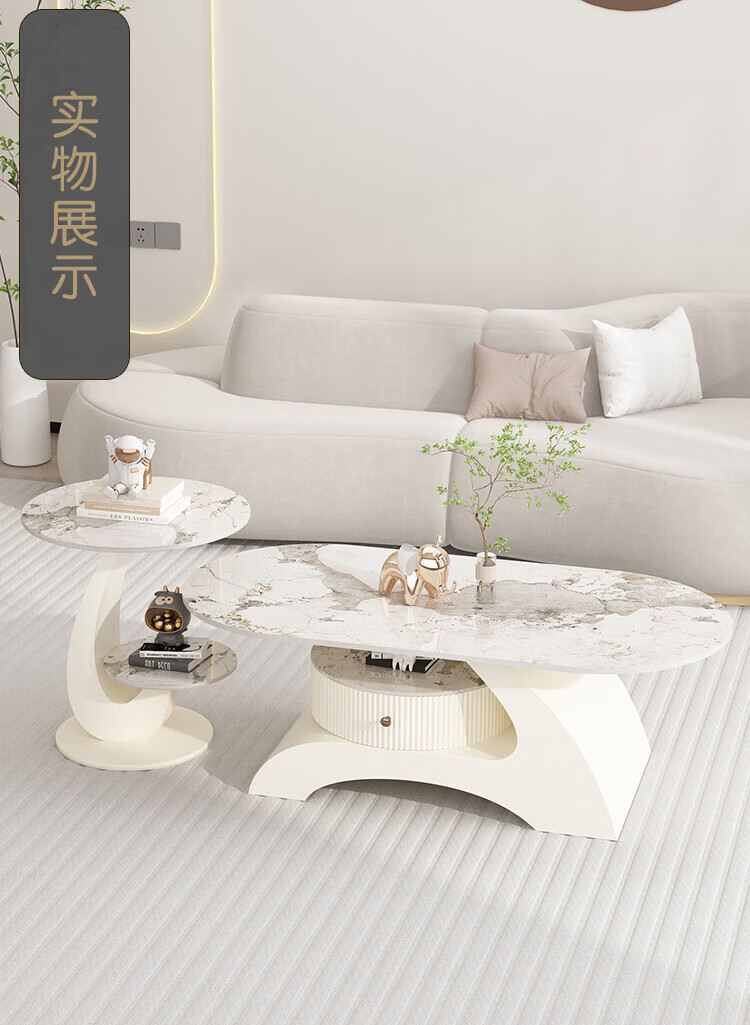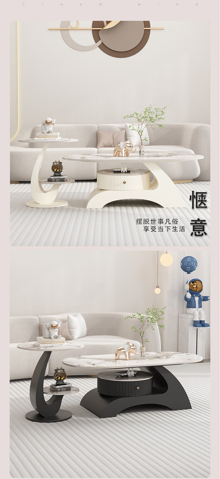 Champs Ruijing cream style slate coffee table for living room 2026 new style light luxury high-end home modern simple creative tea table off-white base + snow mountain white slate + side table 50CM length 130CM width 70CM height 45CM