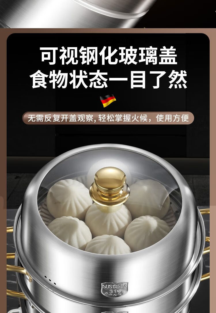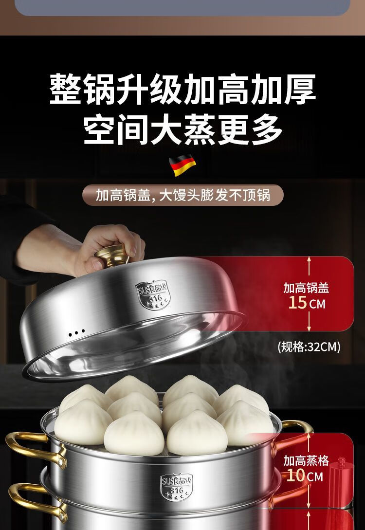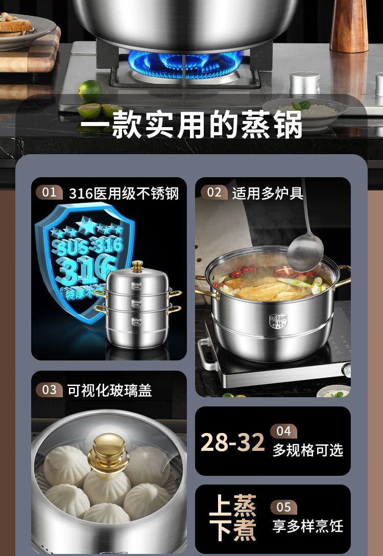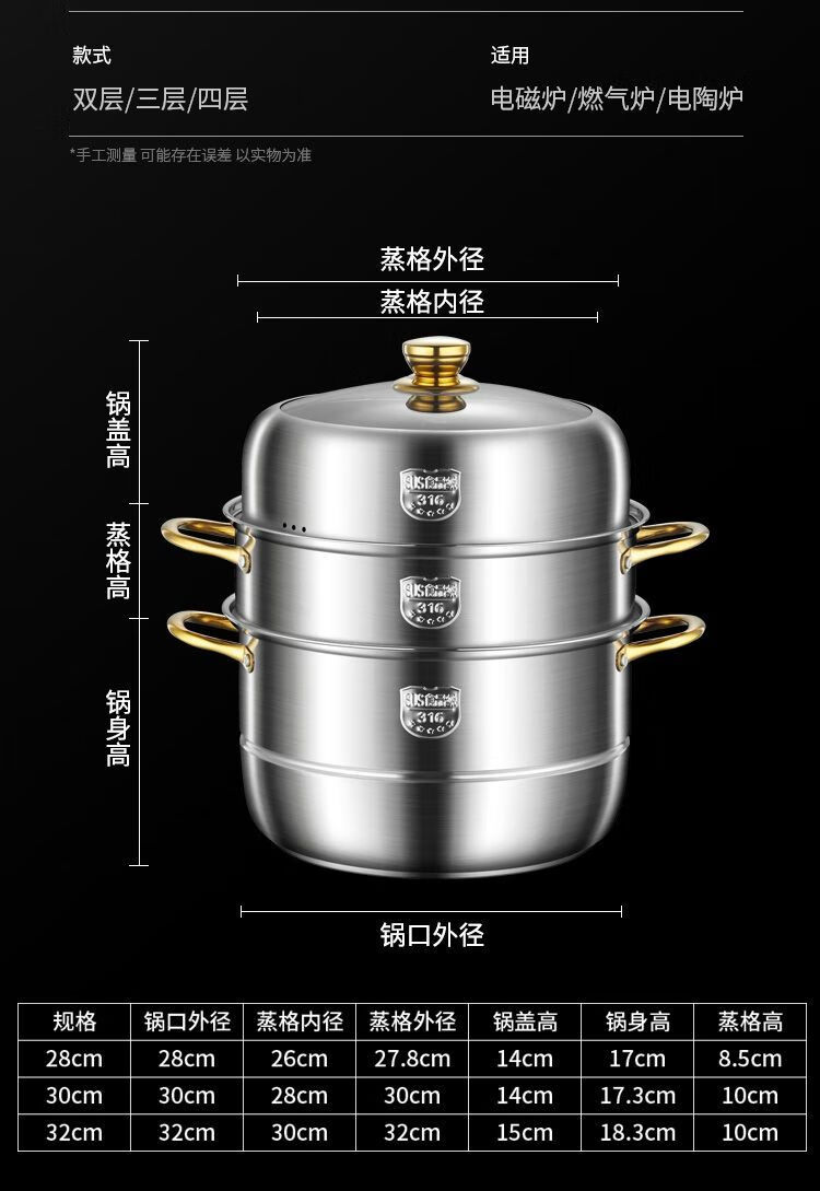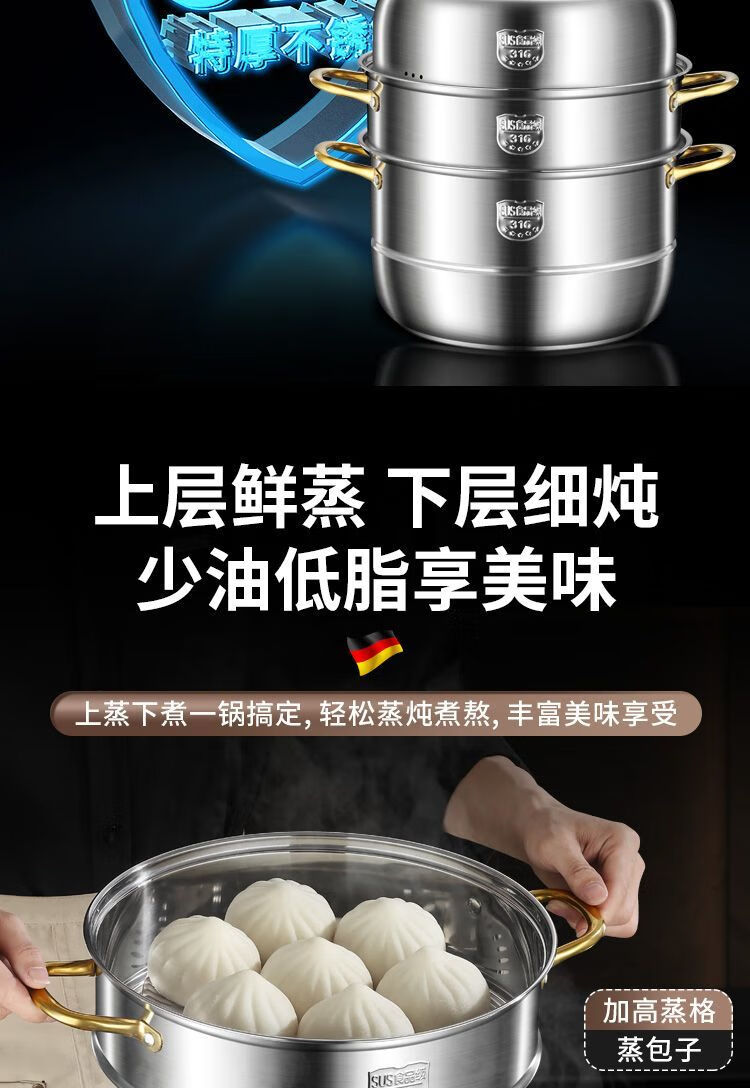 Chinuo steamer 316 thickened food-grade stainless steel household double-layer three-layer steamed bun pot gas stove induction cooker universal 316 stainless steel golden ear steamer 0cm extra thick 34cm two layers
