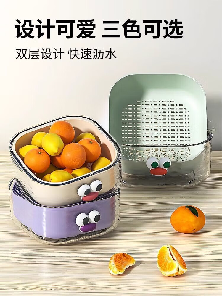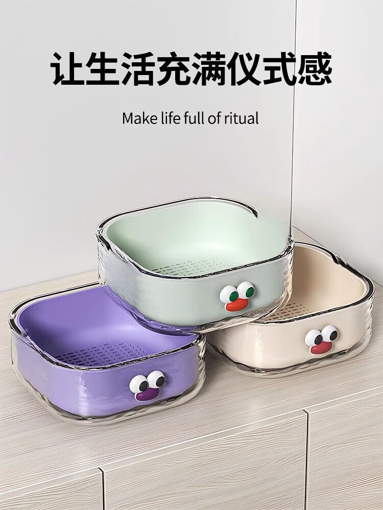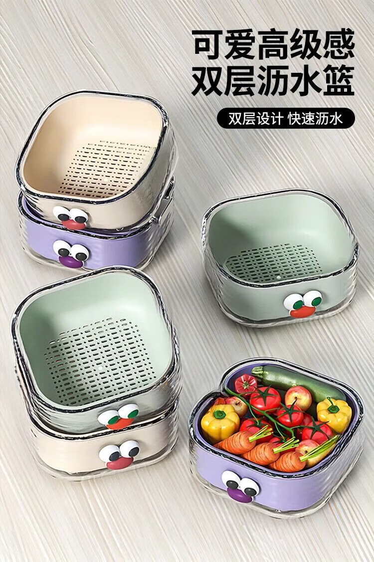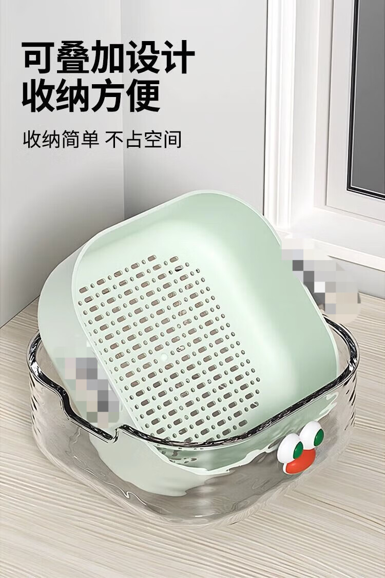 Qianke Kitchen Living Room Double-layer Plastic Drainage Basket Fruit Plate pp Simple Household Rice Basin Mint Green Small Double-layer Drainage 2-piece Set