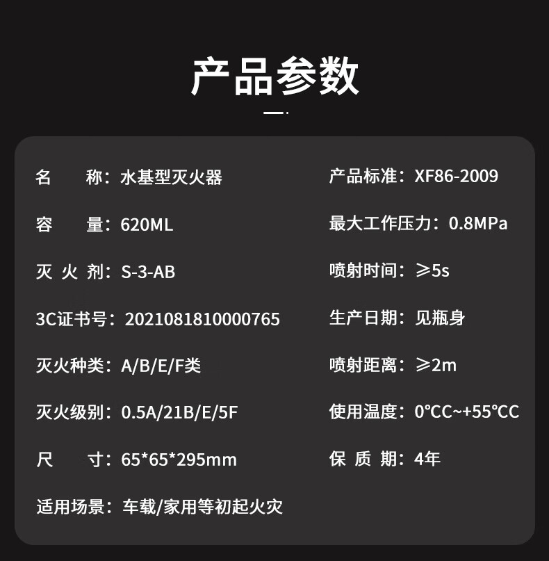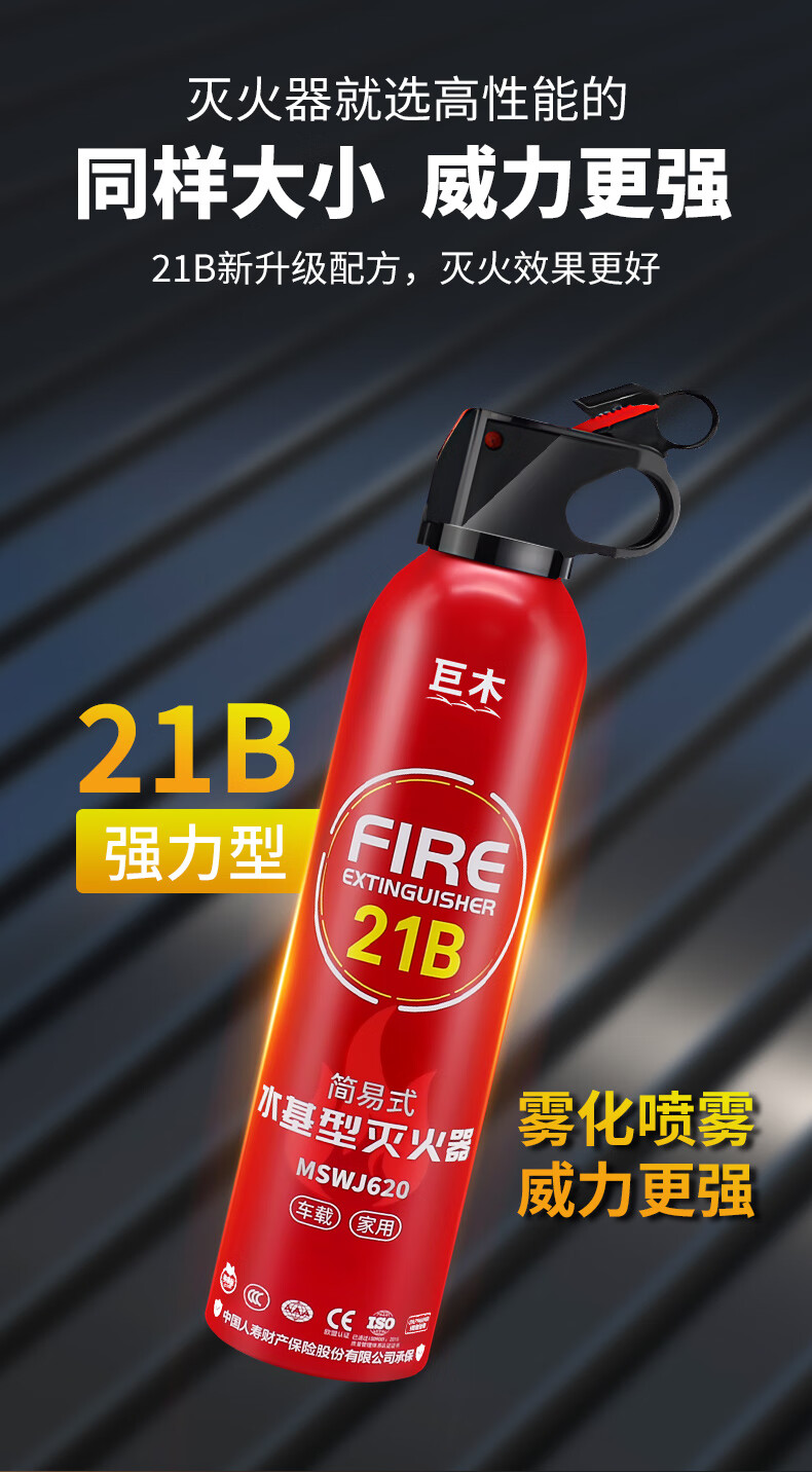Jumu fire extinguisher vehicle-mounted water-based water extinguisher new energy vehicle private car lithium battery small water machine type fire extinguisher bottle 620ml water-based 21B water-based fire extinguisher one bottle household fire extinguishing equipment set fire extinguisher