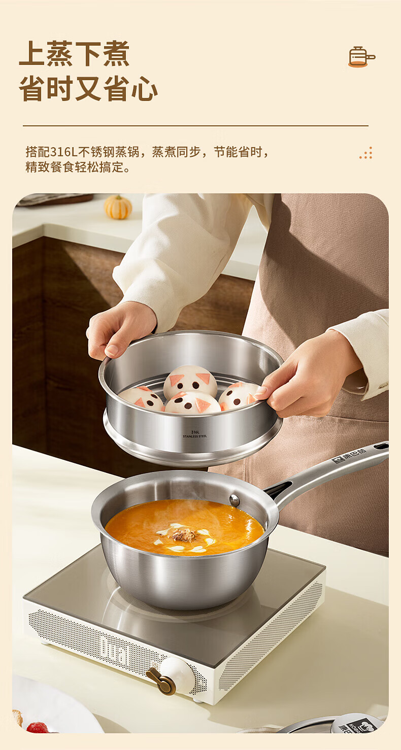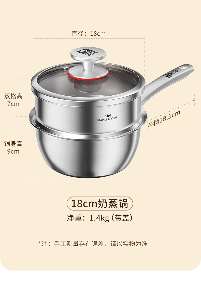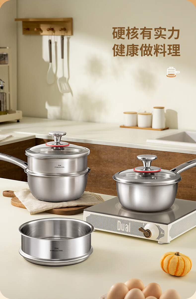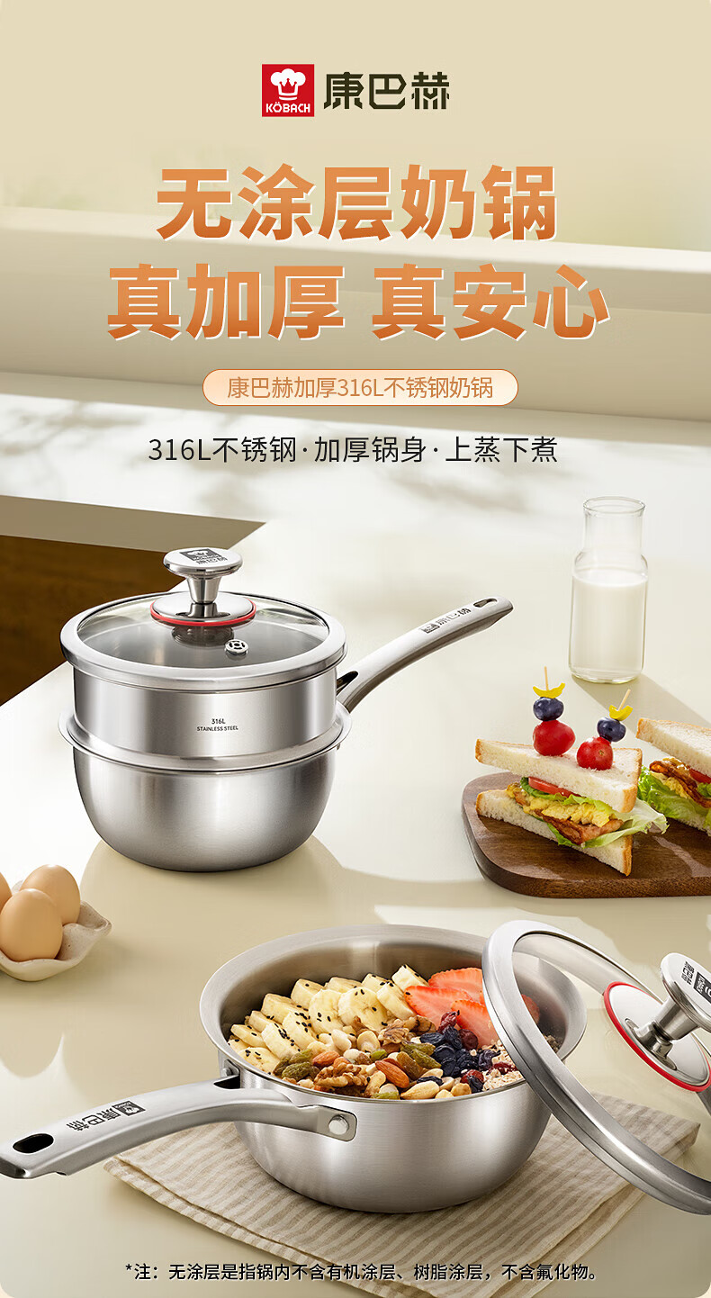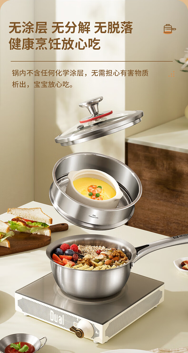 Konbach uncoated milk pot and food supplement pot 316L stainless steel baby baby cooking all-in-one stainless steel small milk pot and noodle pot 316L thickened body milk pot + steamer 18cm
