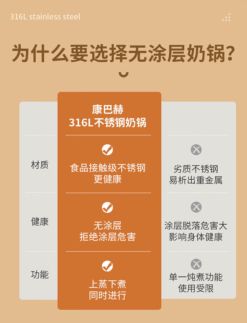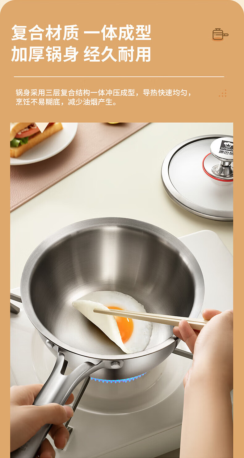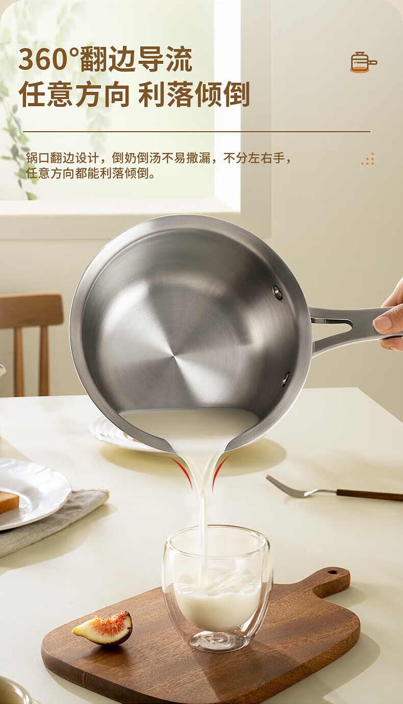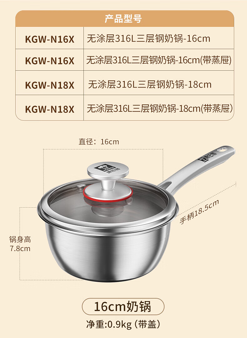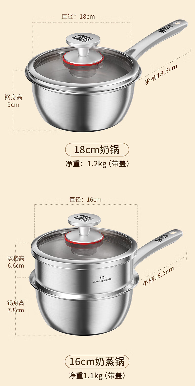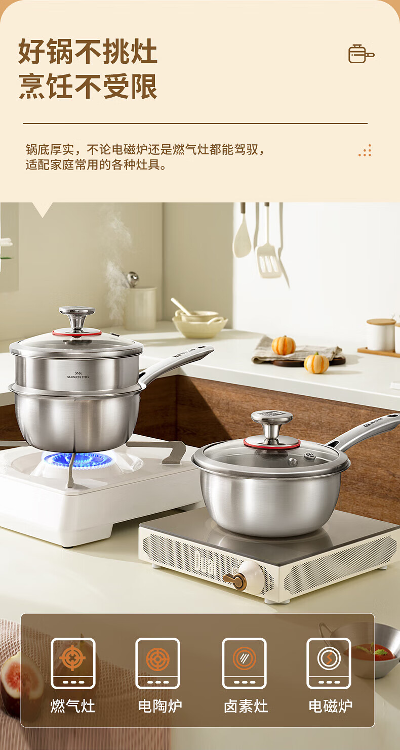 Konbach uncoated milk pot and food supplement pot 316L stainless steel baby baby cooking all-in-one stainless steel small milk pot and noodle pot 316L thickened body milk pot + steamer 18cm