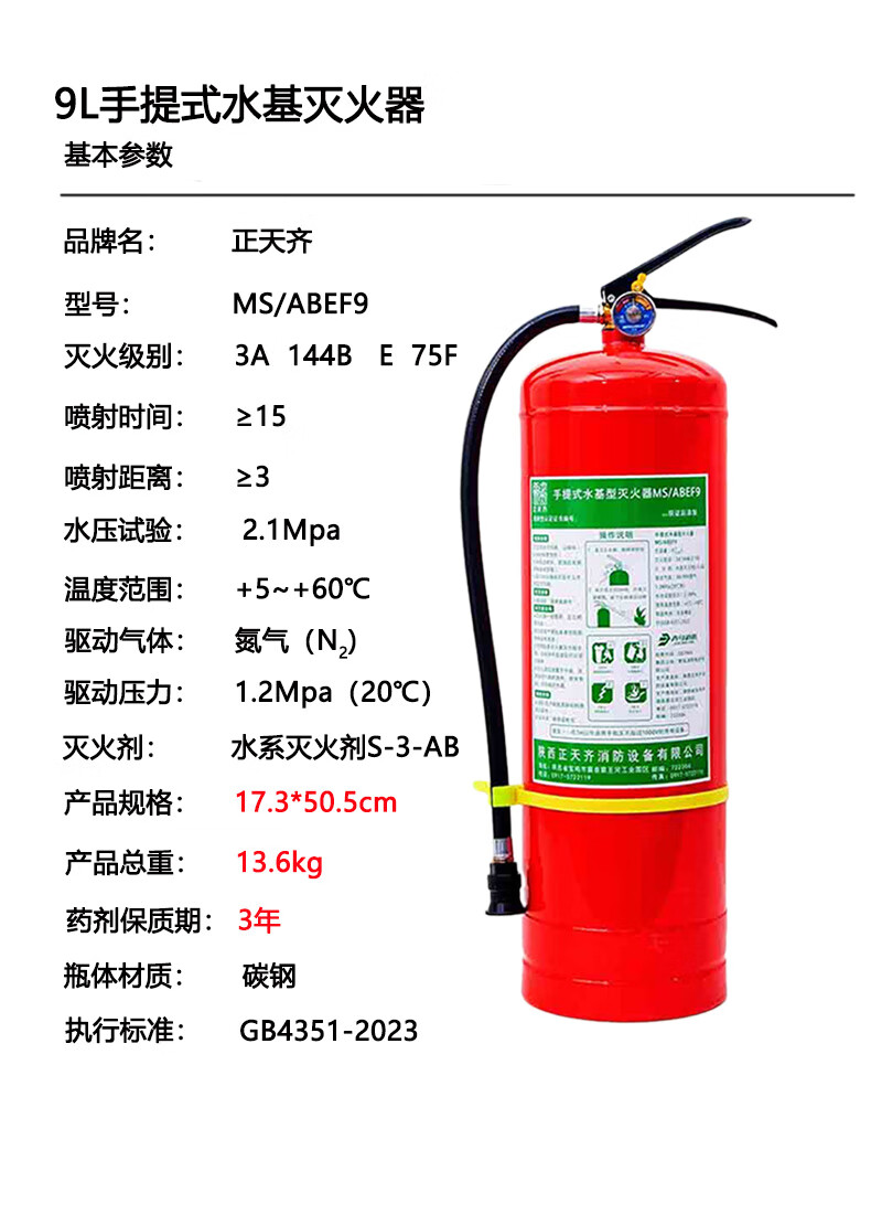 Zhengtianqi portable water-based fire extinguisher portable small 9L vehicle household fire 3C certified equipment MS/ABEF9