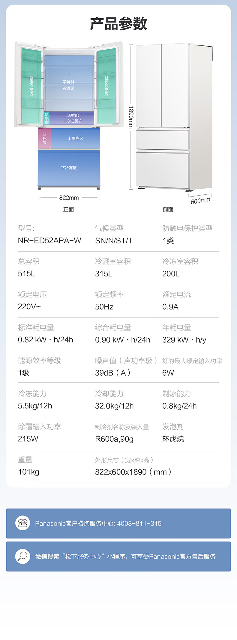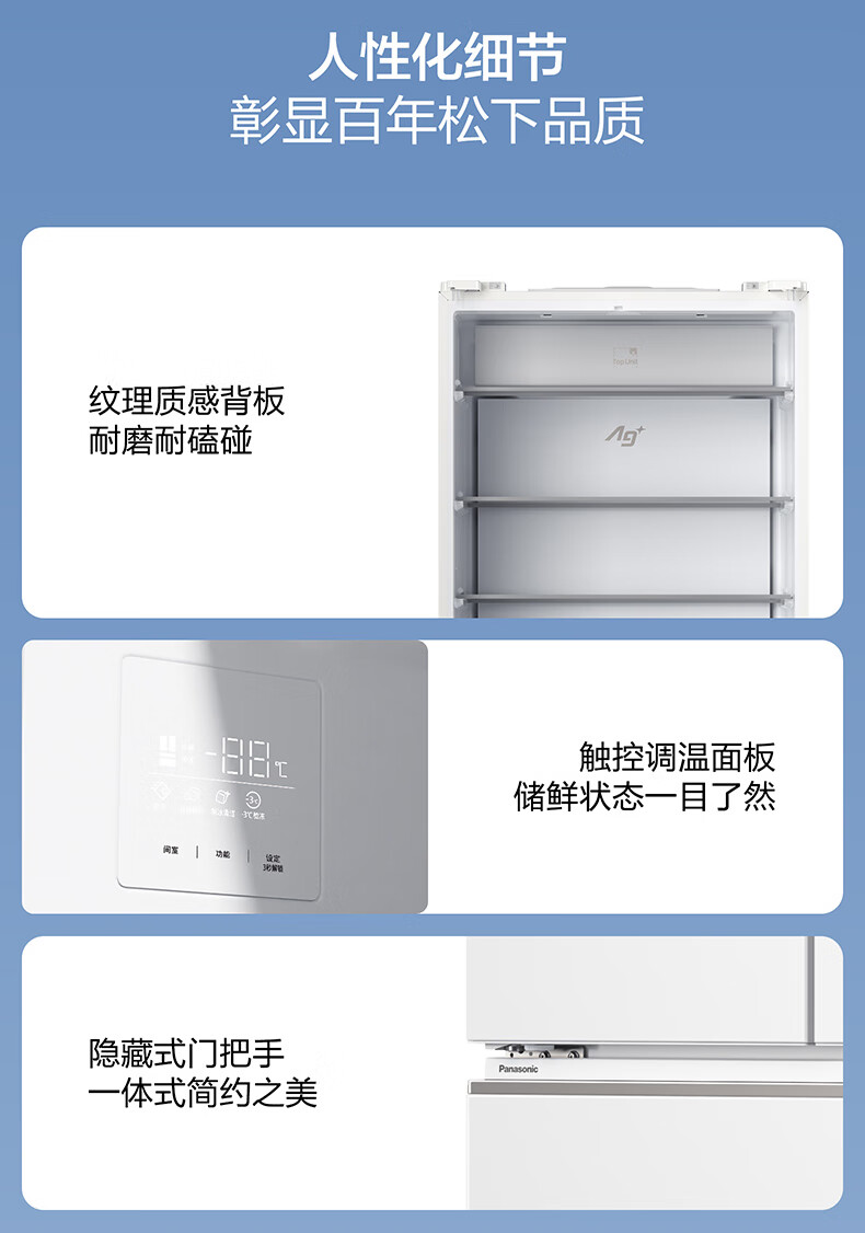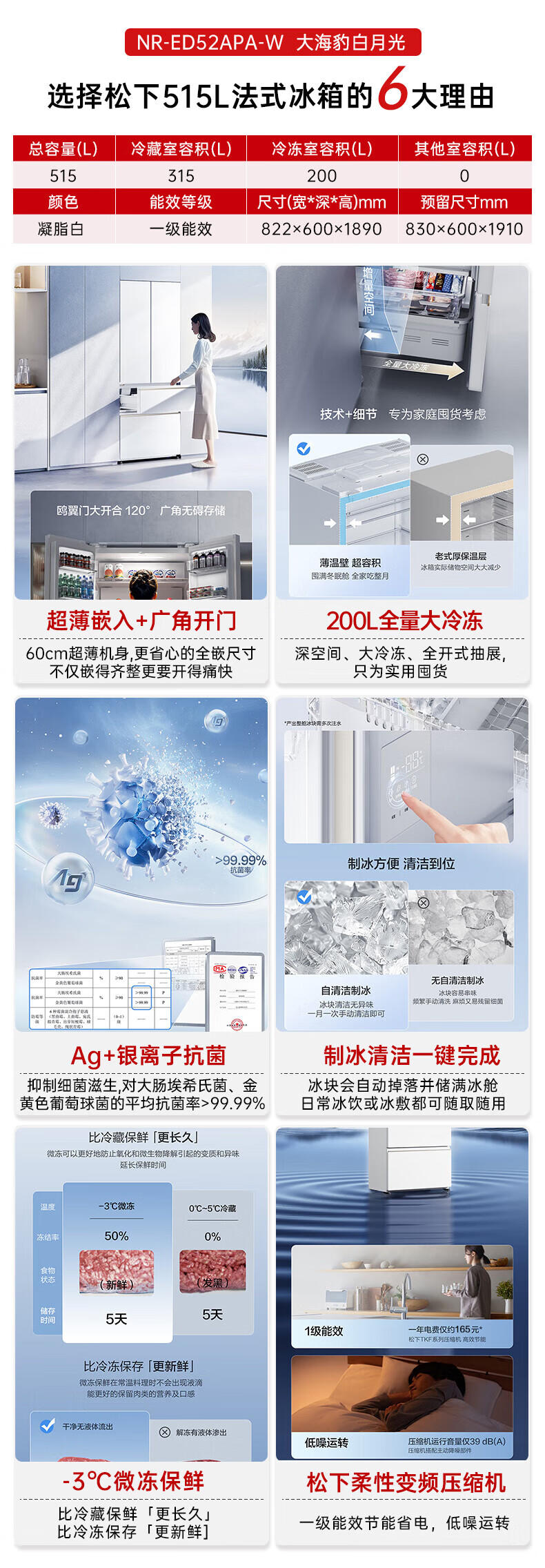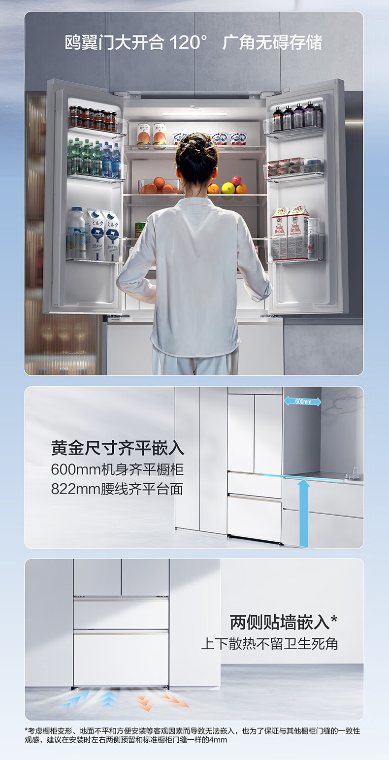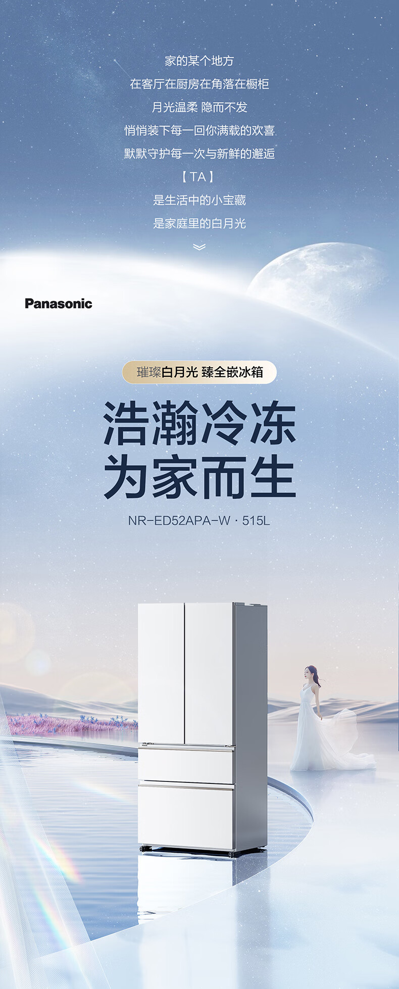 Panasonic 515L French-style multi-door four-door refrigerator 60CM depth ultra-thin zero-embedded automatic ice making dual circulation air duct first-class energy-efficiency large freezer NR-ED52APA-W White Moonlight