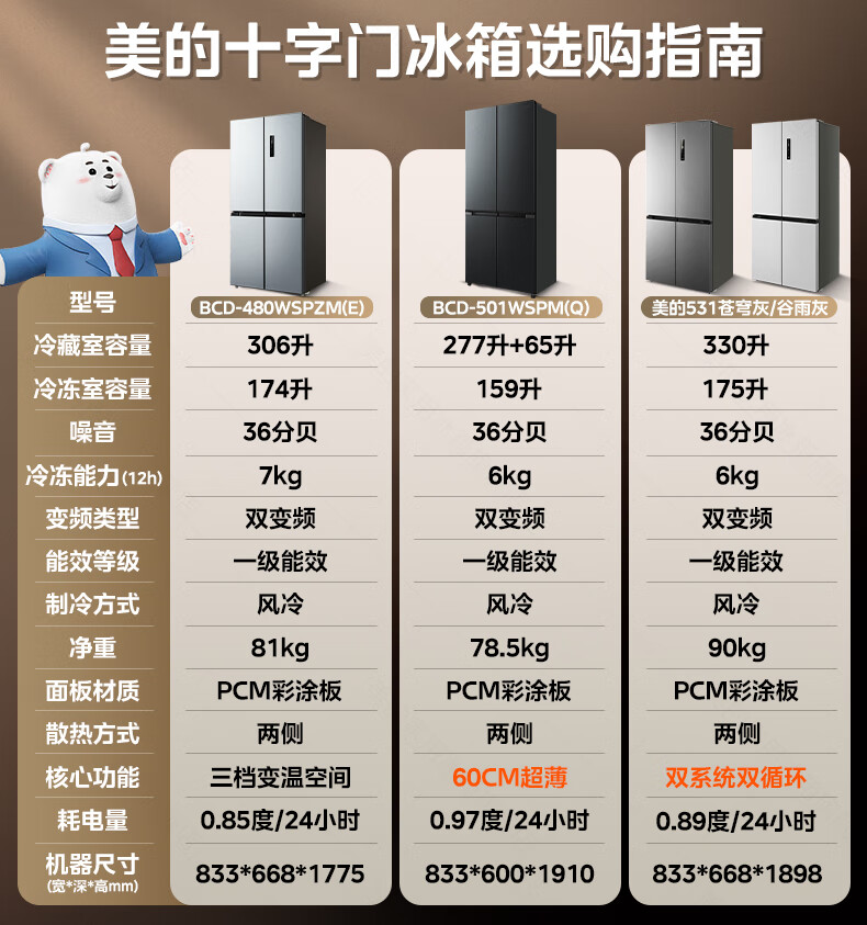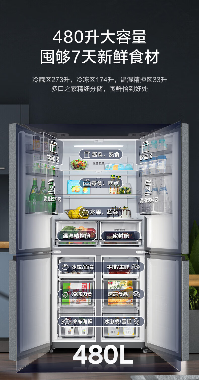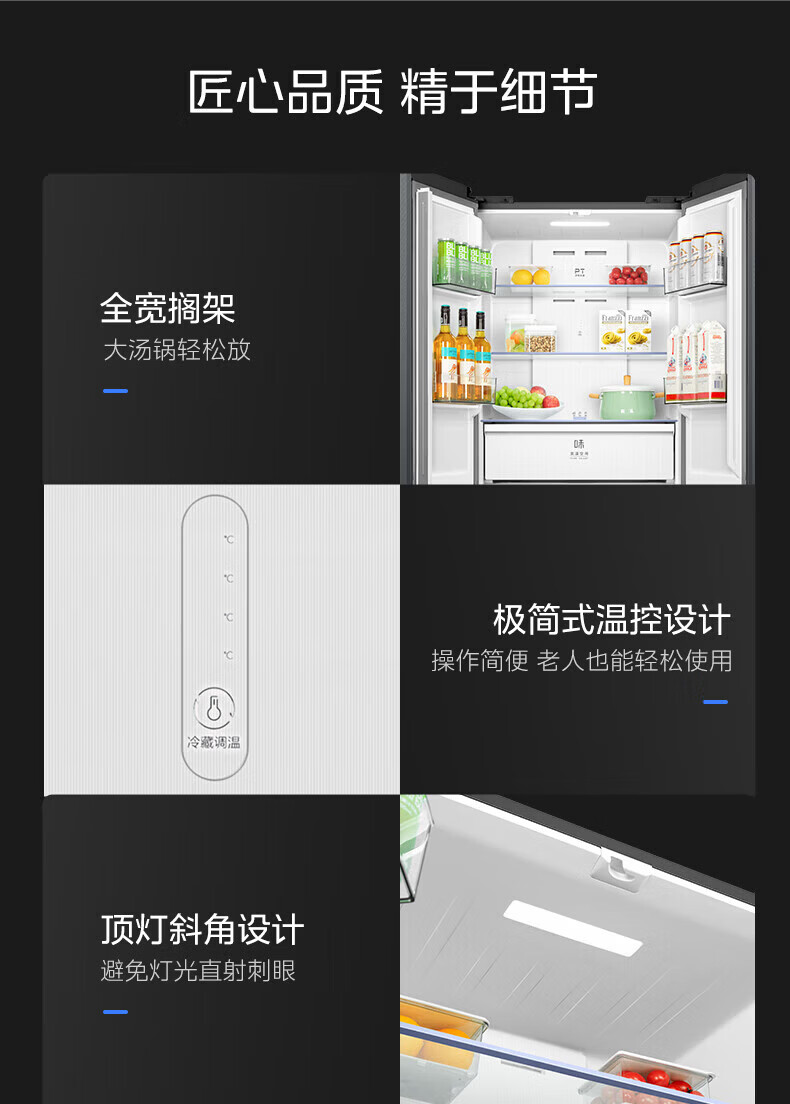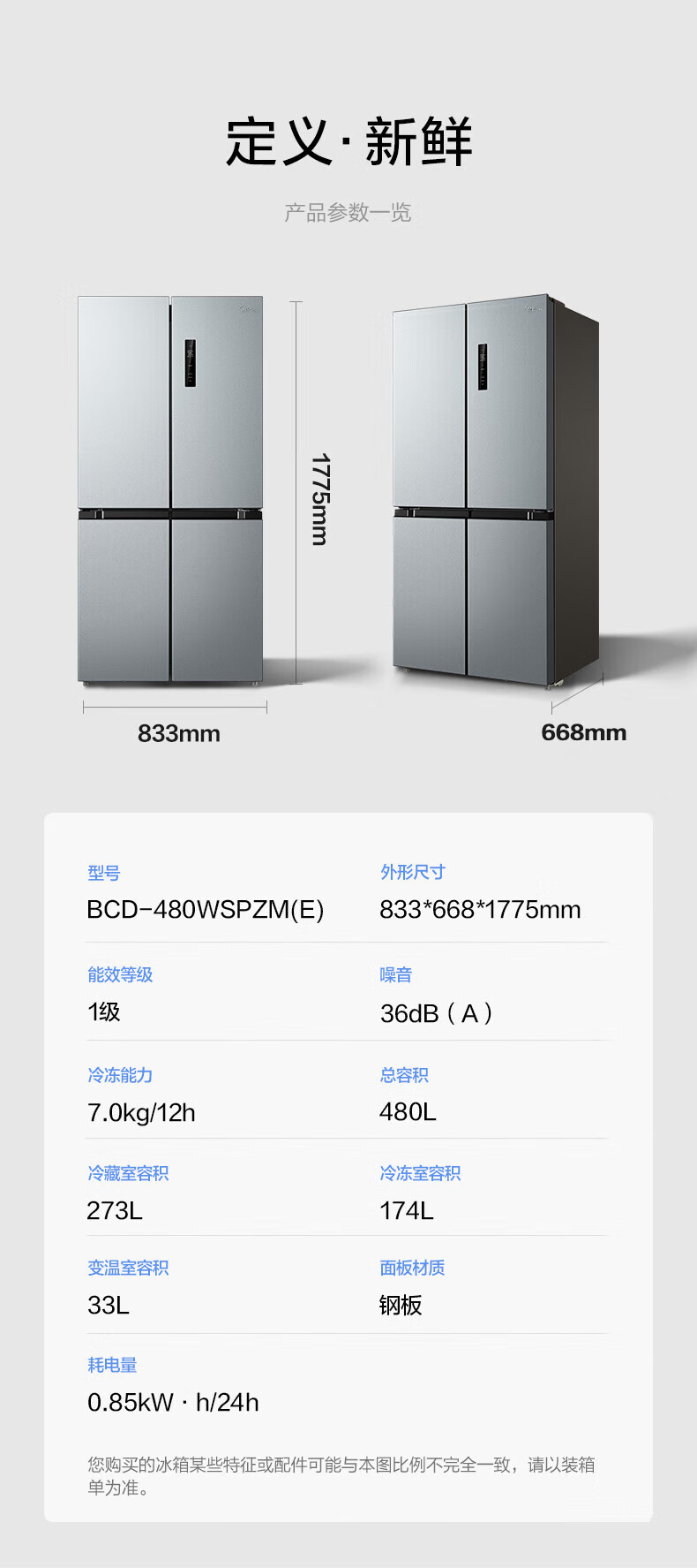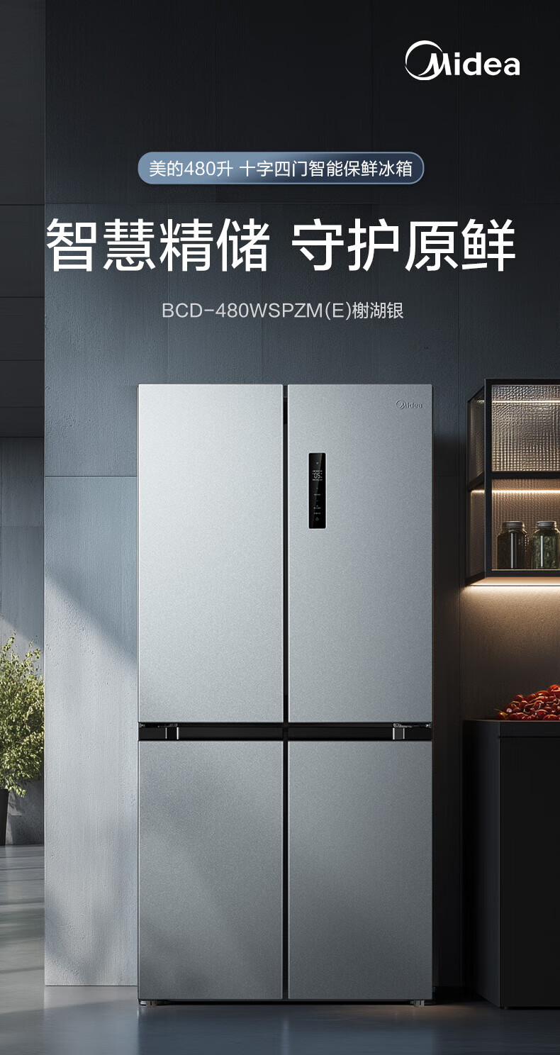Midea refrigerator double-door four-door first-level energy efficiency double frequency conversion cross-door household refrigerator dual-cycle air-cooled frost-free large capacity 480wifi intelligent control/531/501 first-level energy efficiency 480L-480WSPZM(E)