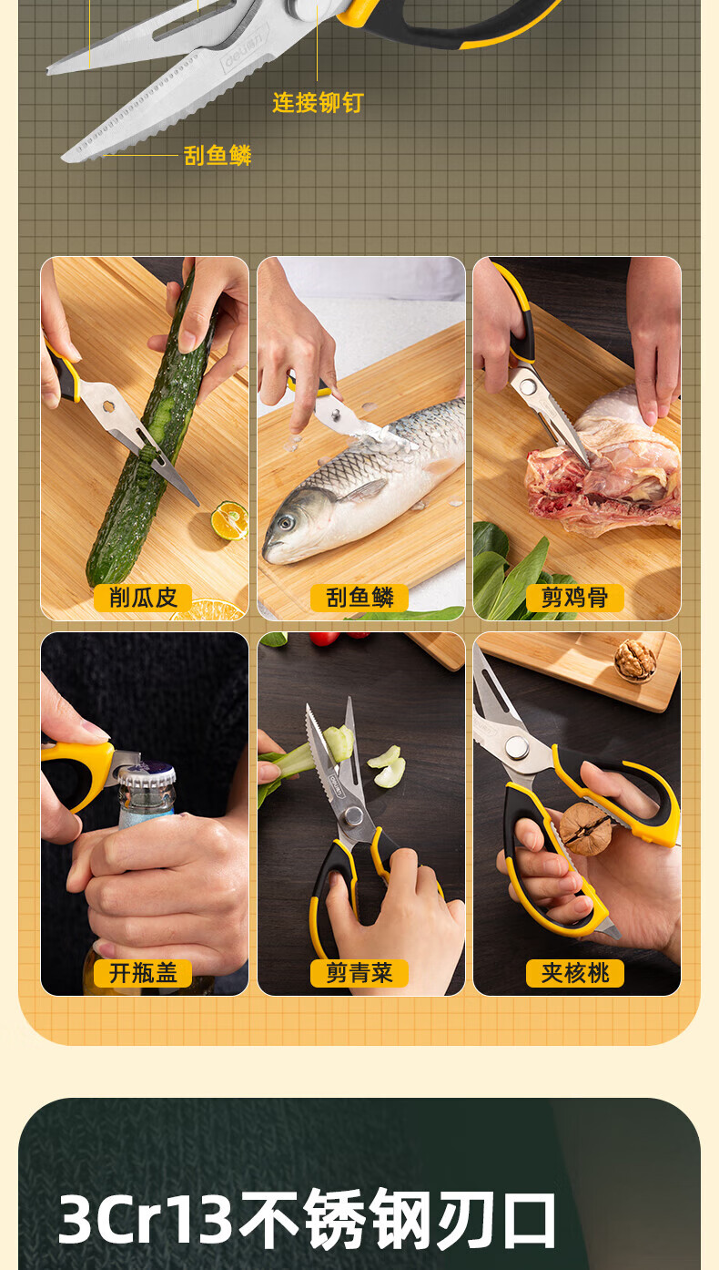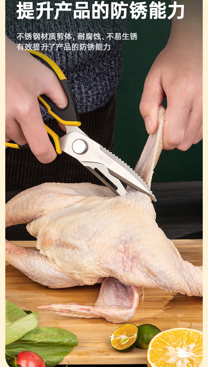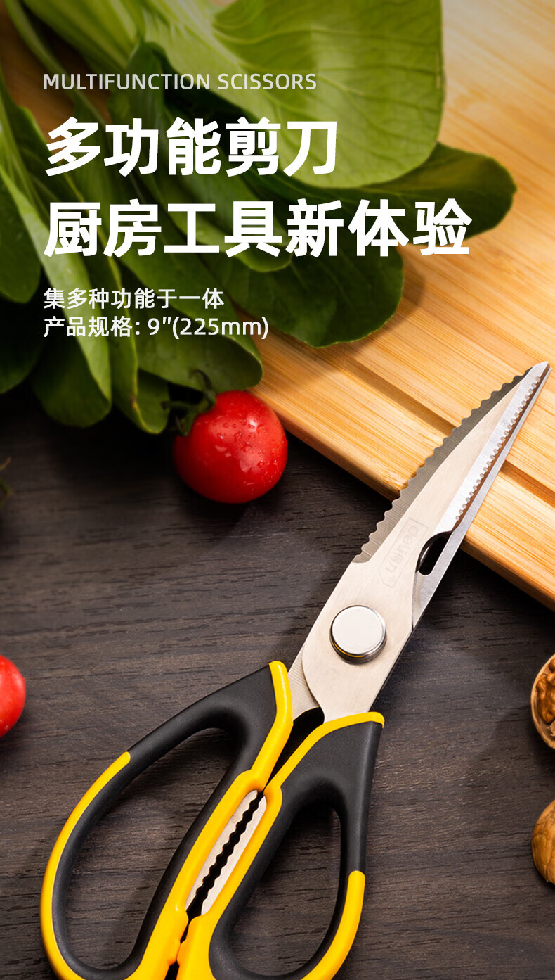Deli multifunctional kitchen scissors for household use, special for cutting vegetables, barbecue, chicken and duck bones, large stainless steel powerful scissors, multifunctional scissors 225mm DL358019