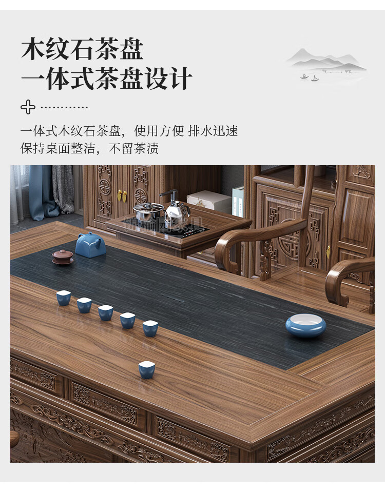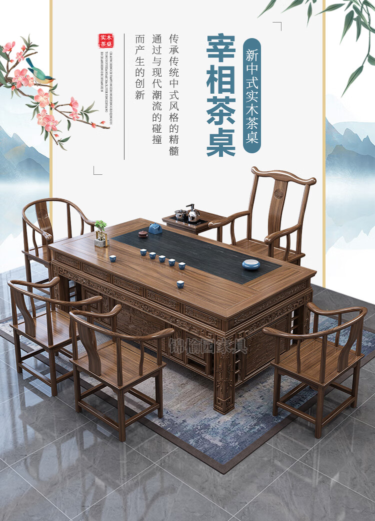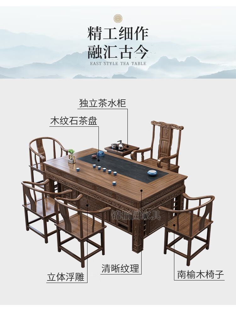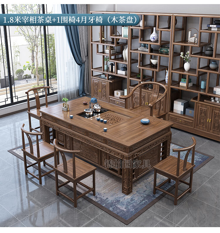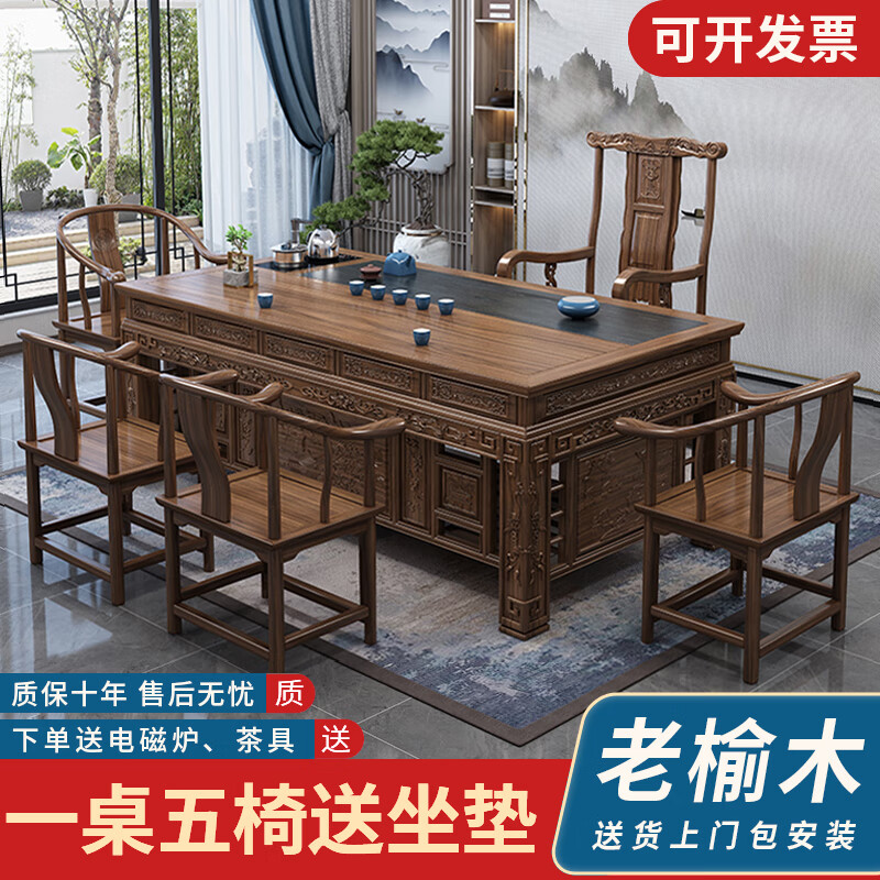 Jinyuyuan old elm solid wood tea table and chair combination office home tea table integrated modern simple Kung Fu Zen tea table 1.8 meters tea table + 1 armchair + 4 crescent chairs / wooden tea tray