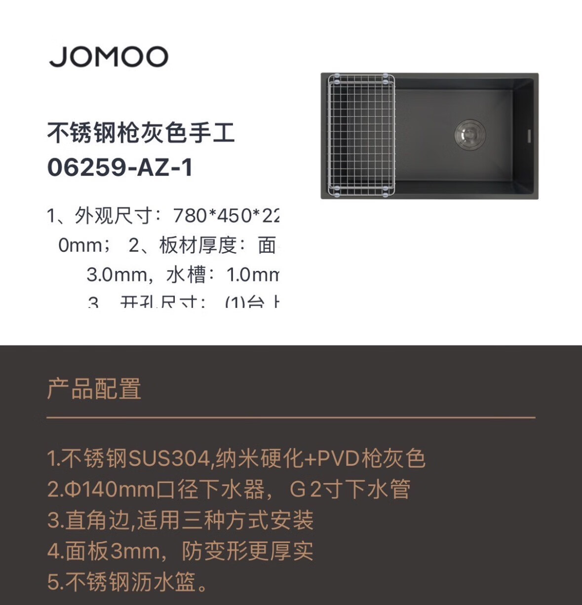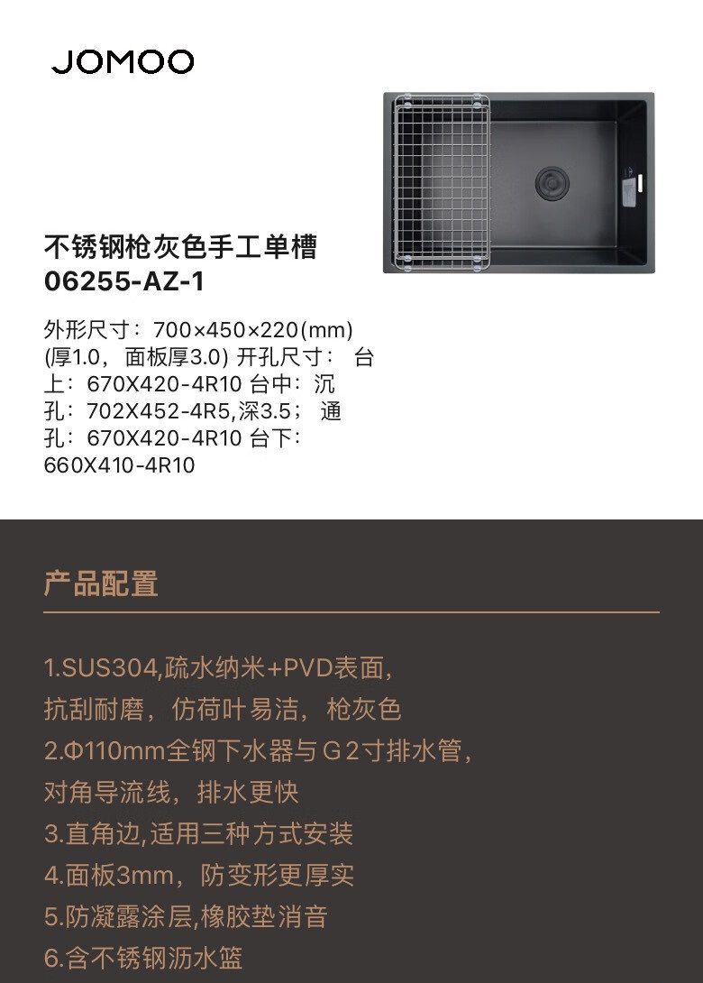 JOMOO 06255 sink vegetable basin 06259 kitchen household stainless steel handmade sink large single sink dishwashing basin 06259-CZ-1 nano color size 780x45