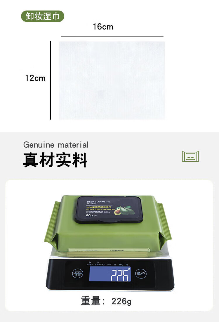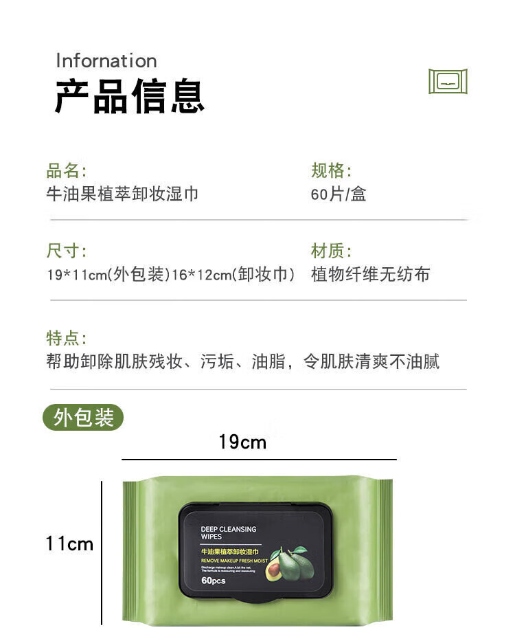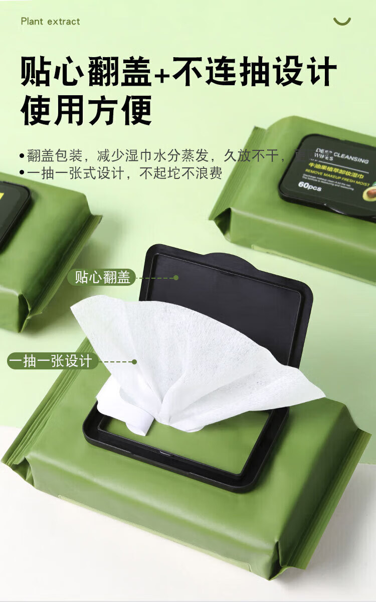 Avocado plant extract makeup remover wipes, gentle and non-irritating, deep cleansing disposable makeup remover wipes for the face, 2 packs, 120 pieces