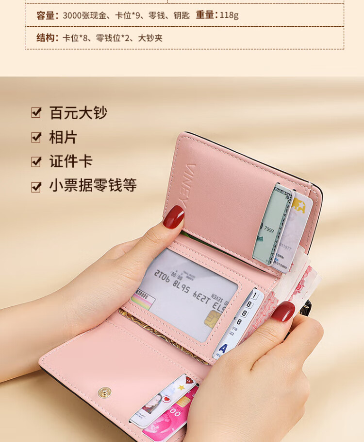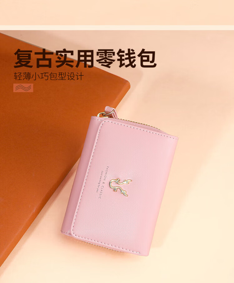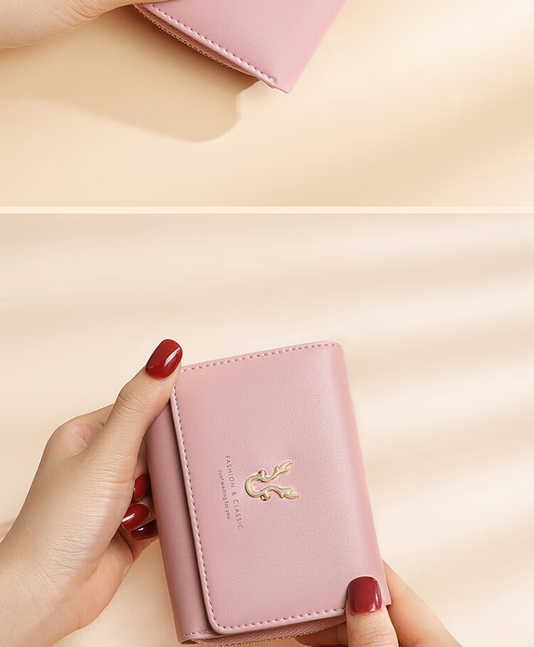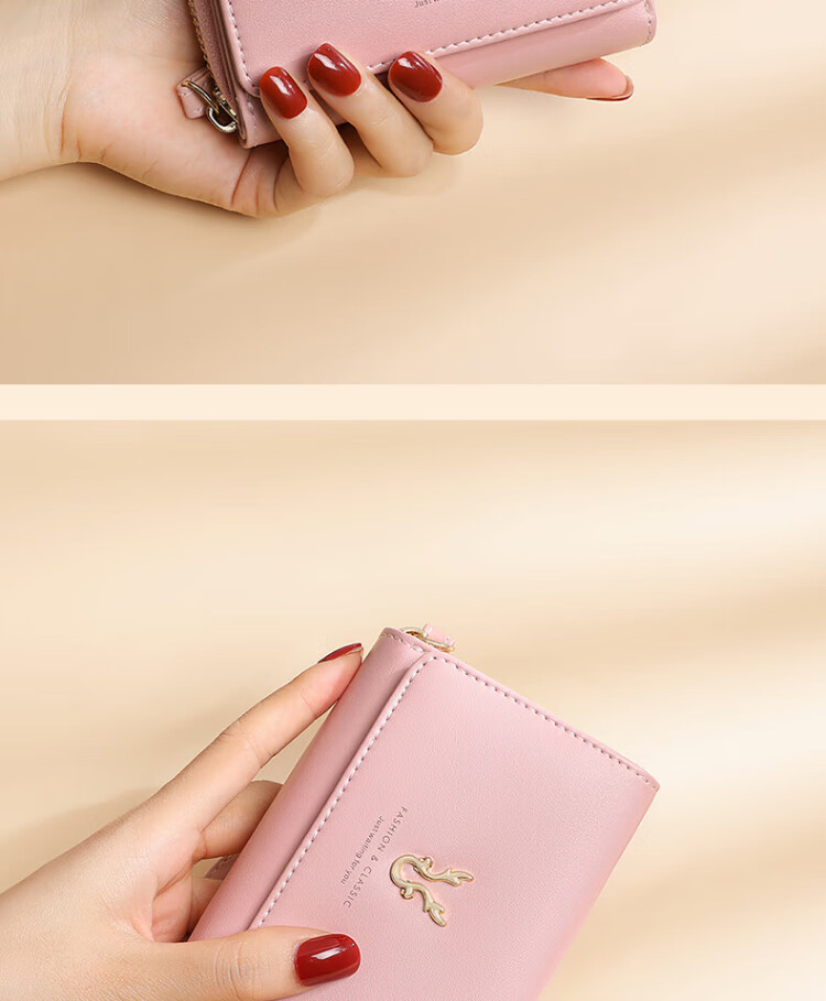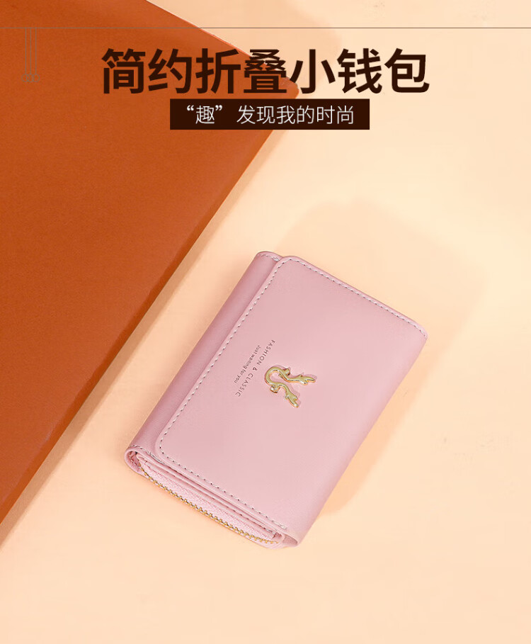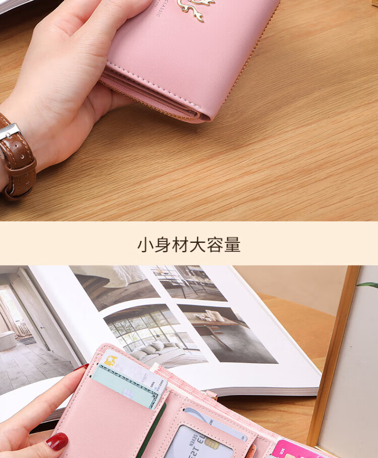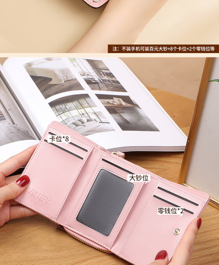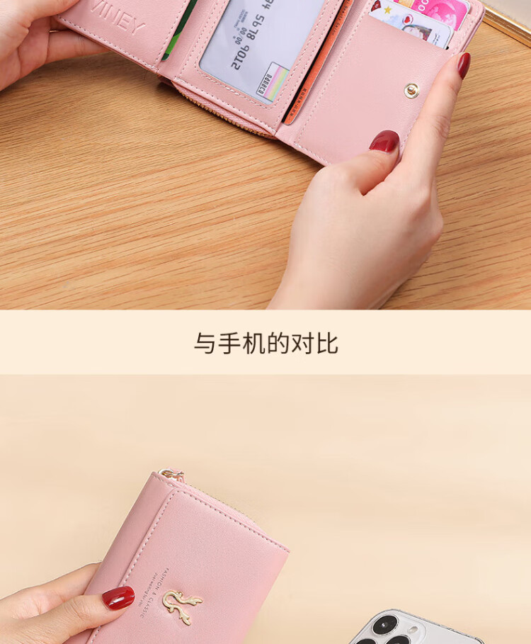 Viney cowhide short wallet female mini zipper coin purse folding wallet multi-card slot large capacity student wallet card bag pink