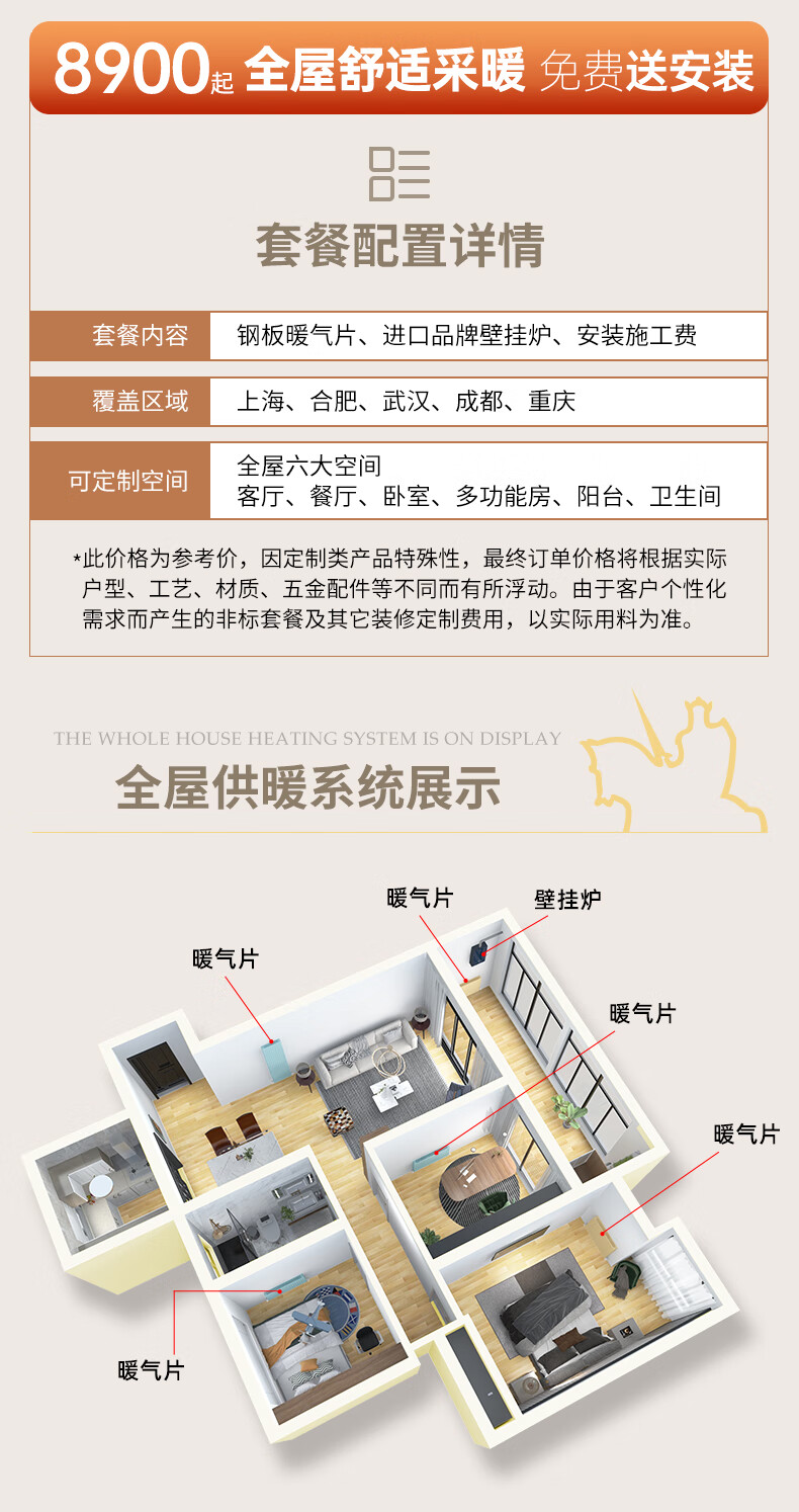 St. Lawrence radiator household natural gas wall-mounted boiler water heating exposed and concealed radiator door-to-door design 2 sets of radiators + 1 imported brand wall-mounted boiler +