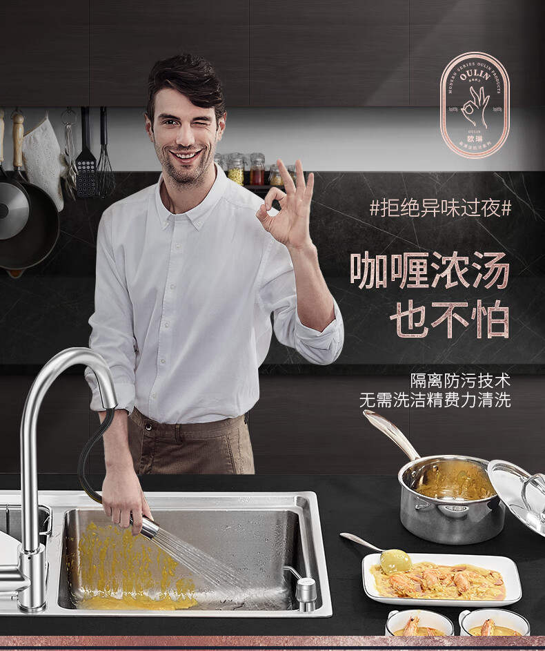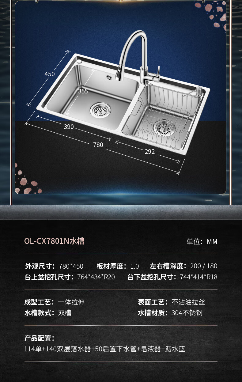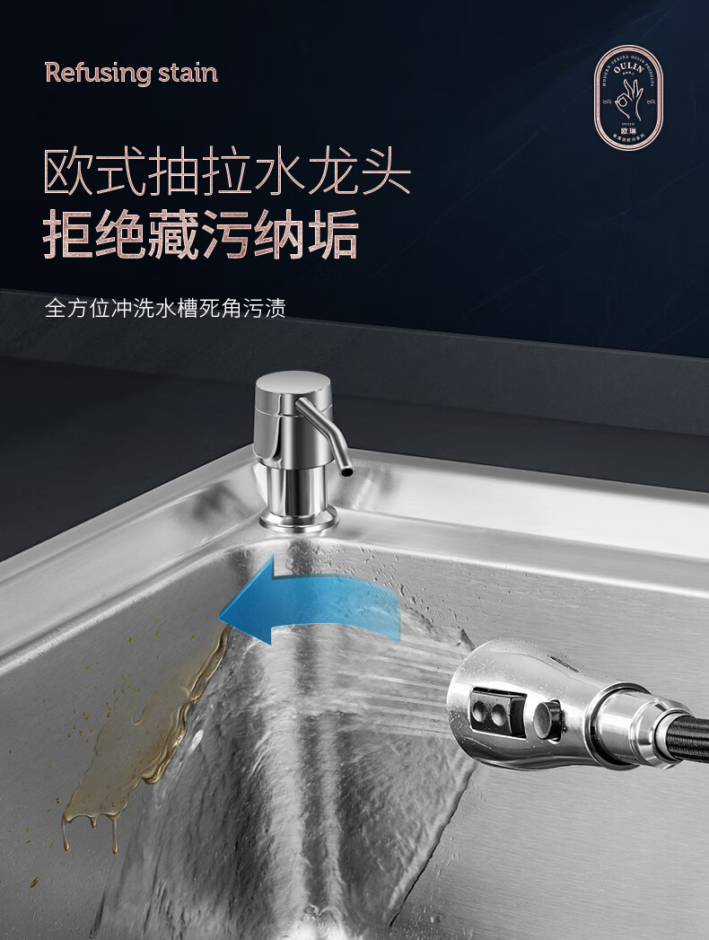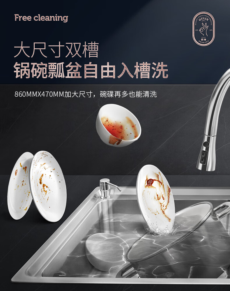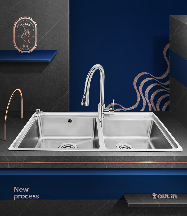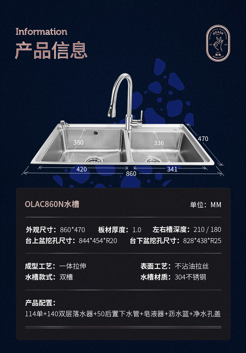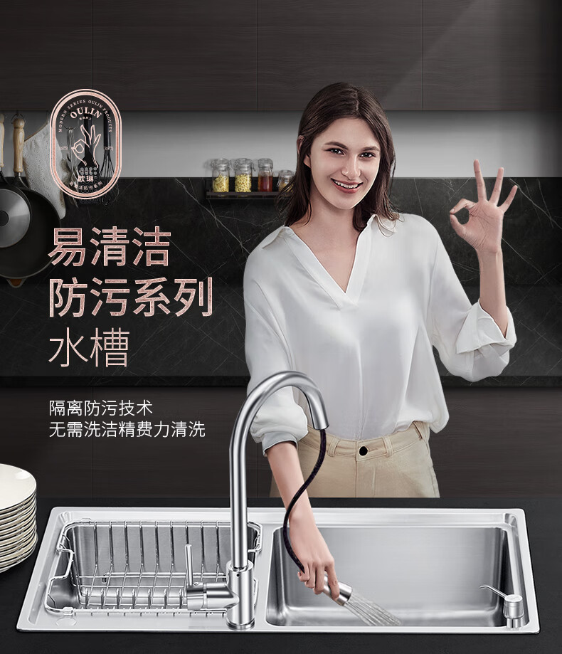 OULIN sink double basin package kitchen sink 304 stainless steel sink double basin thickened J006A / 820A 860x470+CFL101 brass pull-out faucet+drain