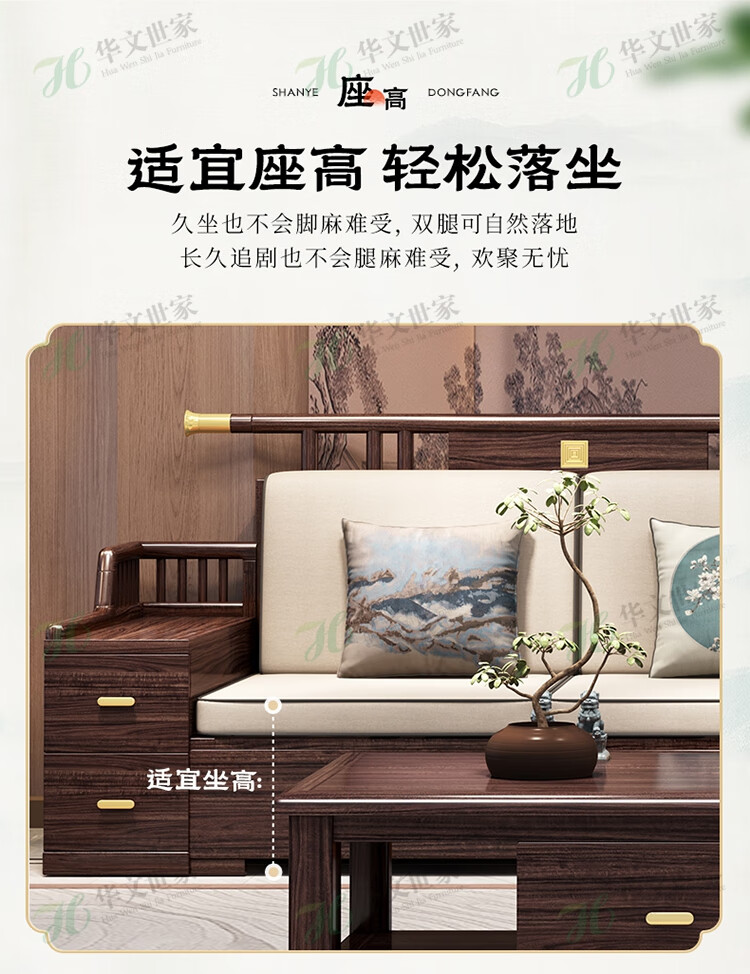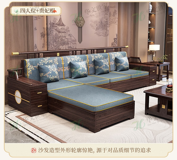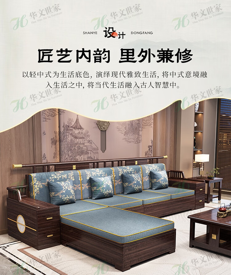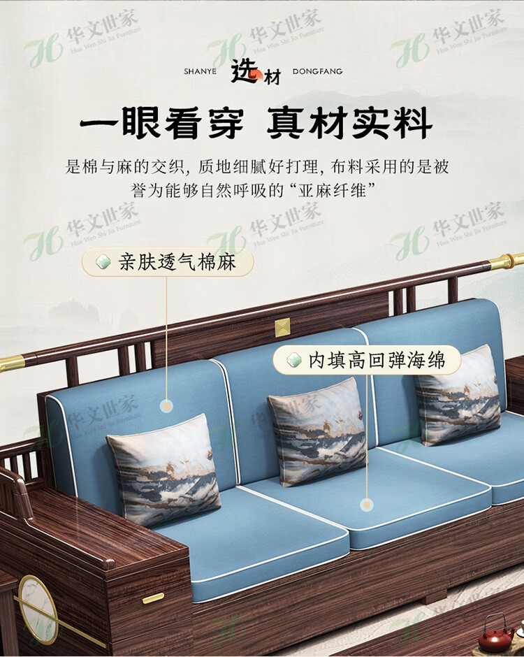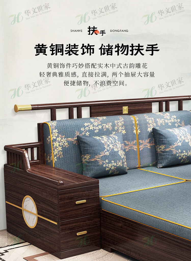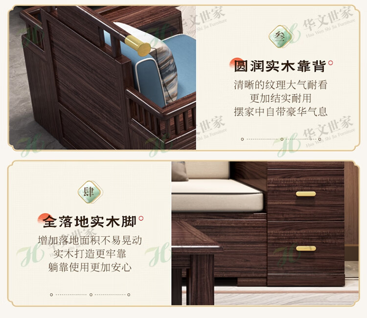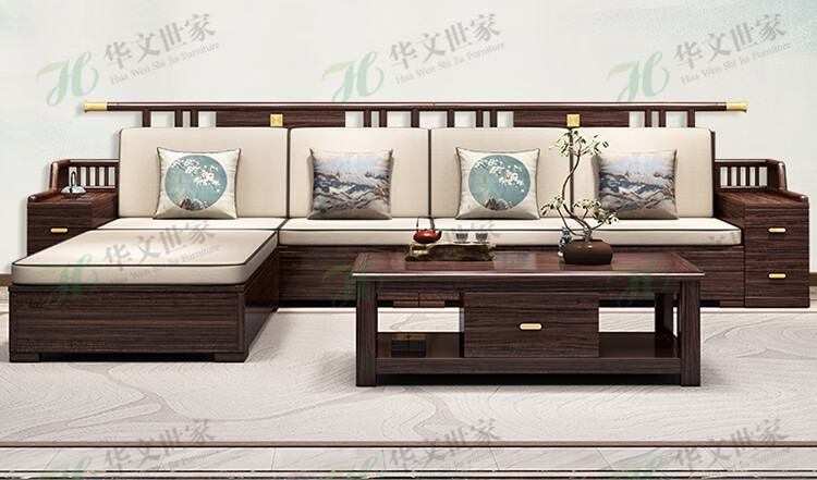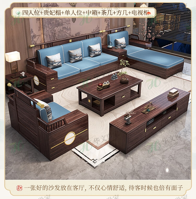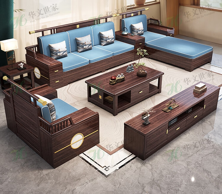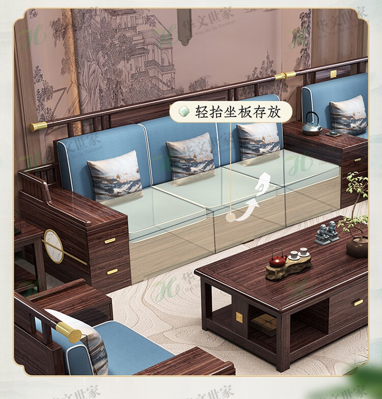 Huiwangfu solid wood sofa New Chinese style ebony wood sofa living room all solid wood modern simple winter and summer storage sofa 1+2+3+long coffee table+square table+TV cabinet