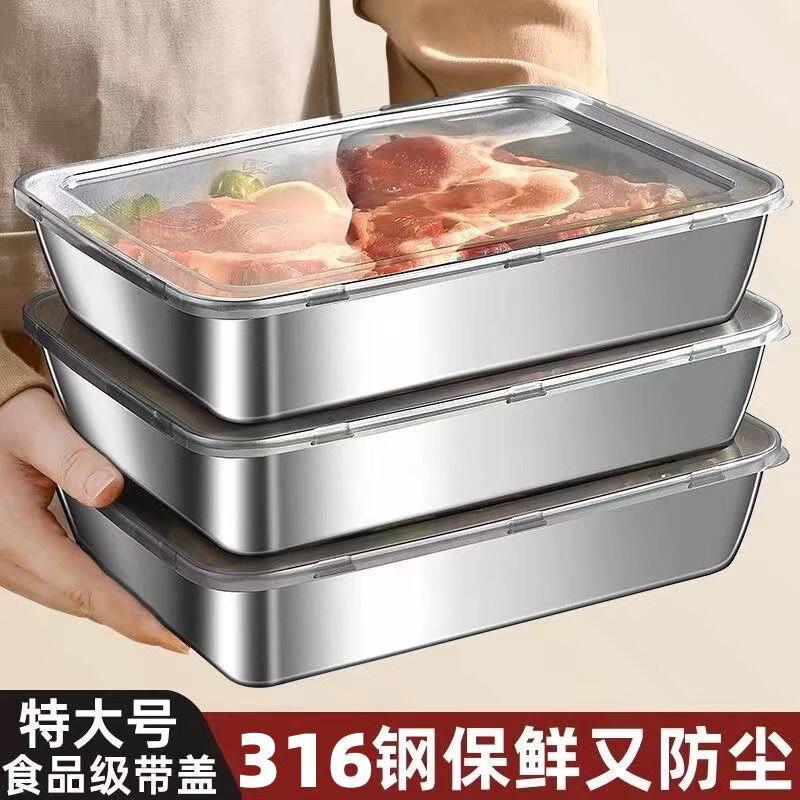 German quality dumpling box stainless steel extra large 30*24*5cm commercial stall crisper picnic box refrigerator 316 huge thick 5 trays + 5 see-through gray lids 30*24*5cm non-stick style