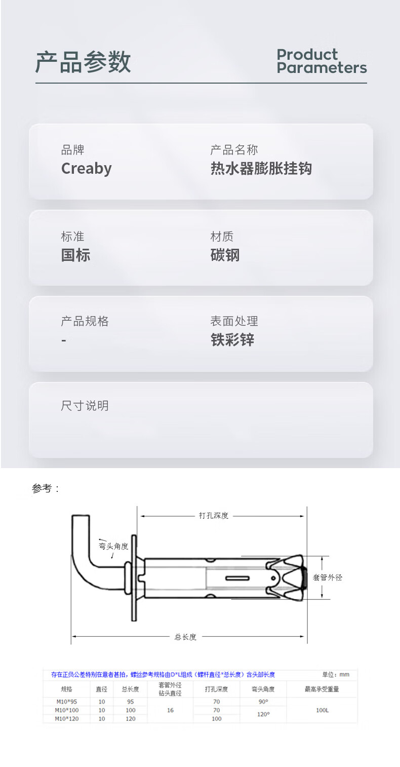 Creaby electric water heater expansion screw fixed hook universal hook universal accessories fastener standard parts M10x100 (90) 2 pieces