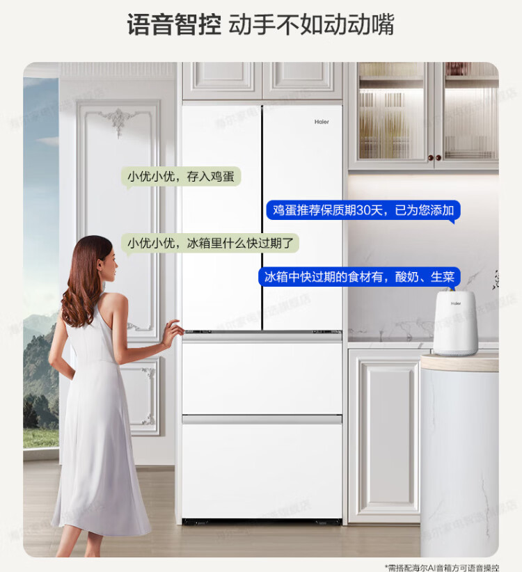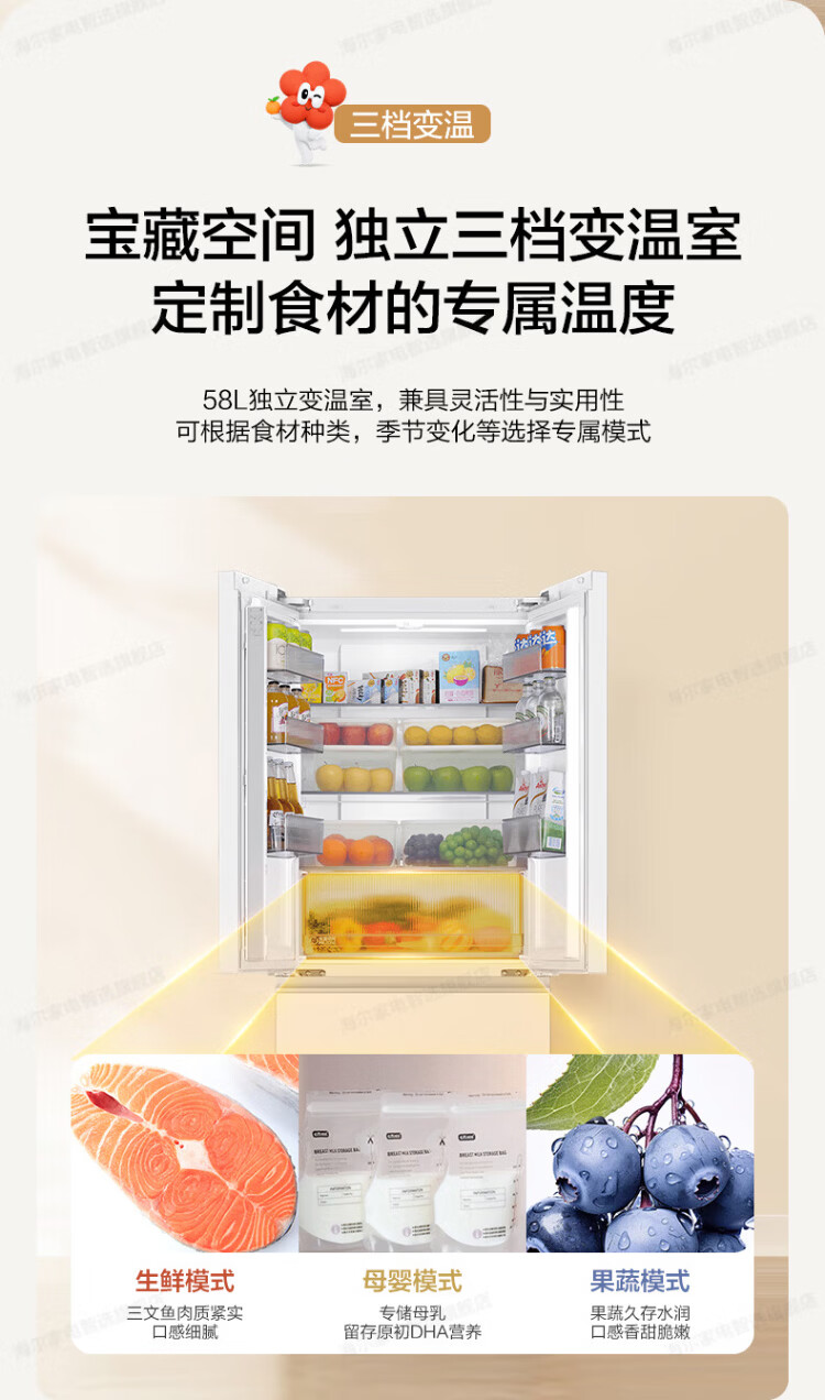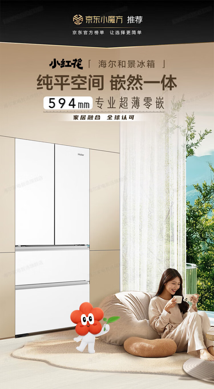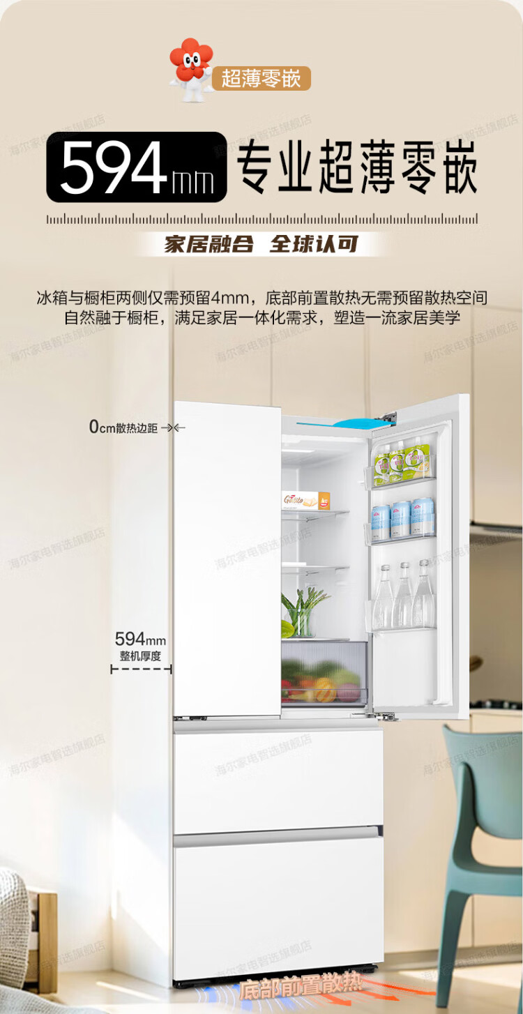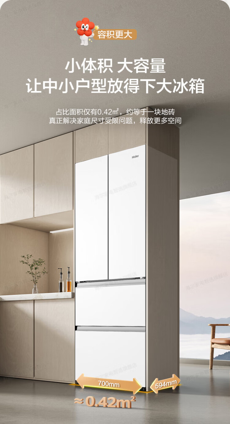 Haier refrigerator 416 liters ultra-thin zero-distance freely embedded within 60cm French style multi-door four-opening double-door Xiaohonghua series first-class energy efficiency dual frequency conversion large capacity state subsidy 416L+healthy black gold purification+maternal and infant three-speed temperature change+WiFi intelligent control