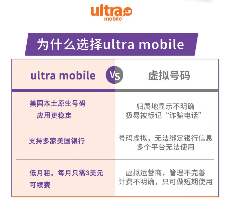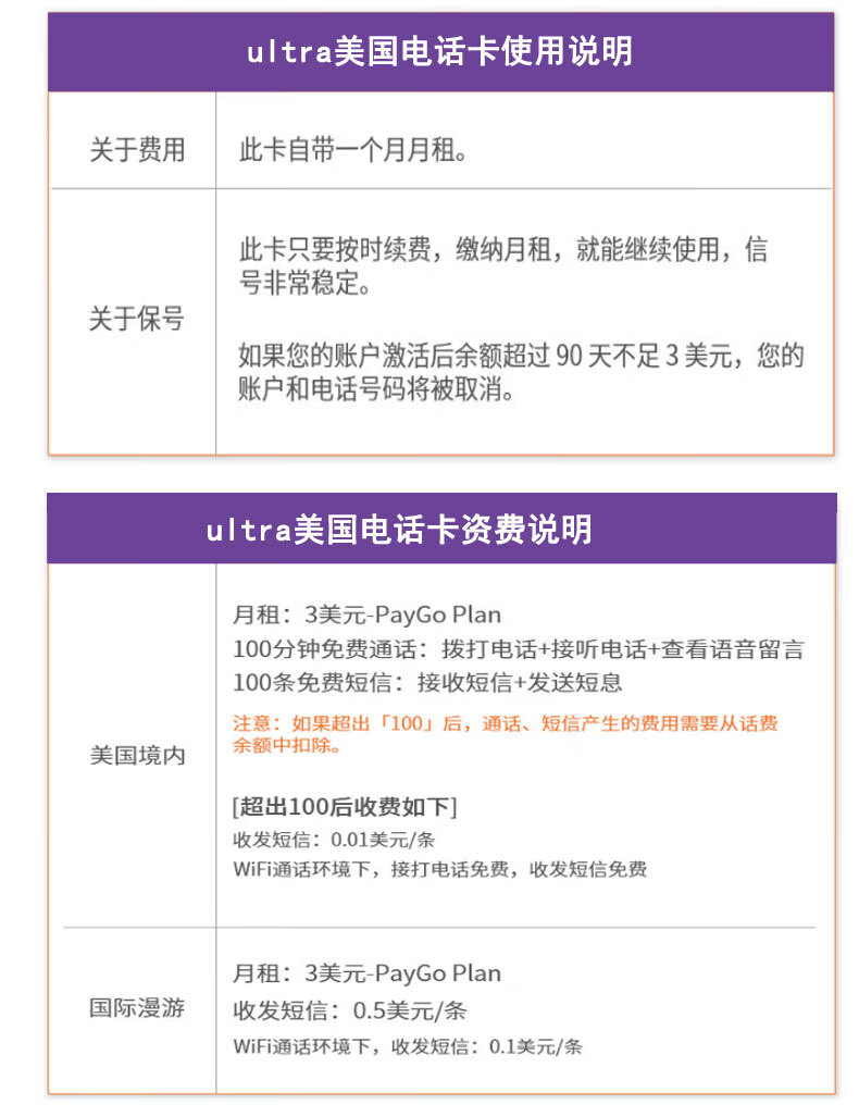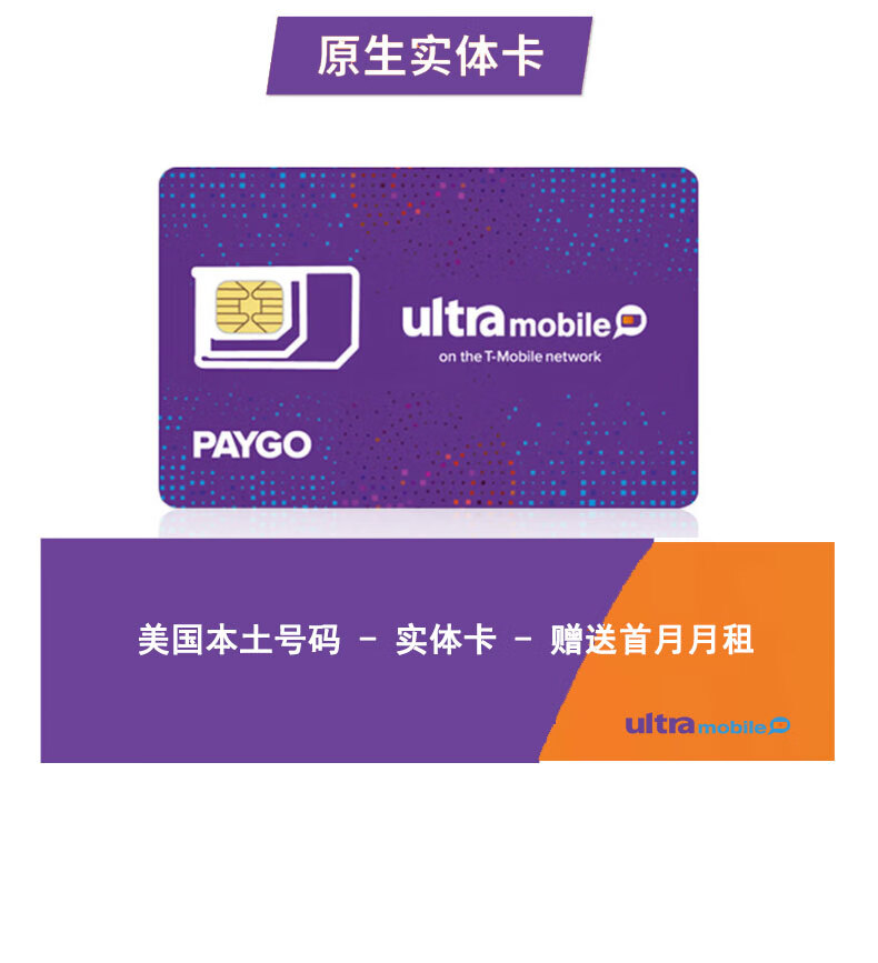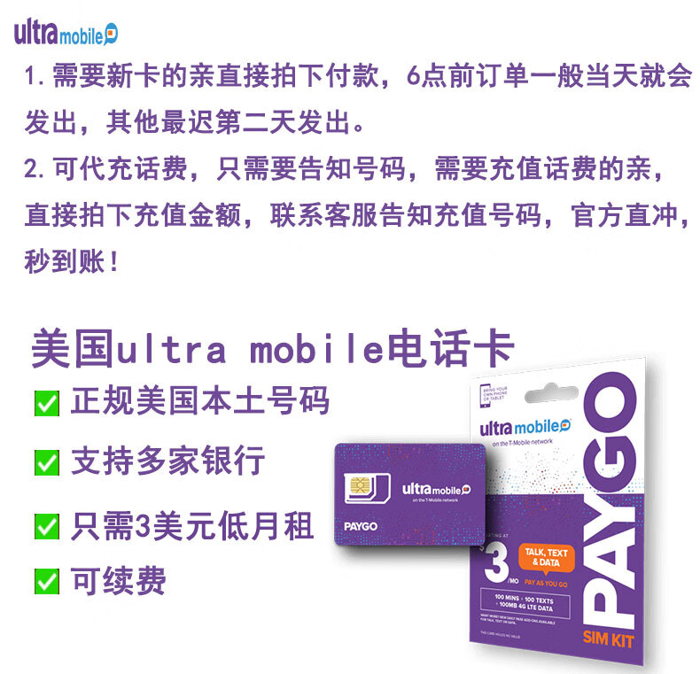 Ultra US phone card paygo purple card mobile phone card ultramobile renewal monthly rent 3 US dollars long-term card express delivery free shipping paygo new card is not activated to send activation tutorial