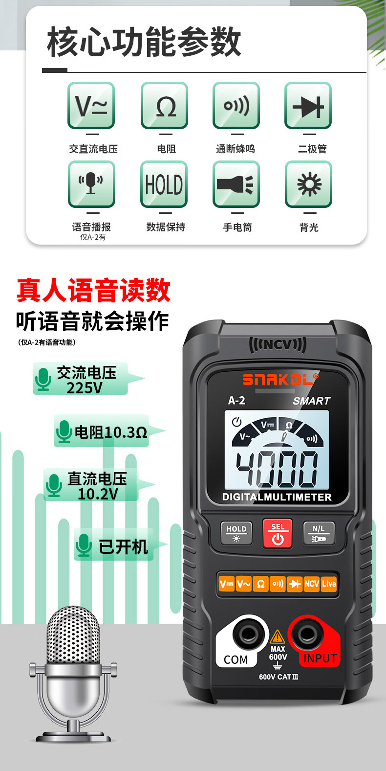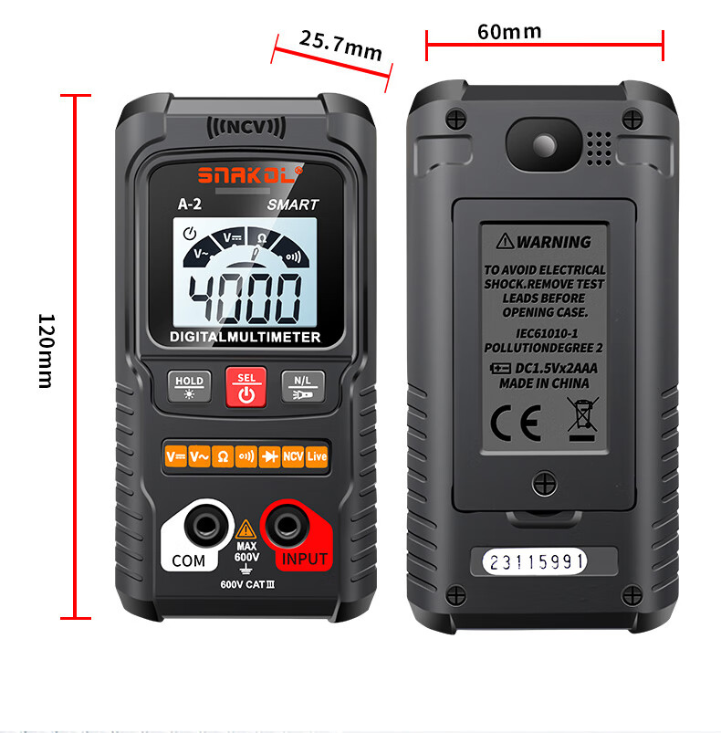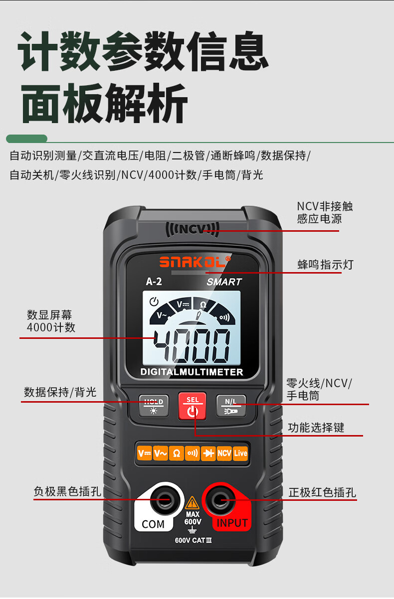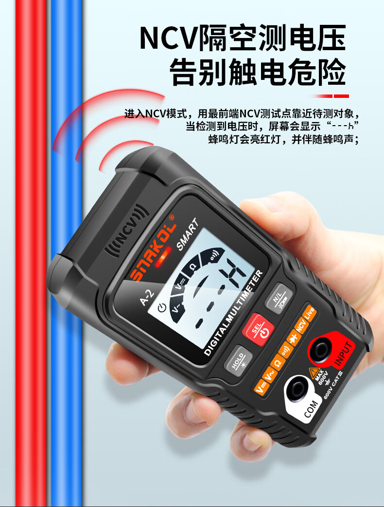 Snake A2 fully automatic multimeter voice broadcast digital high-precision intelligent anti-burn meter electrician multimeter NCV A-3 (fully automatic recognition + capacitance measurement + voice) 0-600V