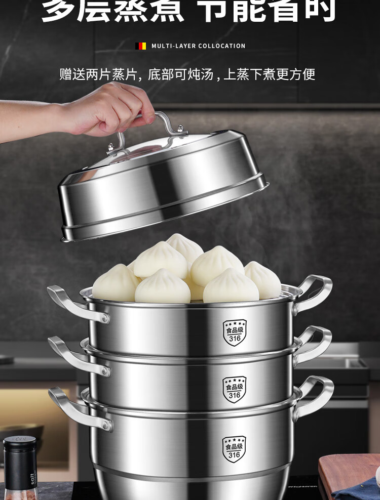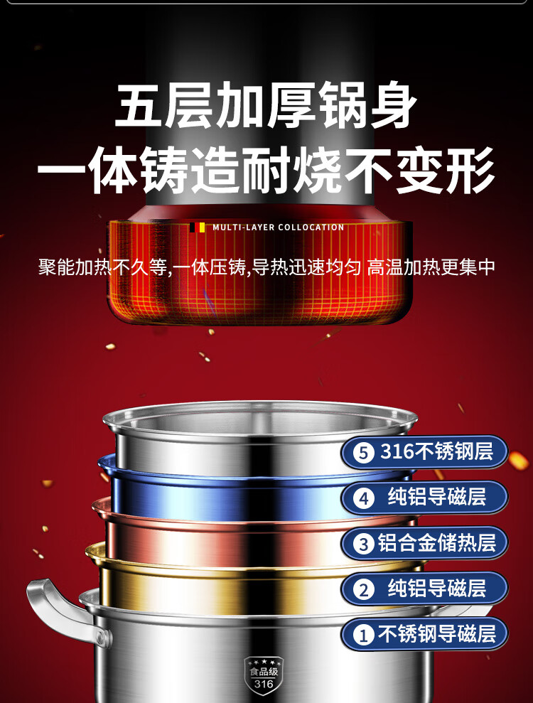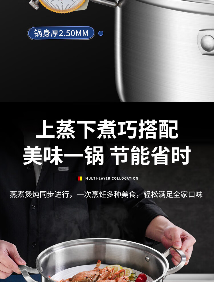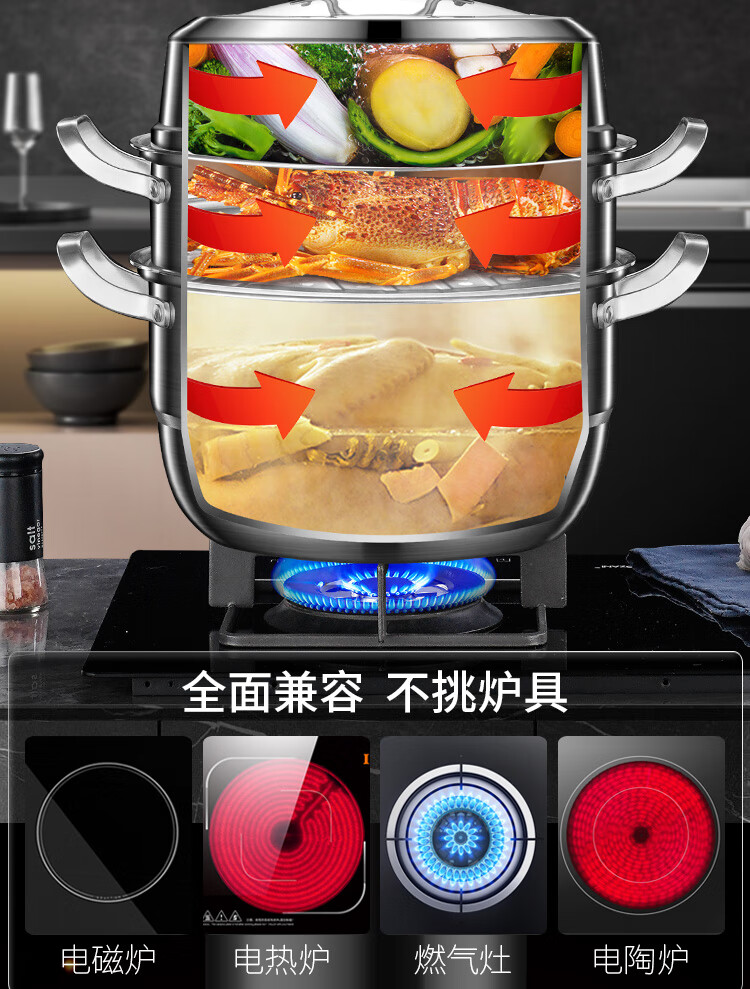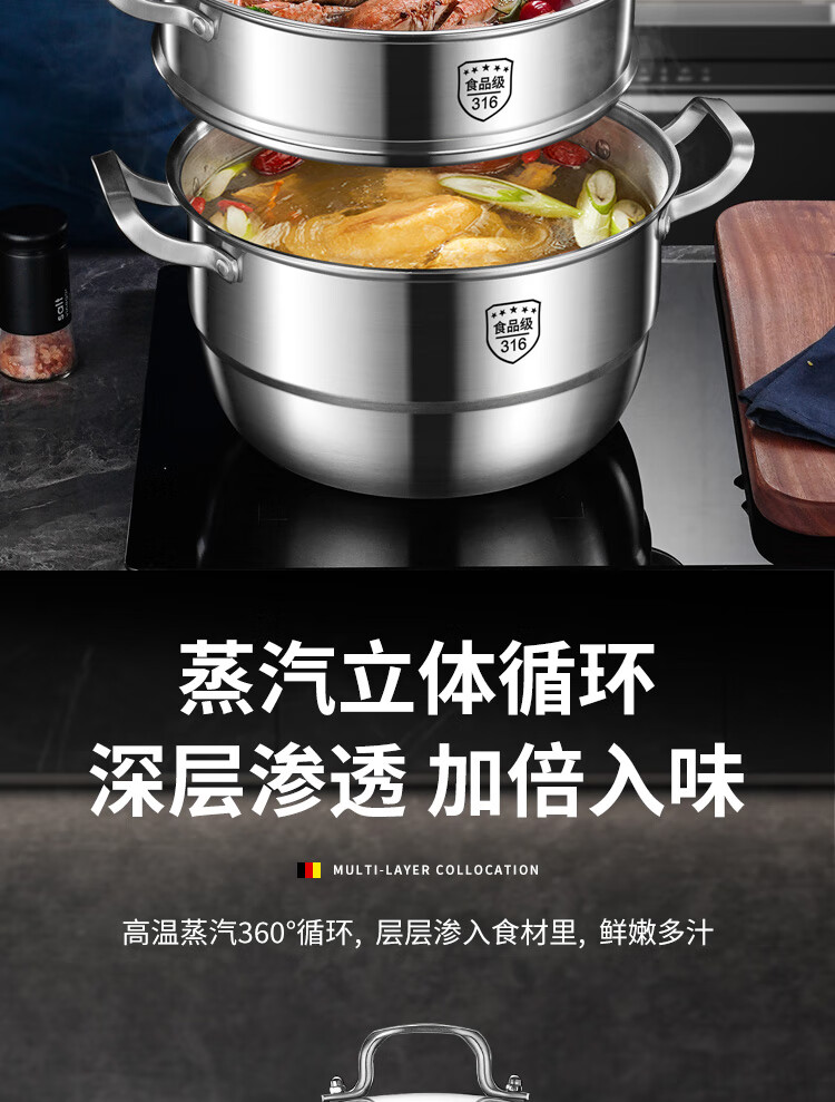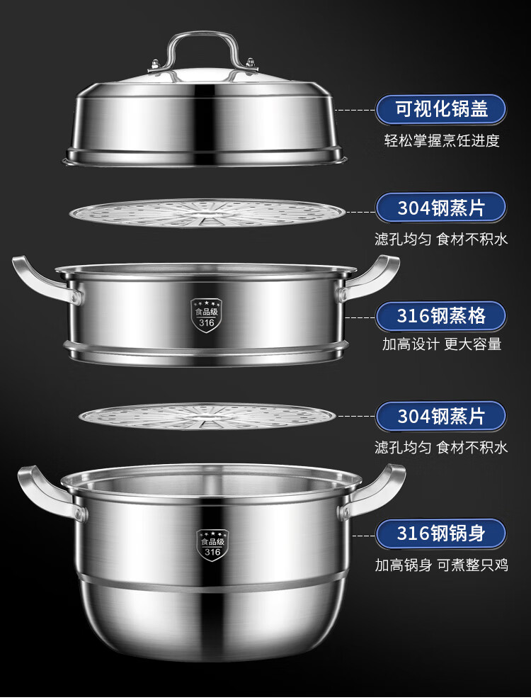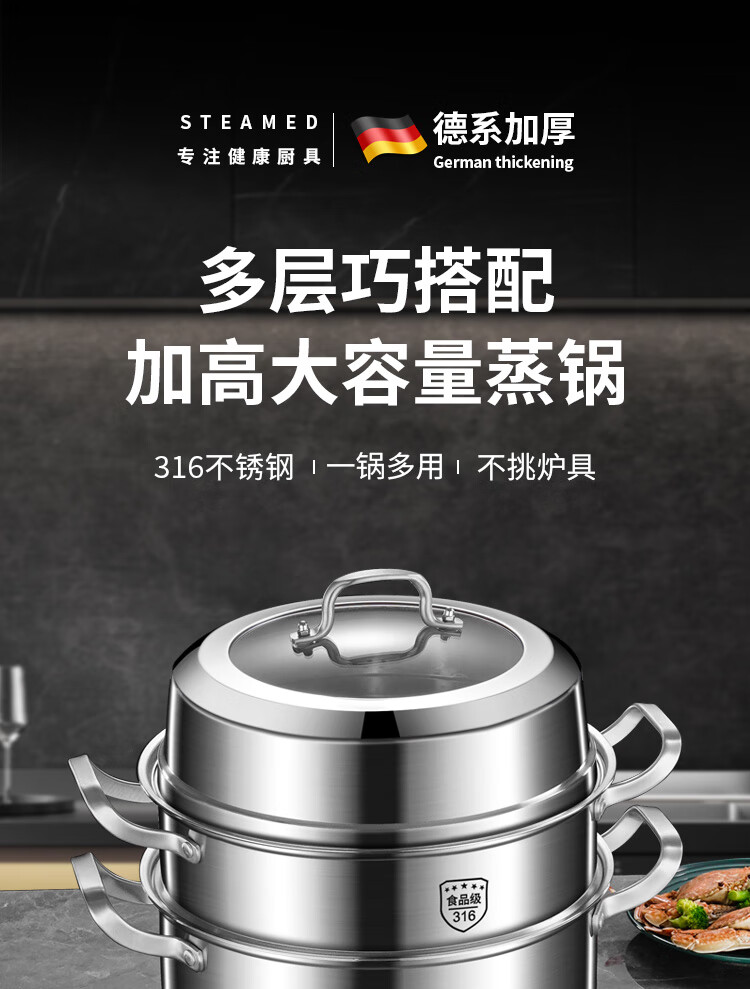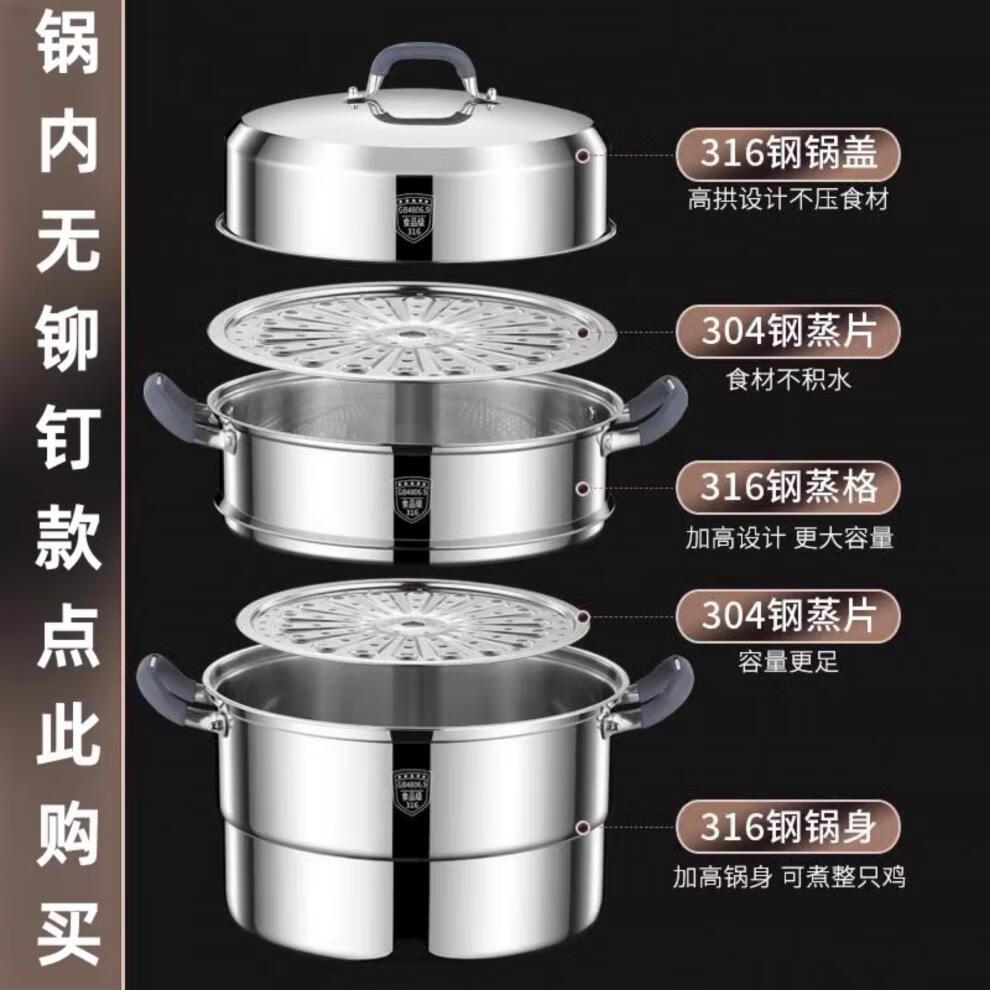 Fat Donglai's same style steamer extra thick and high 316 stainless steel thickened double three or four layers household soup pot one-piece molded thickened 36 three layers (1 pot + 2 steaming sheets + 1 steaming grid 1cm 10-year warranty, one-piece molding)
