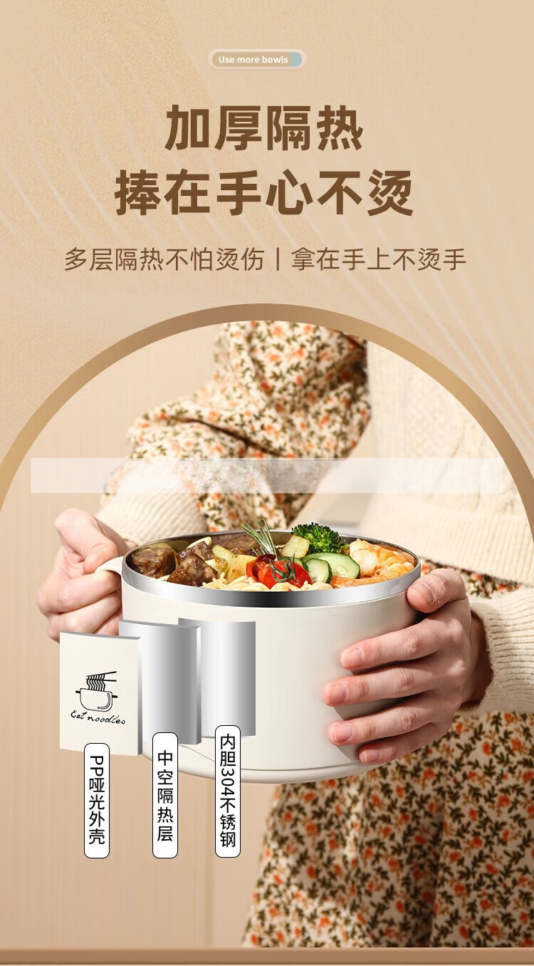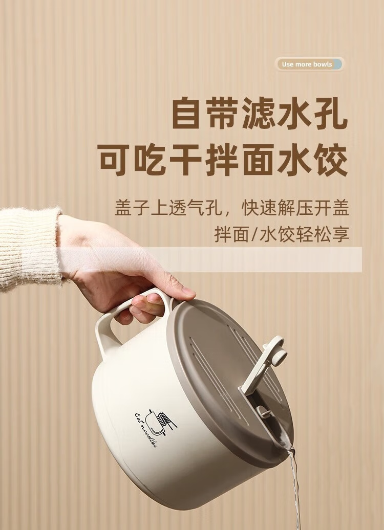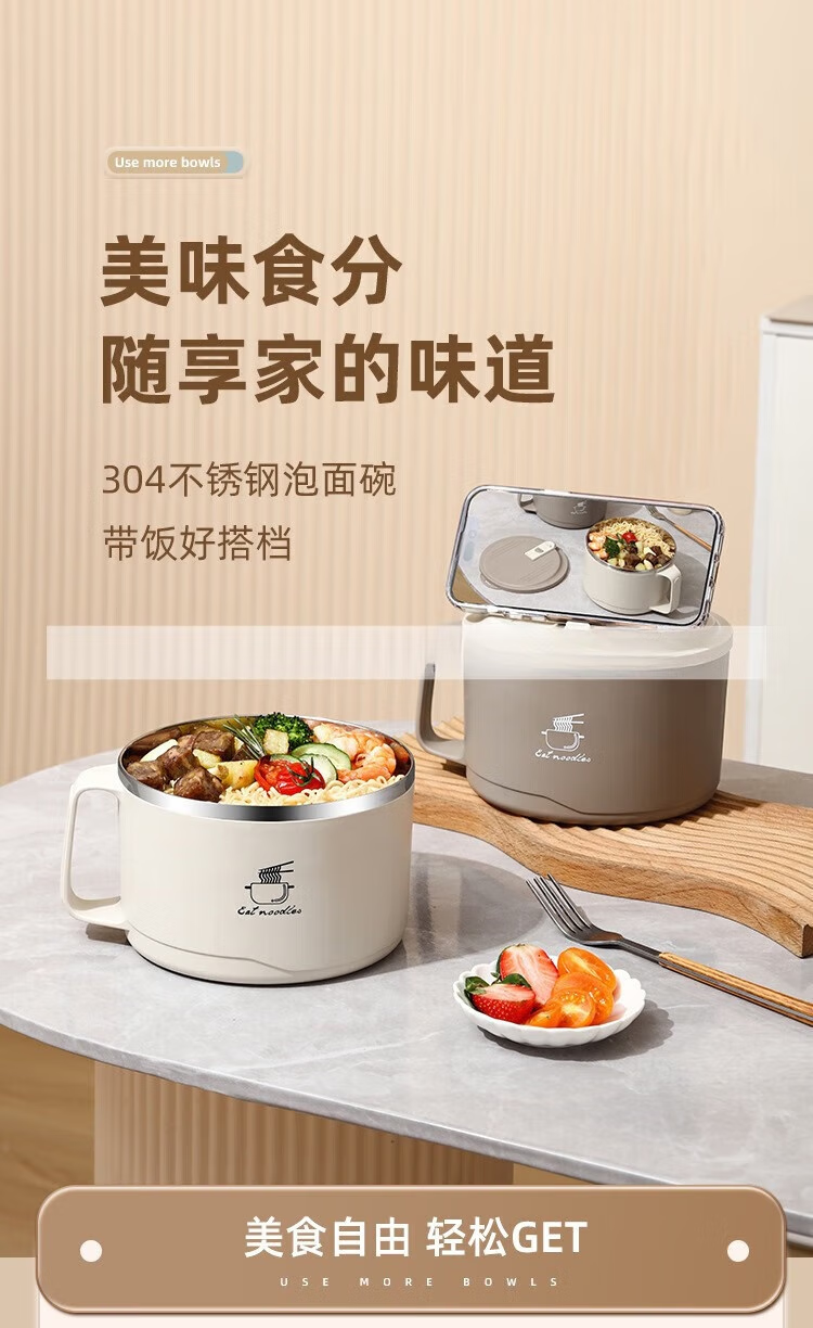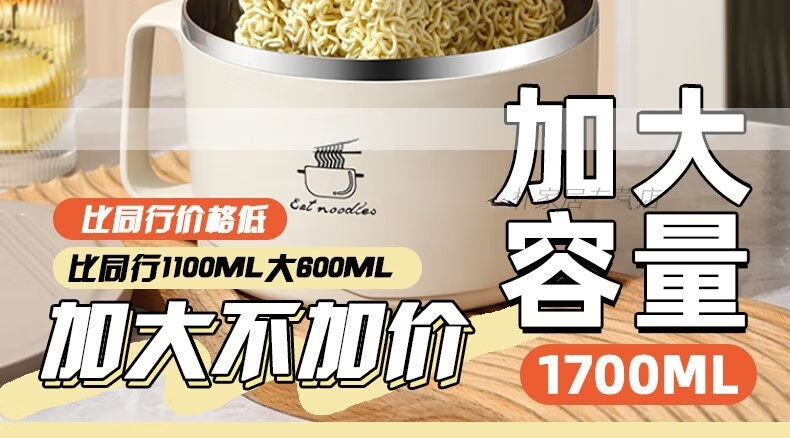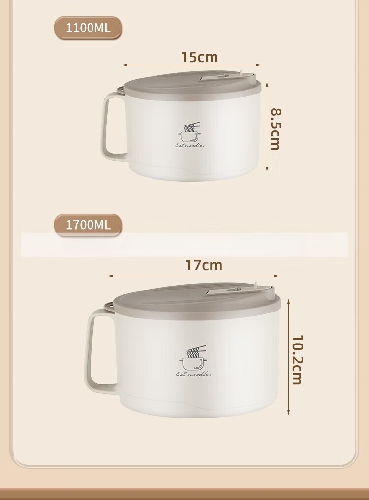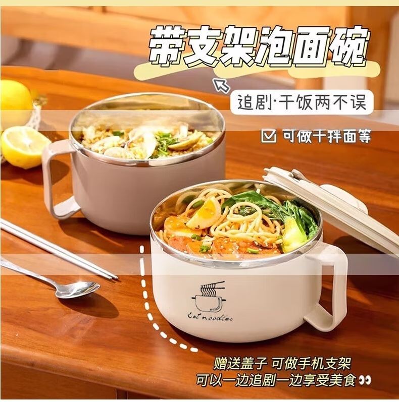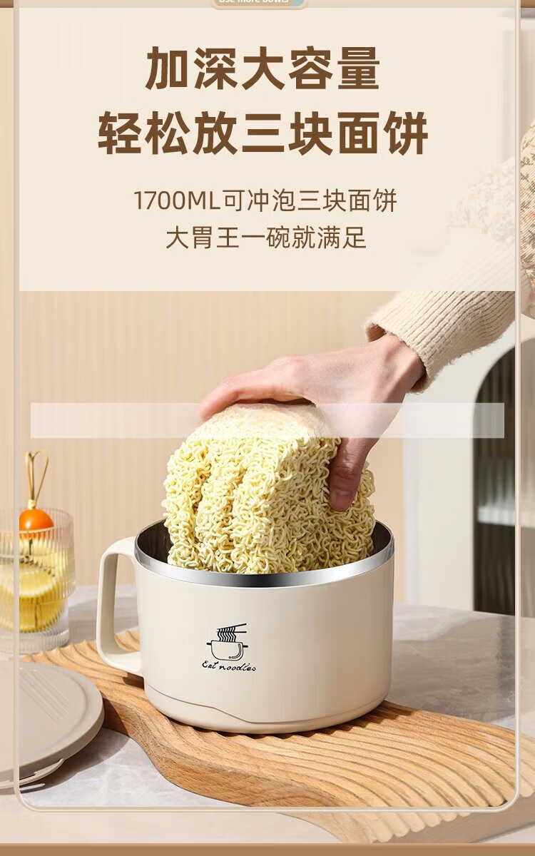 Deer color 304 stainless steel instant noodle bowl with lid, large dormitory student canteen lunch box with rice basin, instant noodles can be drained, 1700ML large capacity, 304 liner, off-white
