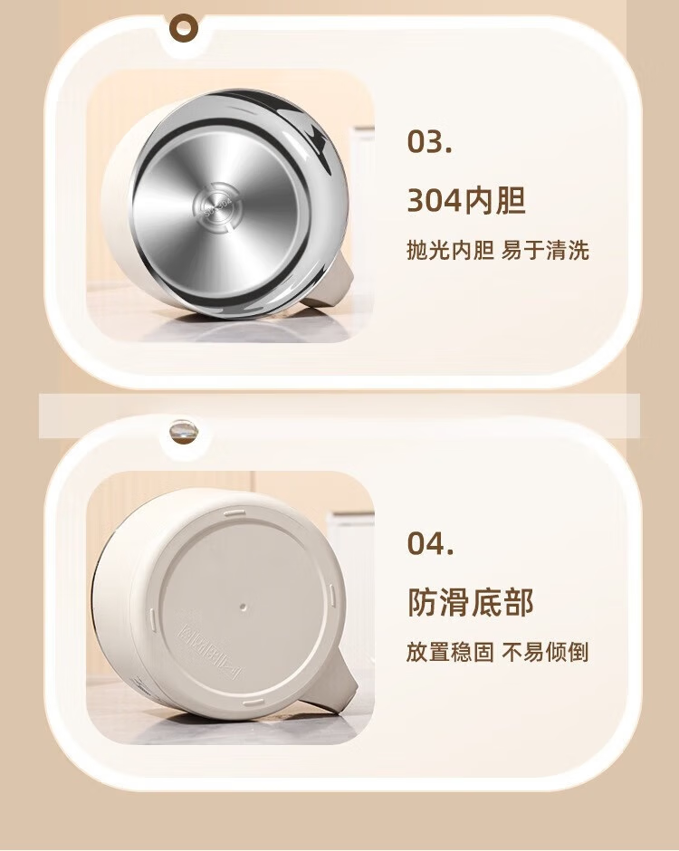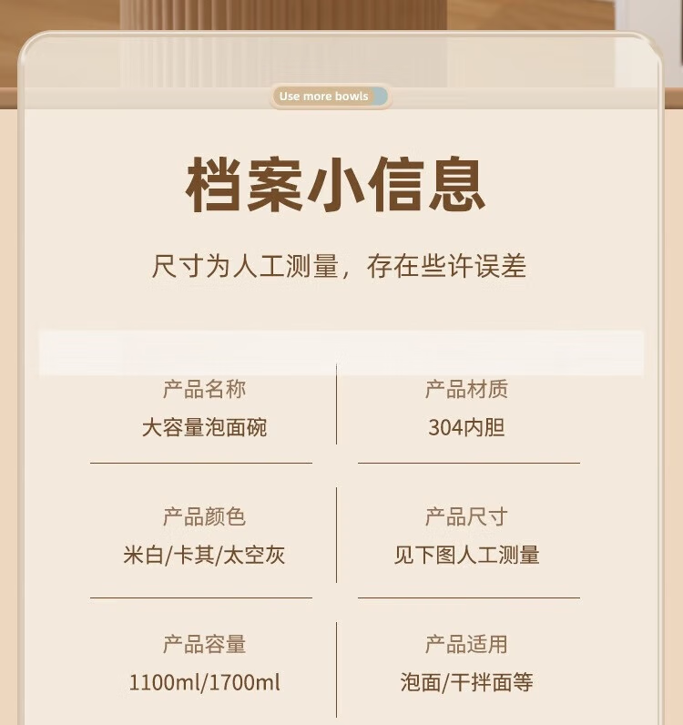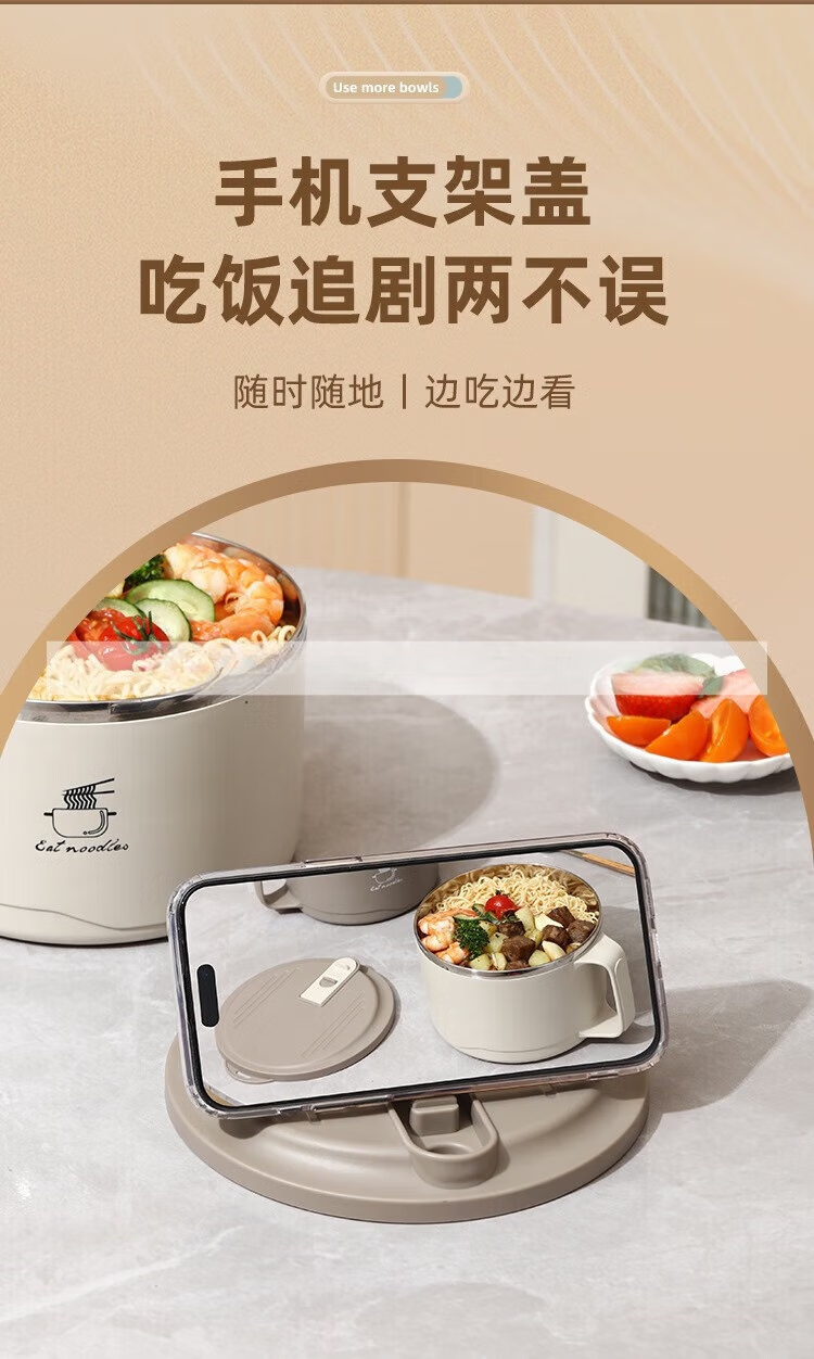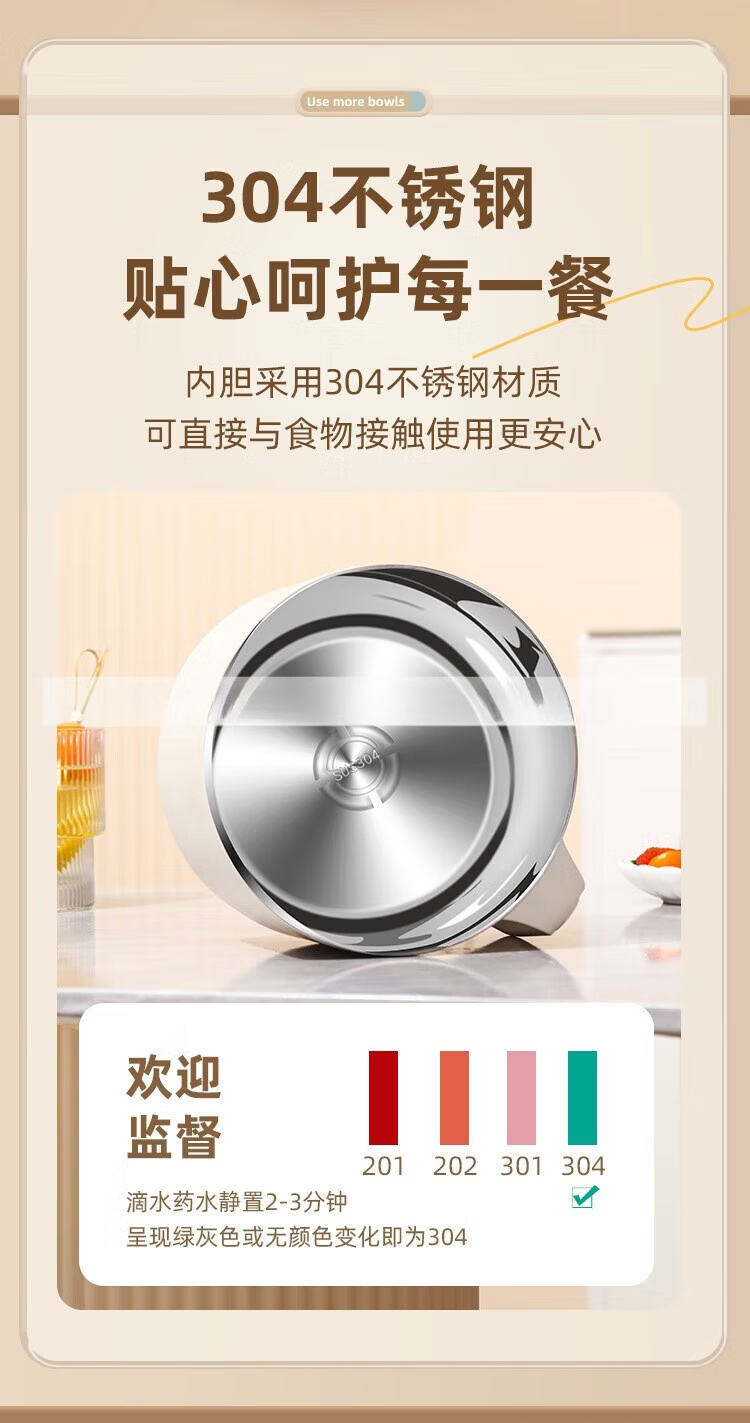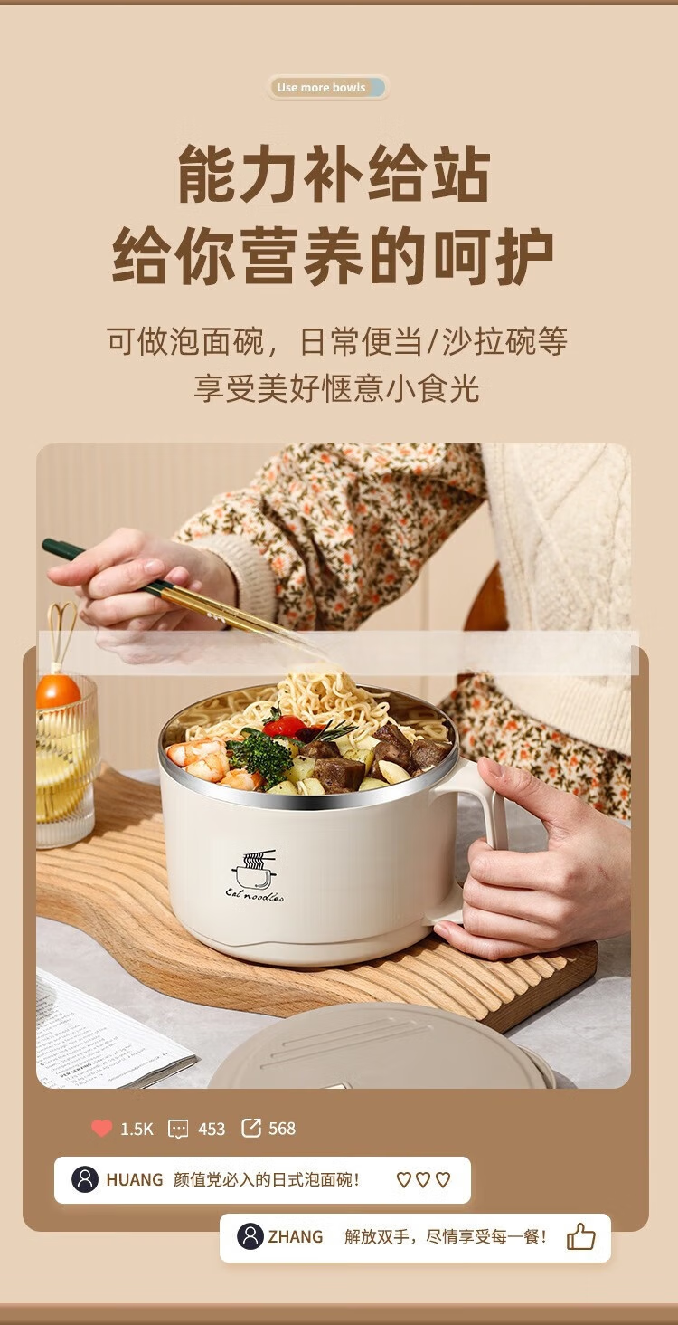 Deer color 304 stainless steel instant noodle bowl with lid, large dormitory student canteen lunch box with rice basin, instant noodles can be drained, 1700ML large capacity, 304 liner, off-white