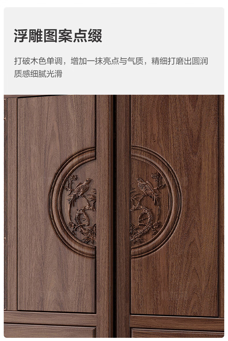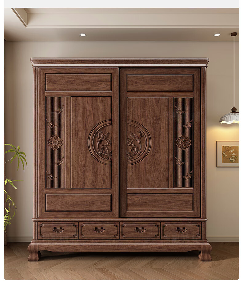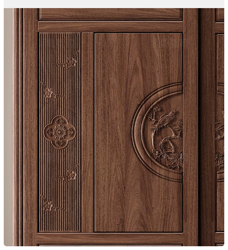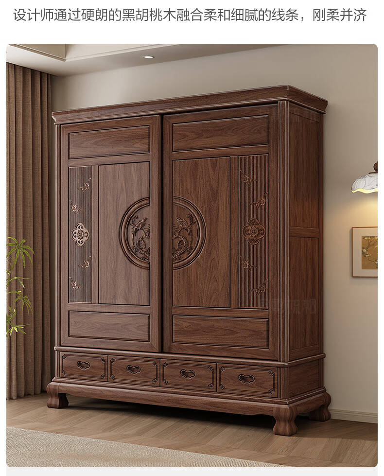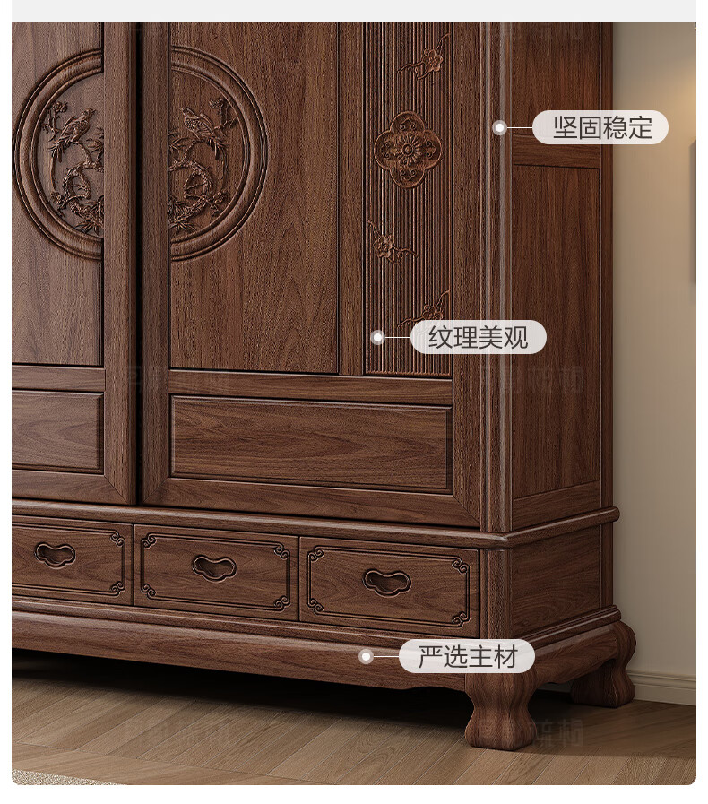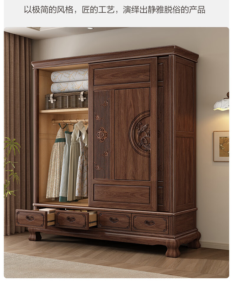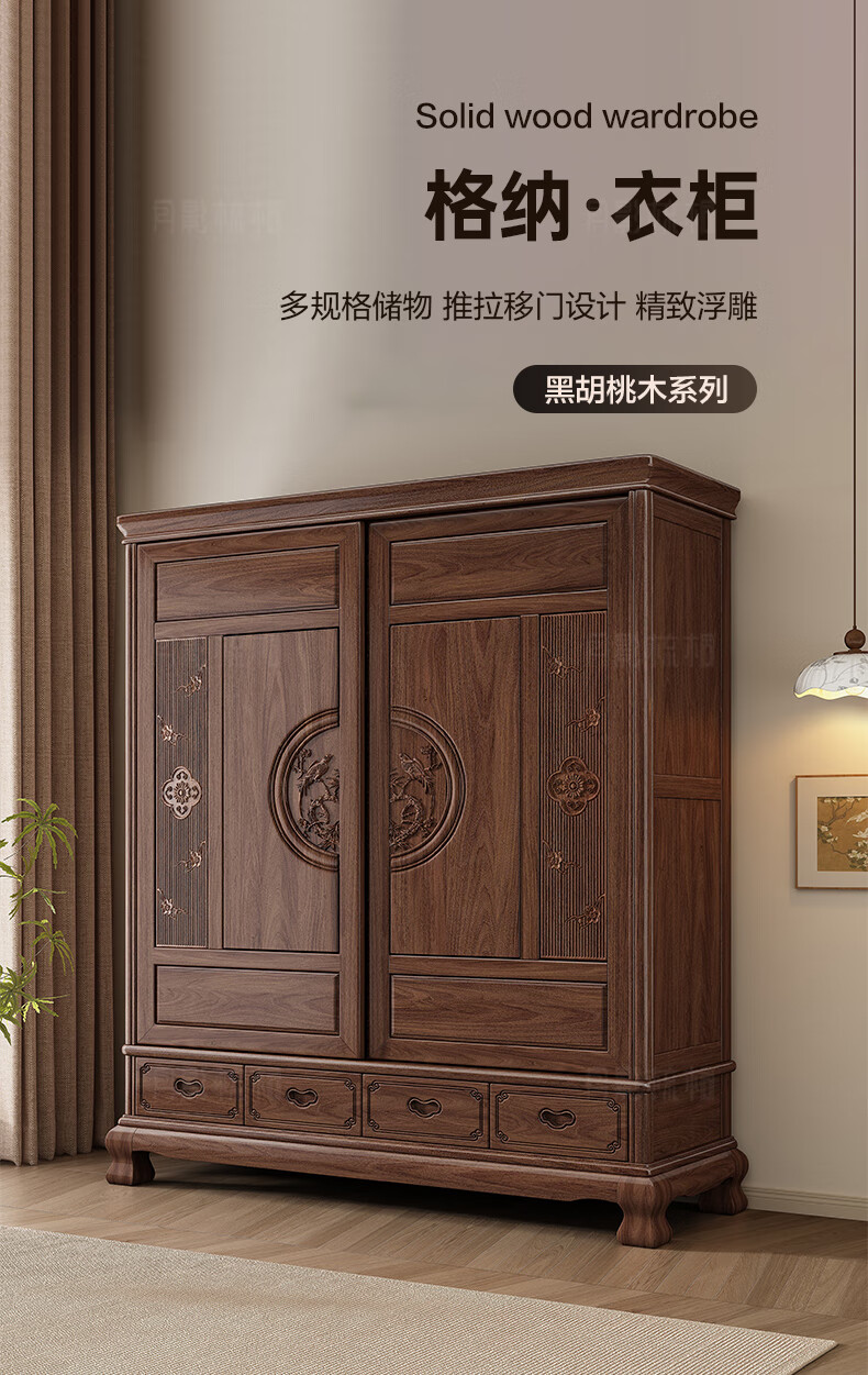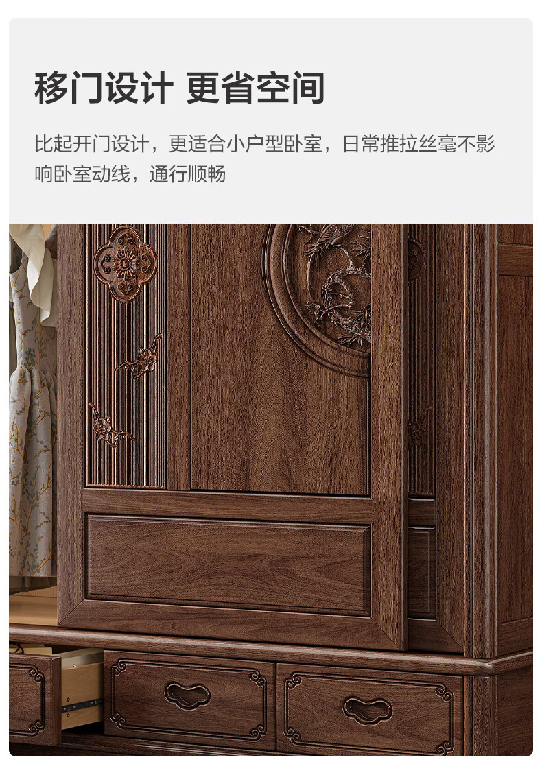Yueying tung mid-antique style black walnut sliding wardrobe classical carved large capacity storage home bedroom wooden sliding door wardrobe sliding wardrobe
