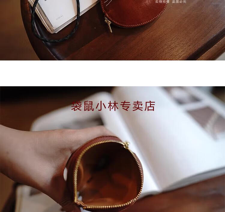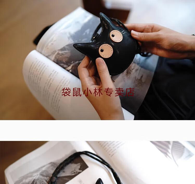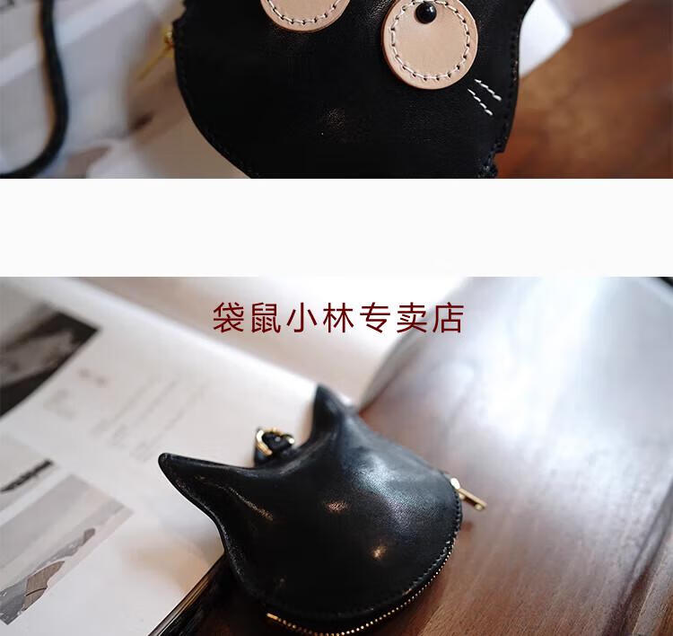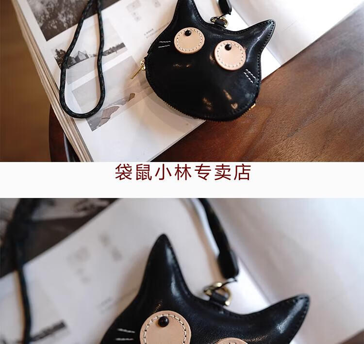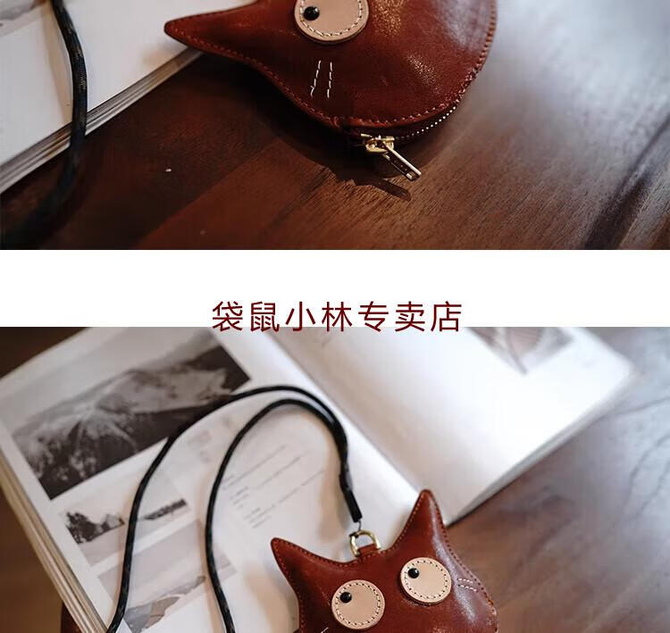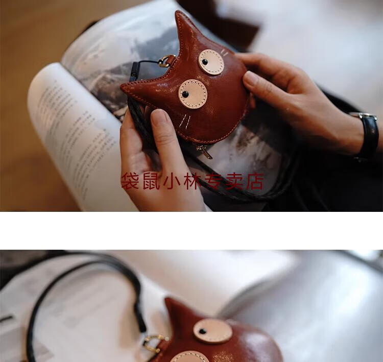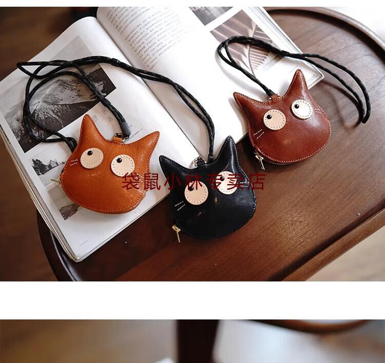 Kangaroo (KANGAROO) vegetable tanned cowhide cute cartoon cat retro halter neck coin purse key bank card earphone storage bag light brown