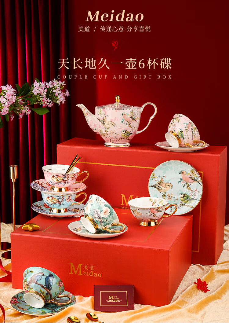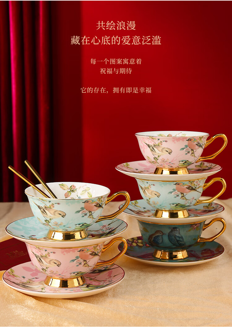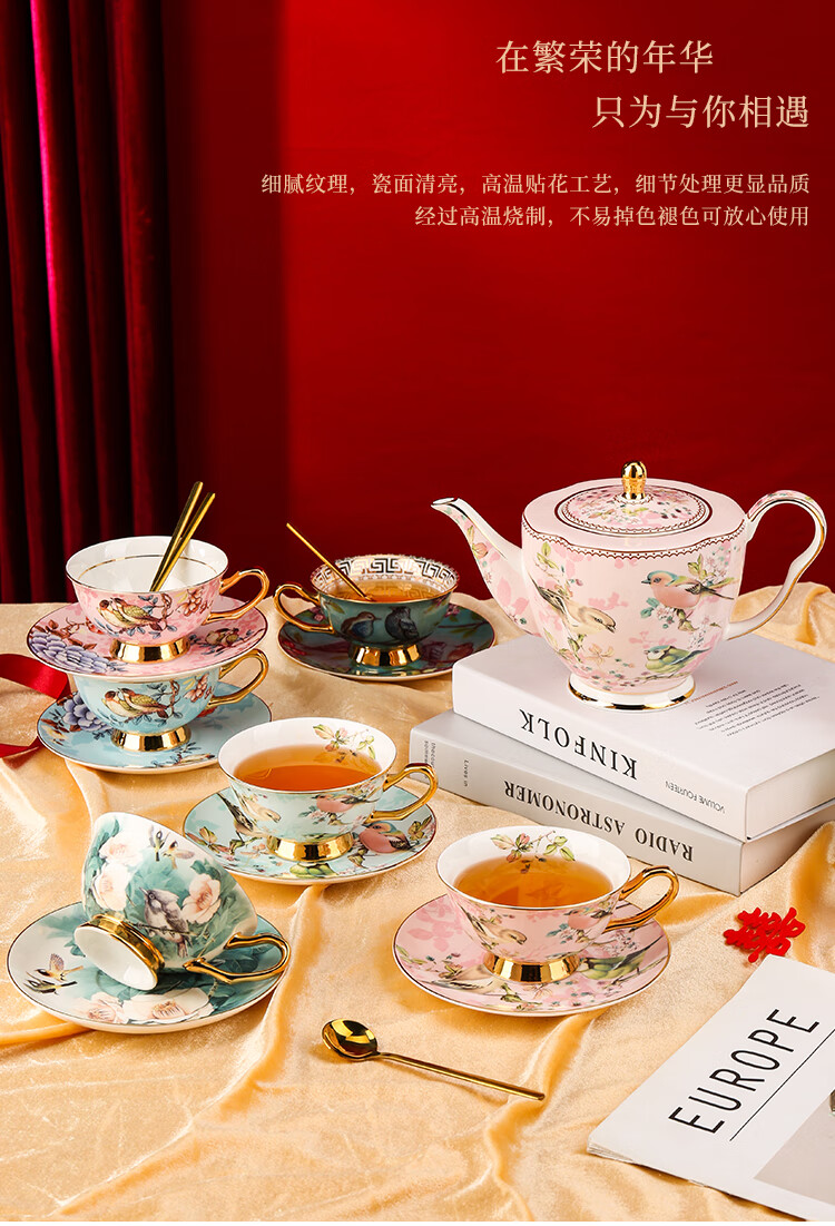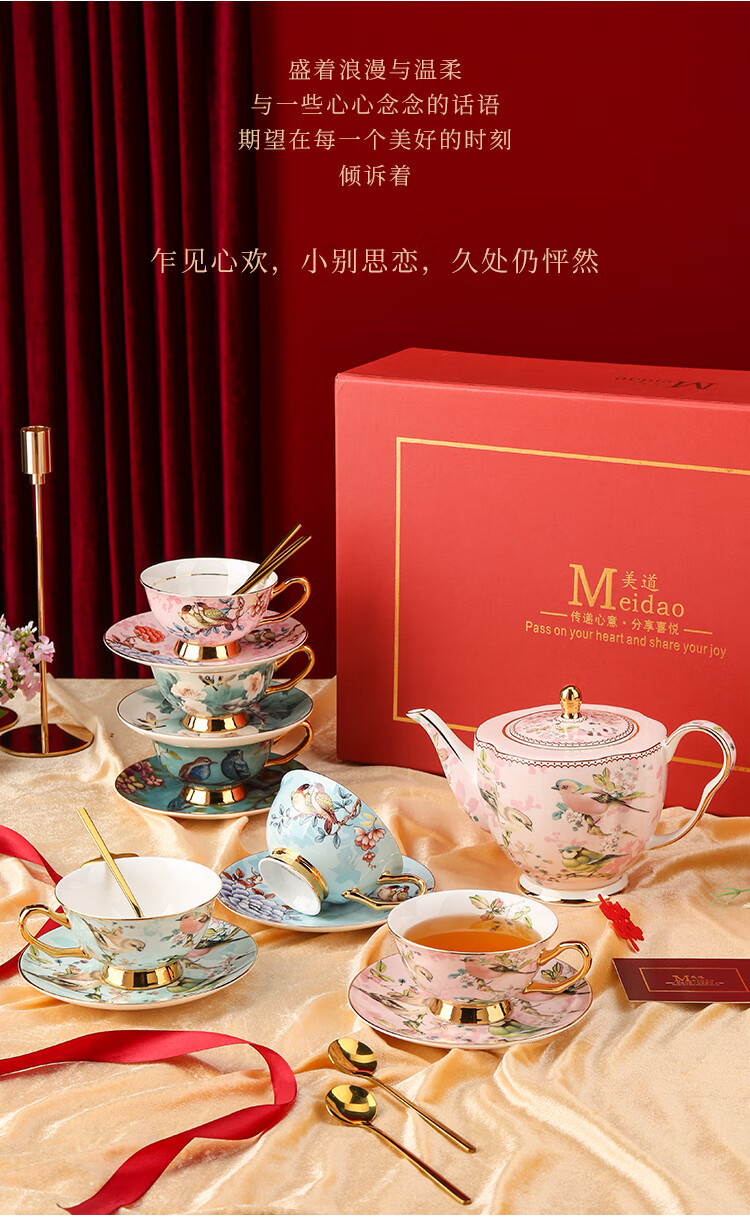 The Beauty of Forever Bone China Coffee Cup Set Gift Box Souvenir Afternoon Tea Cup for Wedding and Birthday Gift High-end 6 Cups and Saucers + Pink Bird 3-Character Pot - Red Gift Box Forever