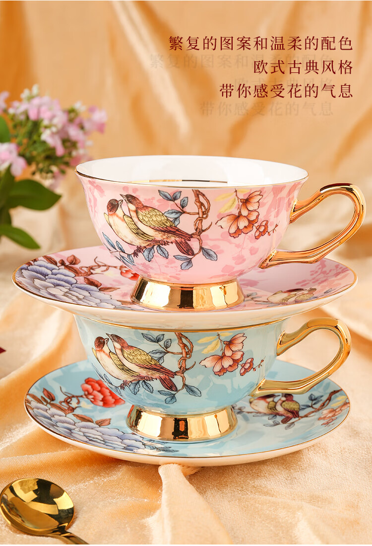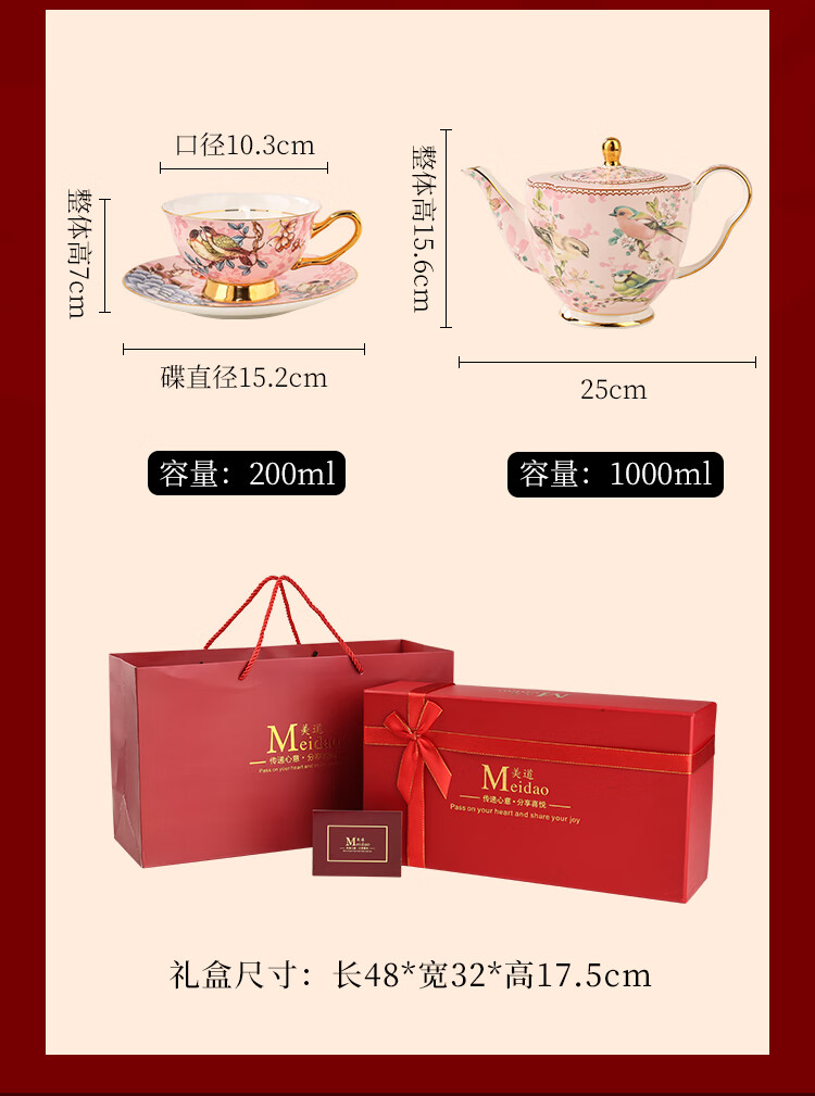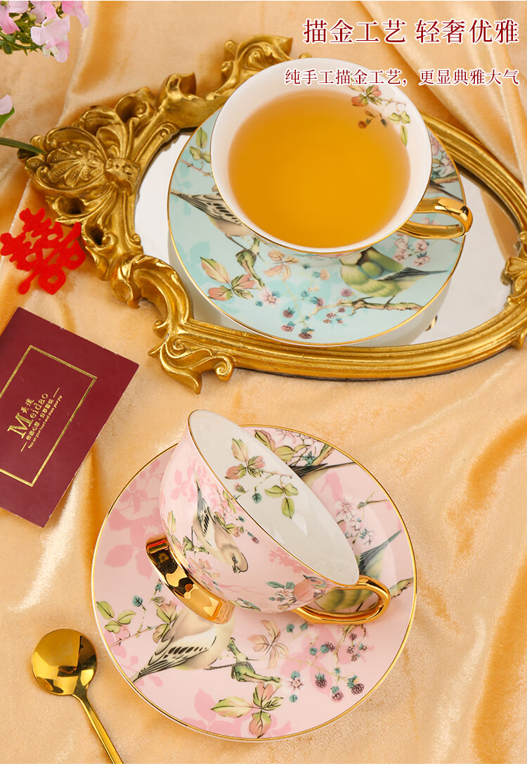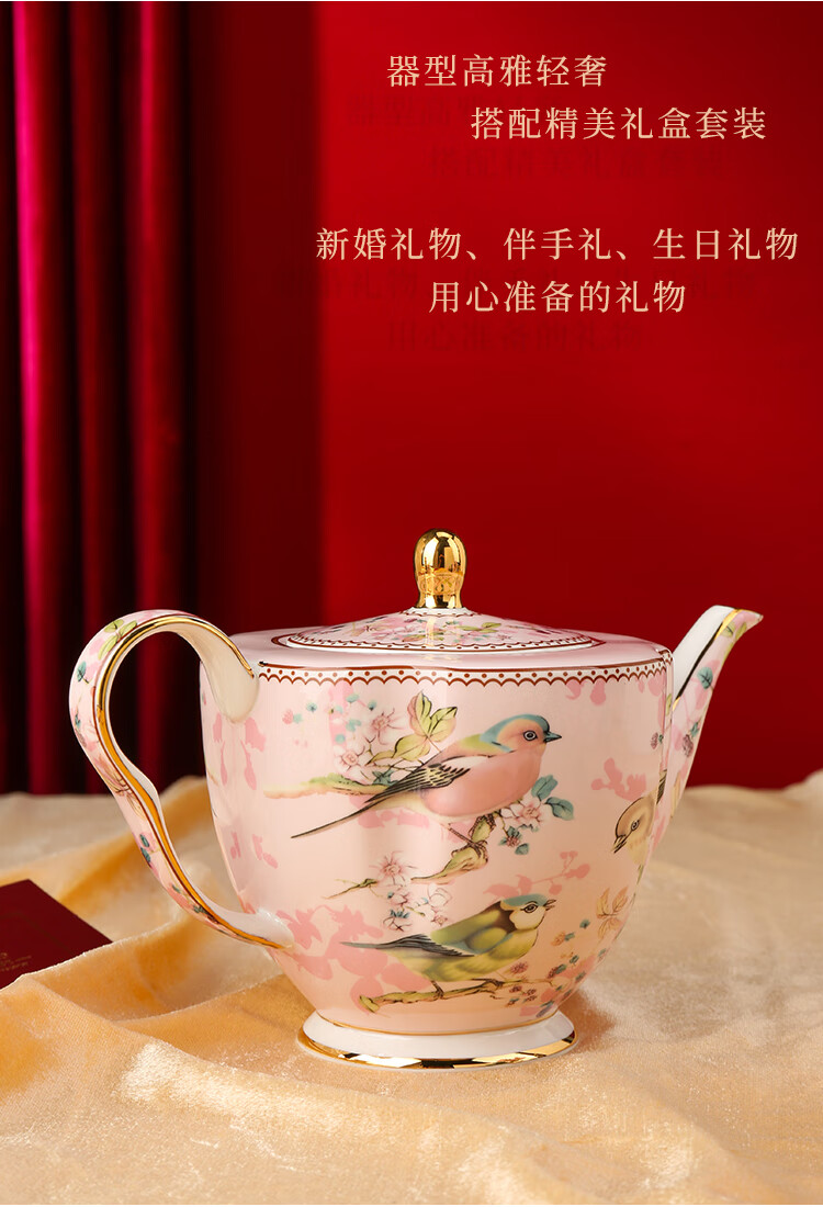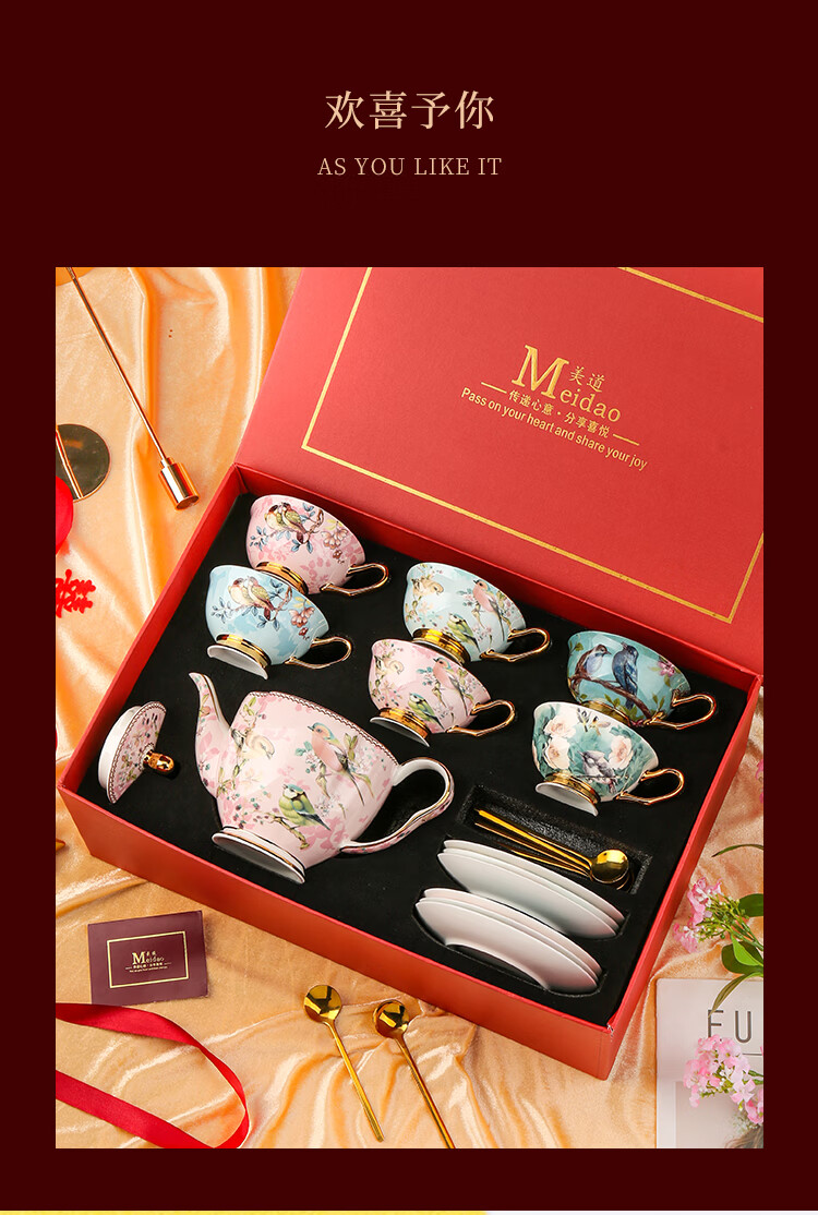 The Beauty of Forever Bone China Coffee Cup Set Gift Box Souvenir Afternoon Tea Cup for Wedding and Birthday Gift High-end 6 Cups and Saucers + Pink Bird 3-Character Pot - Red Gift Box Forever