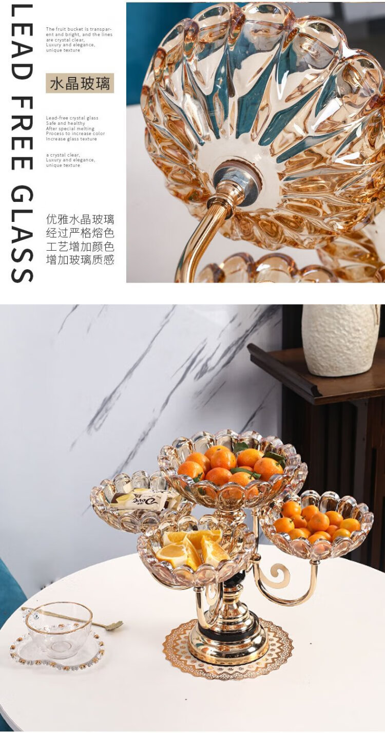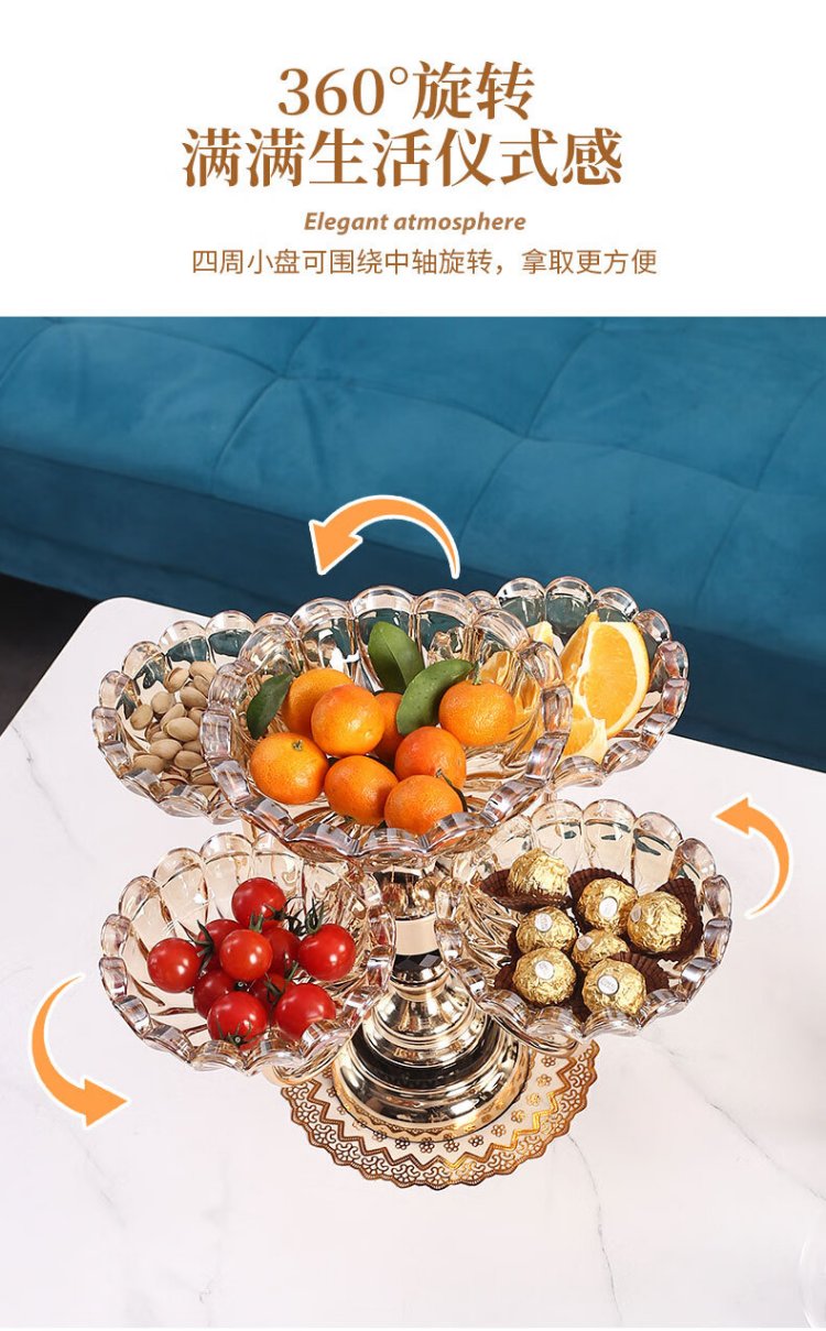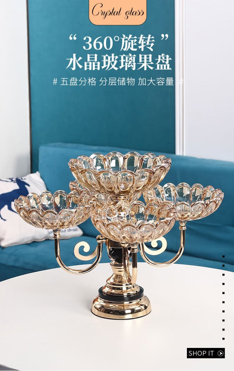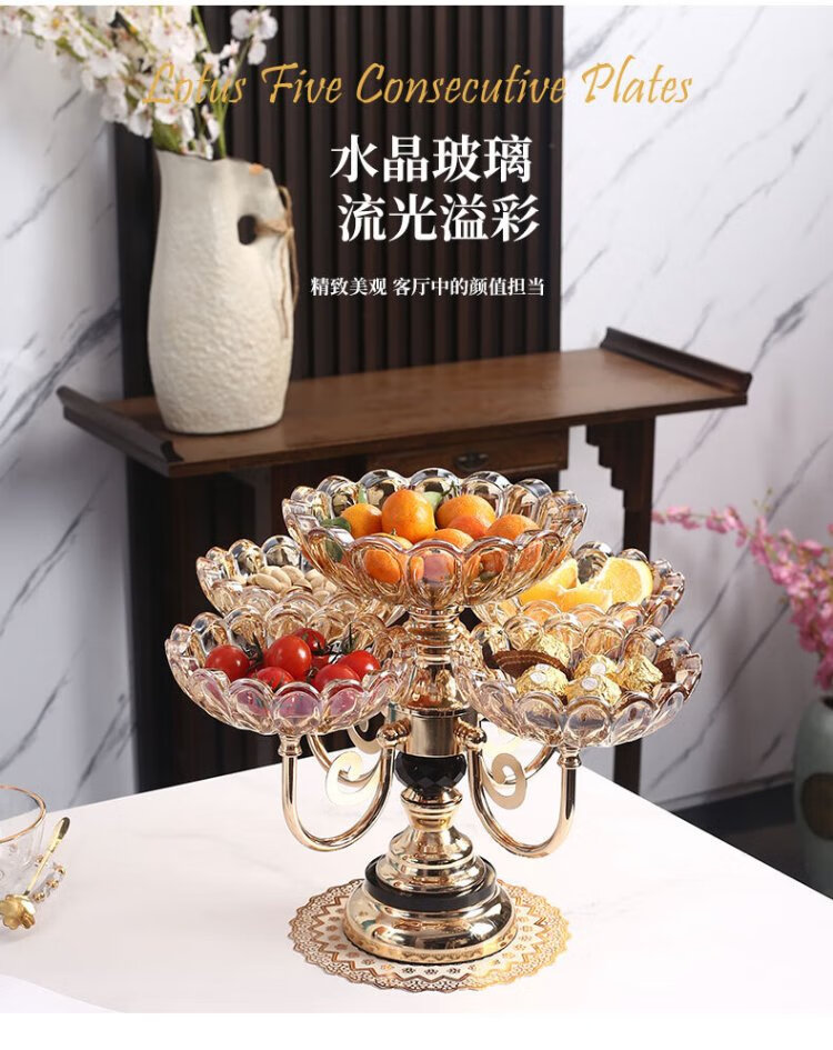 Flower Language Four Seasons European Crystal Glass Multi-layer Rotating Fruit Plate Modern Home Living Room Coffee Table Luxurious Snack Candy Plate Ornaments Five-Connect Plate Ceramic Base Rotatable