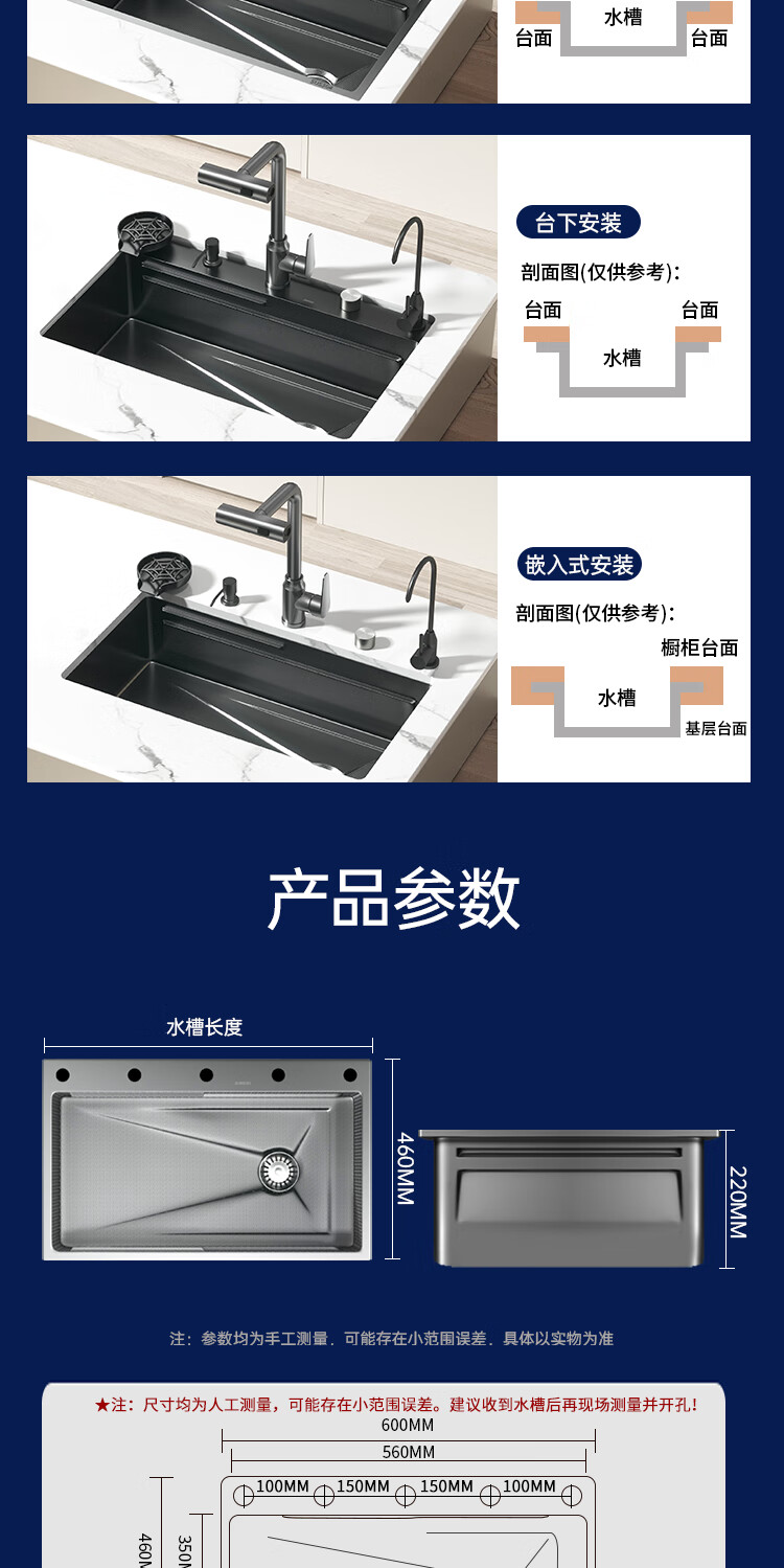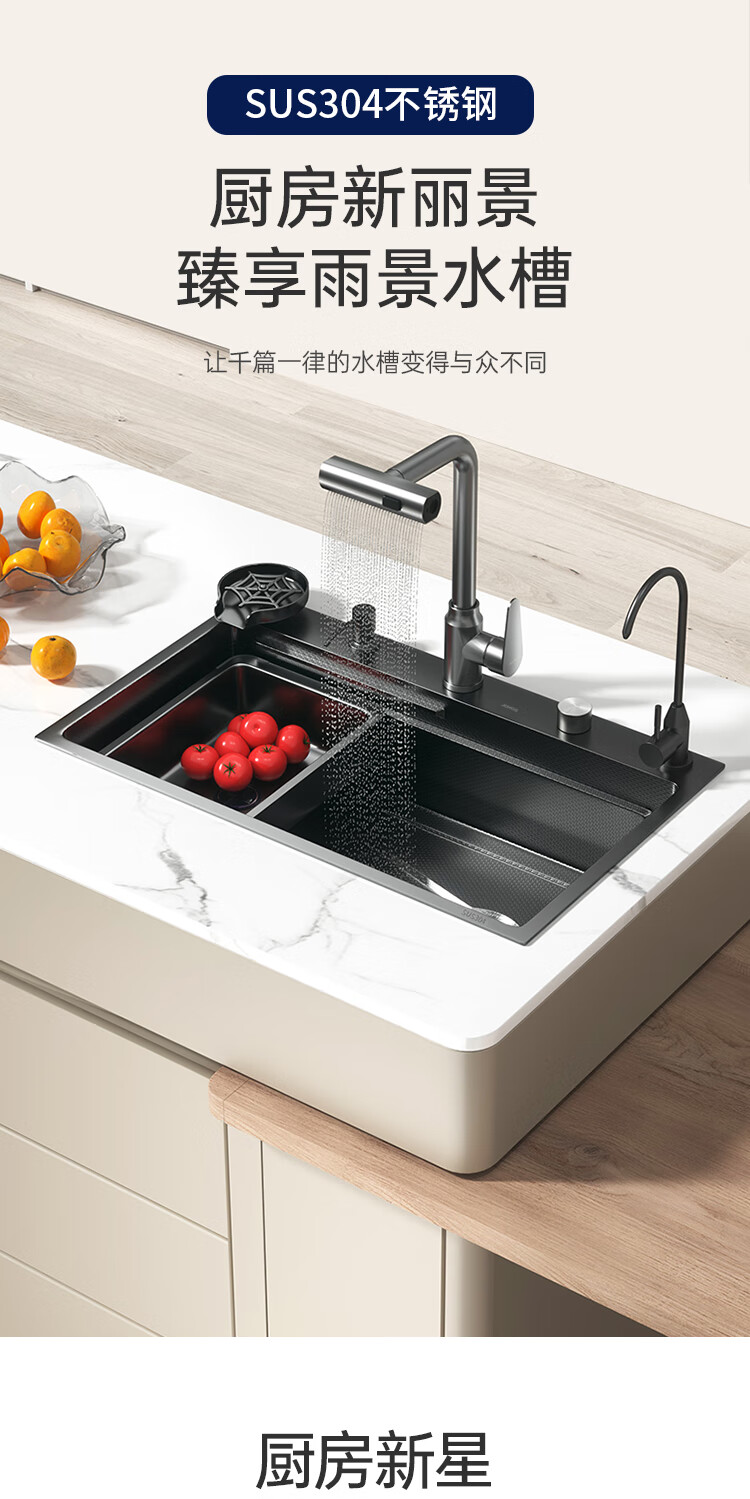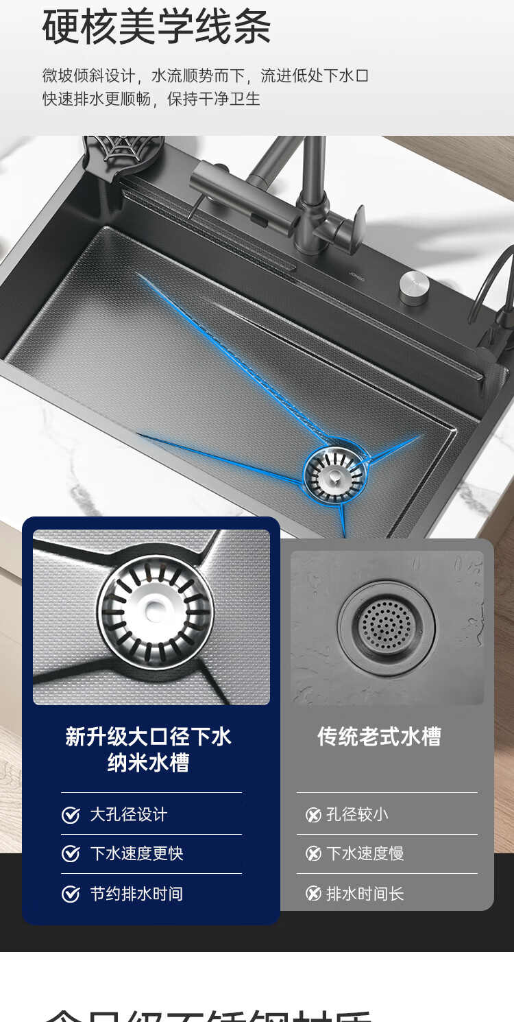 JOMOO Kitchen 304 Stainless Steel Nano Handmade Sink Large Single Slot Upper, Middle and Lower Sink Basin Household Sink Set Millet Type A/No Faucet 600*460