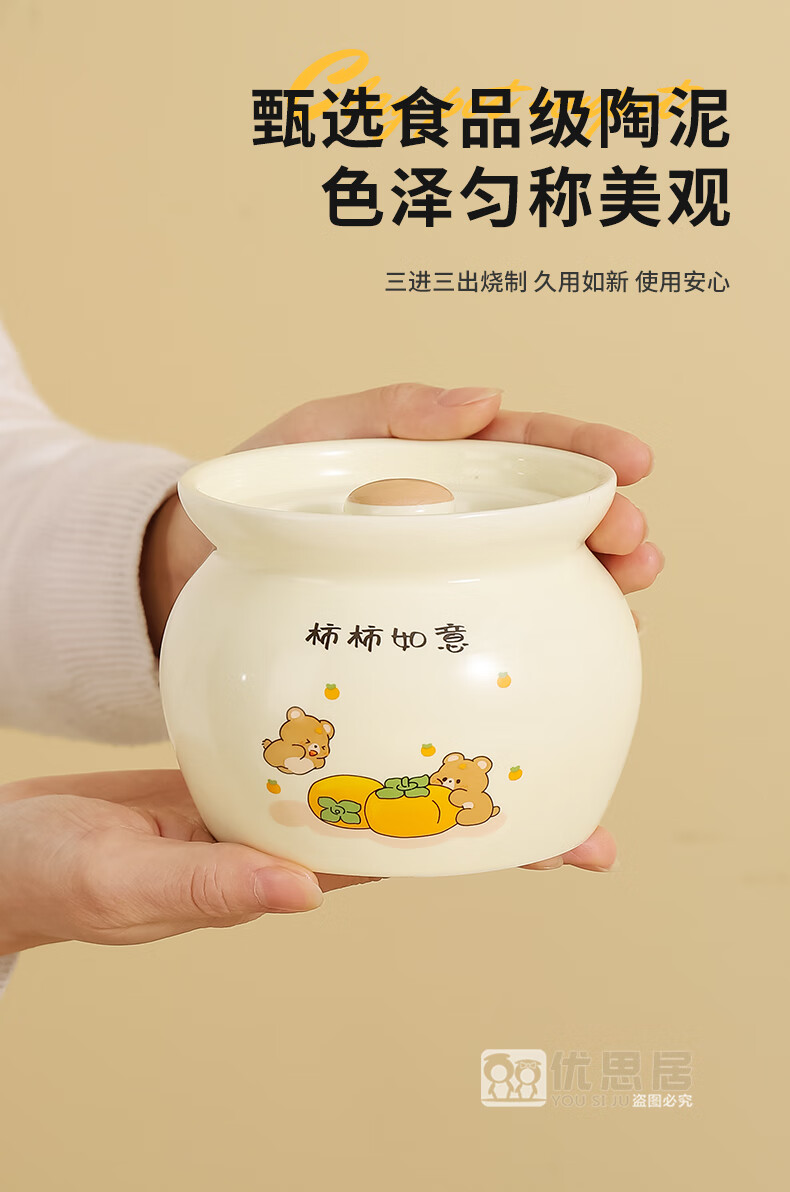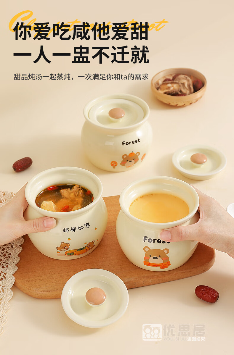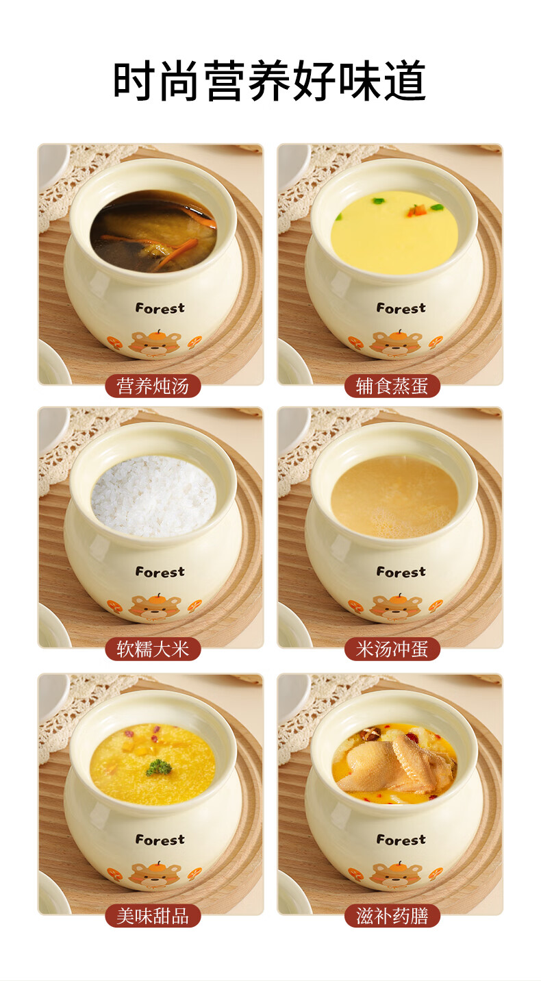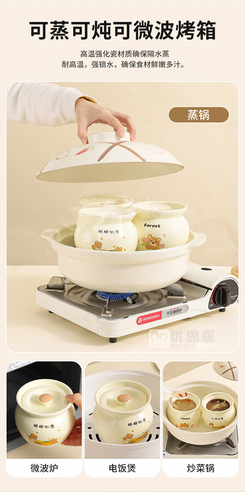 German crock pot stew pot for one person, food-grade household water-proof stew pot, soup pot with lid, steamed vegetable and egg bowl, cream color Ruyi Bear + Nuannuan Bear + Flower Bear + Apple Bear