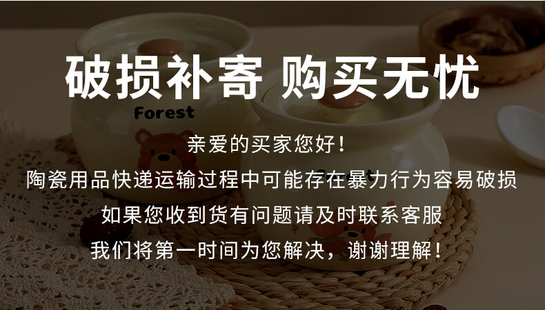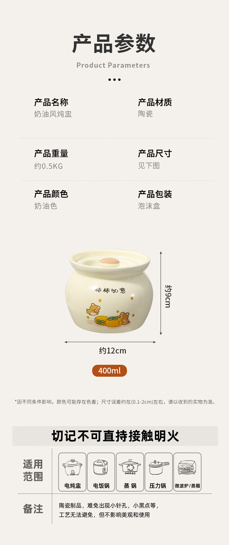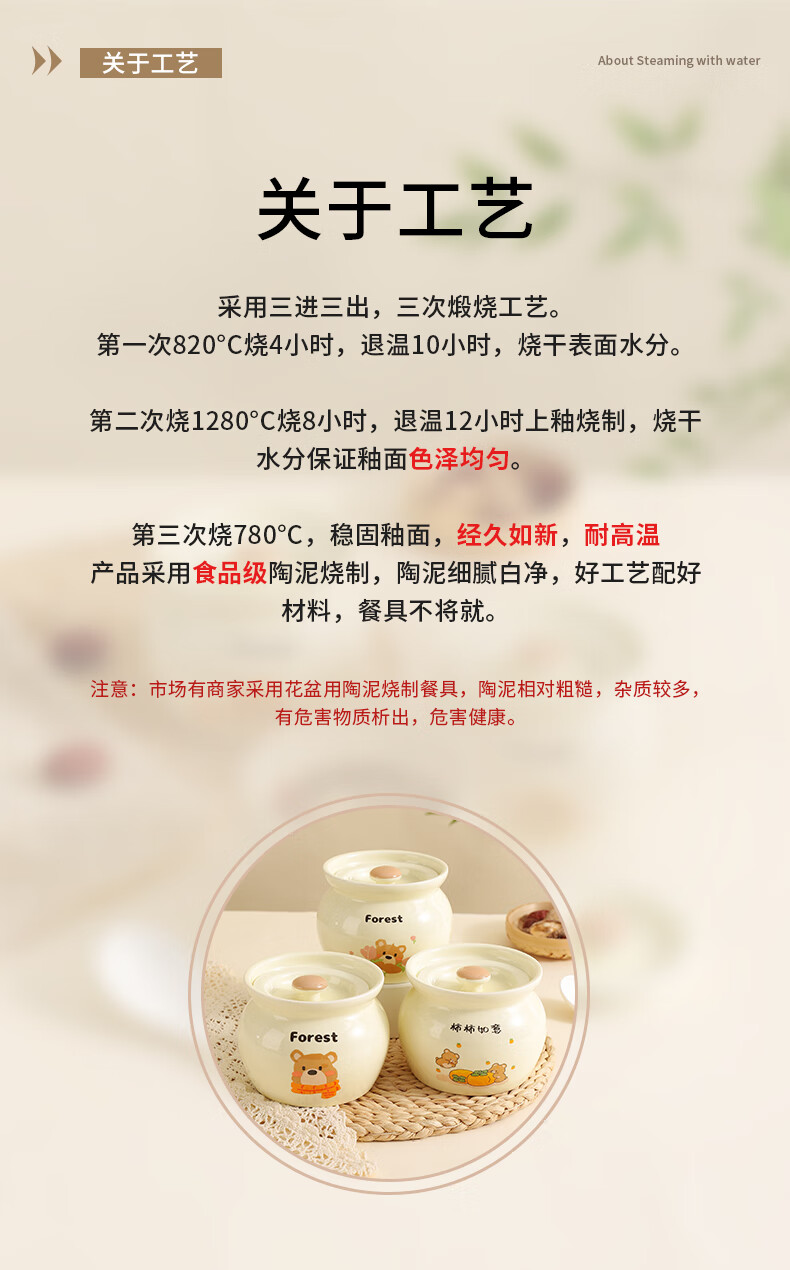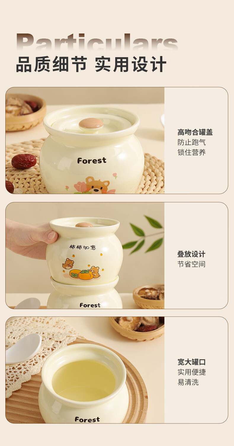 German crock pot stew pot for one person, food-grade household water-proof stew pot, soup pot with lid, steamed vegetable and egg bowl, cream color Ruyi Bear + Nuannuan Bear + Flower Bear + Apple Bear