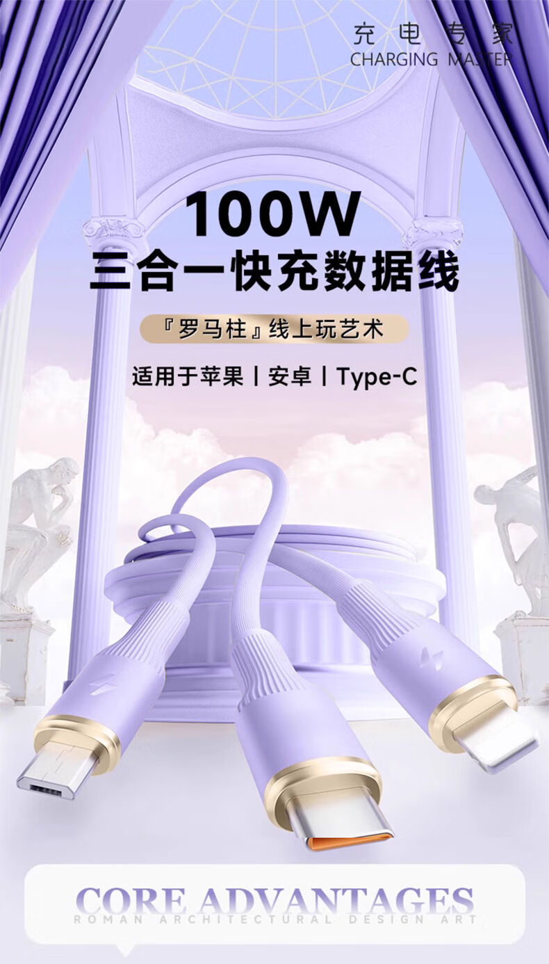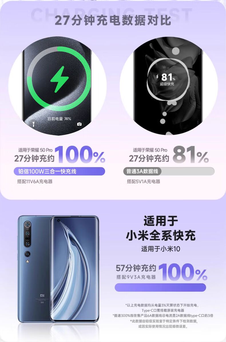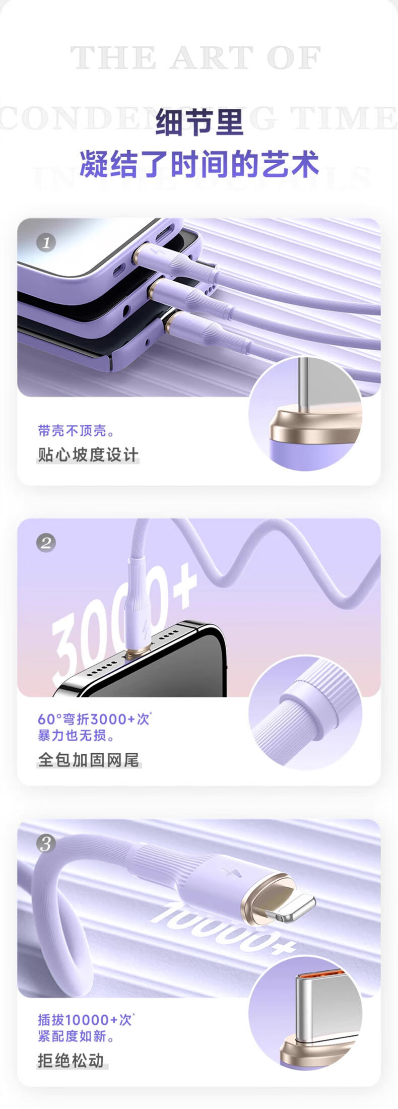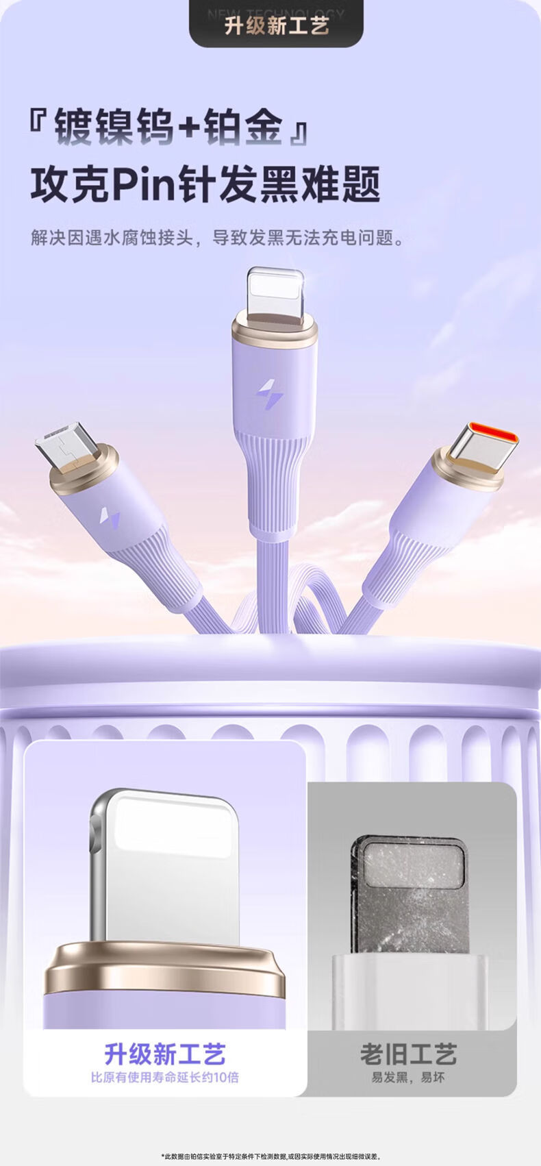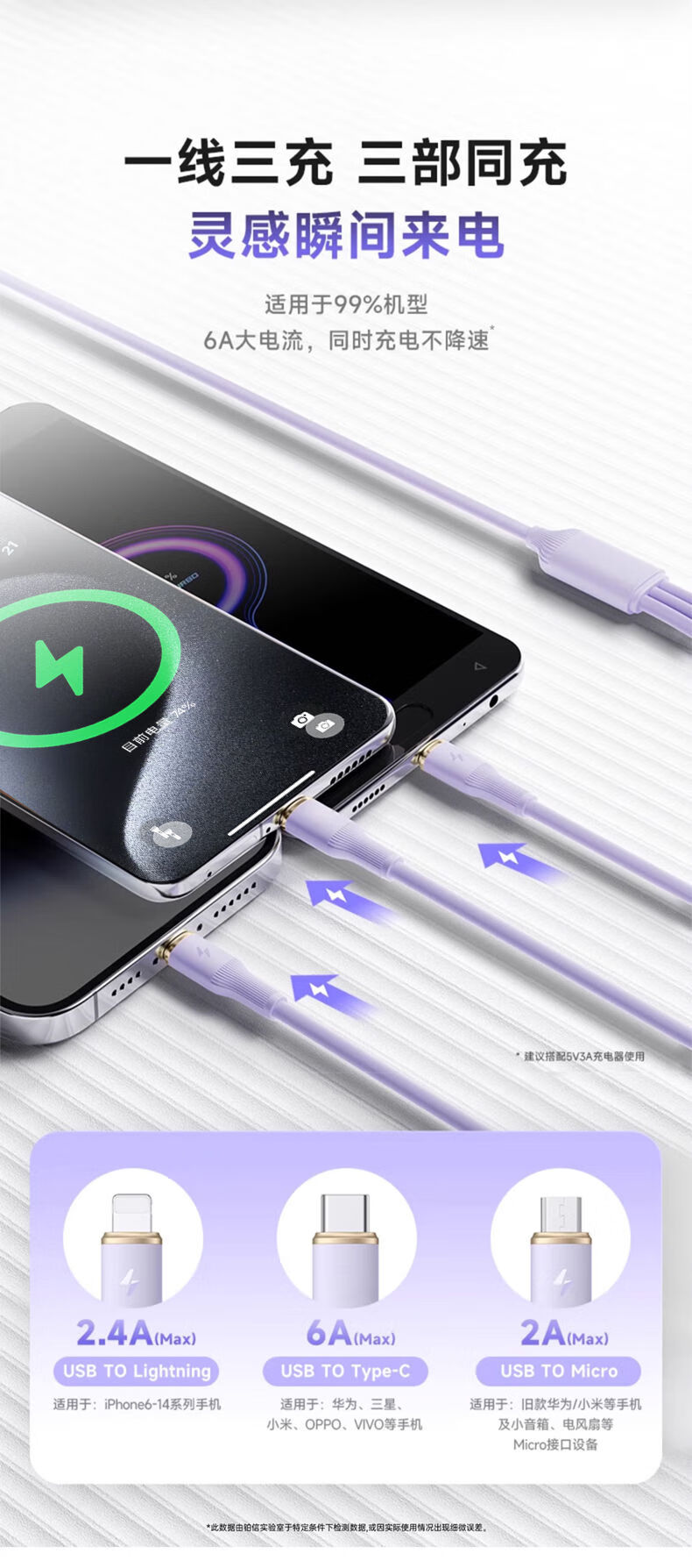 Port Emperor applicable data cable three-in-one charger cable liquid 100W fast charging three-head Apple Huawei vivo Android one-to-three Typec mobile phone iPhone multi-head multi-function vehicle purple 1.5 meters newly upgraded super fast charging C port 27 minutes to fully charge