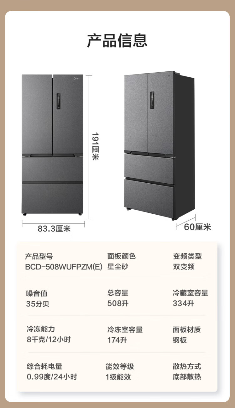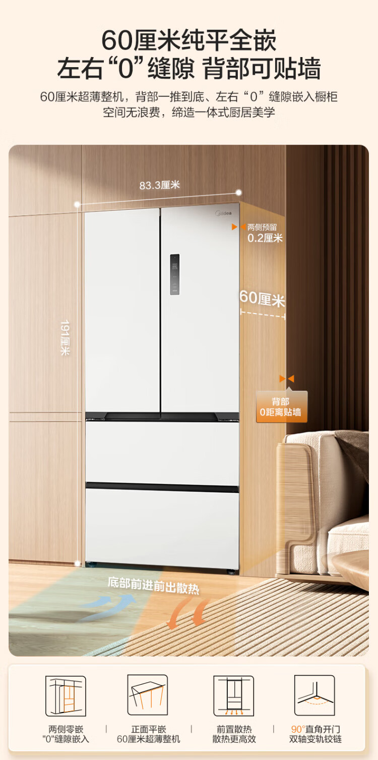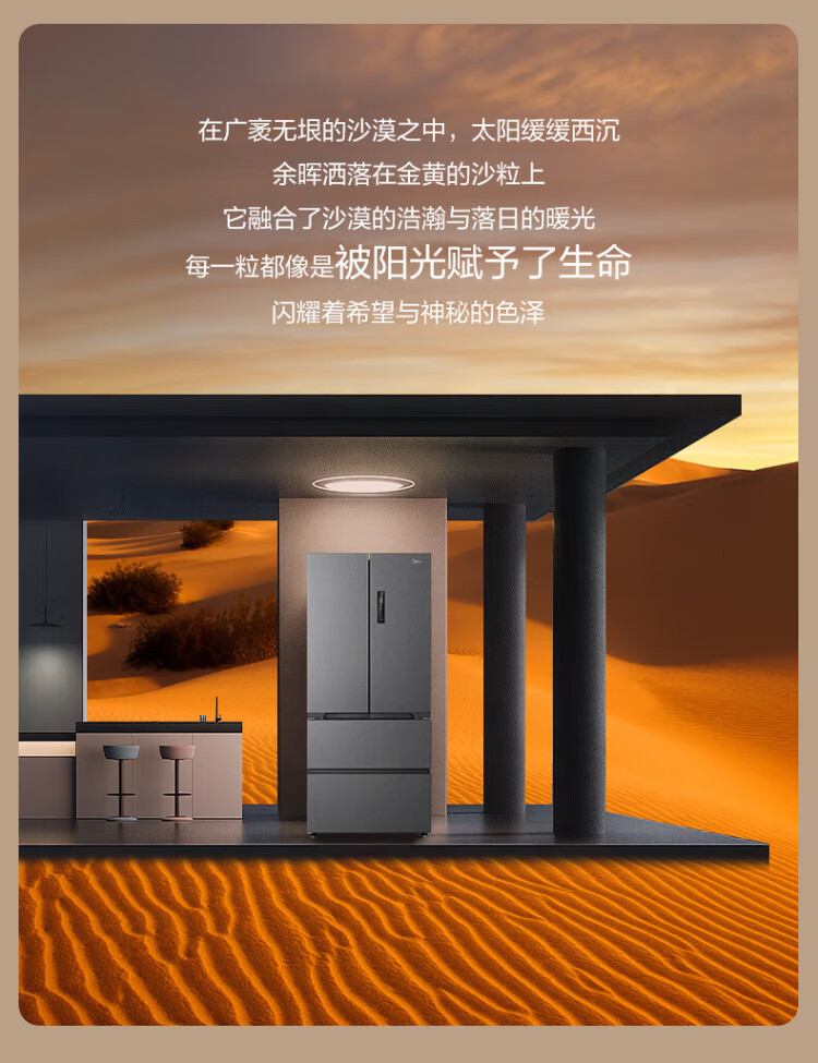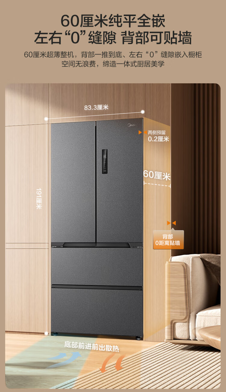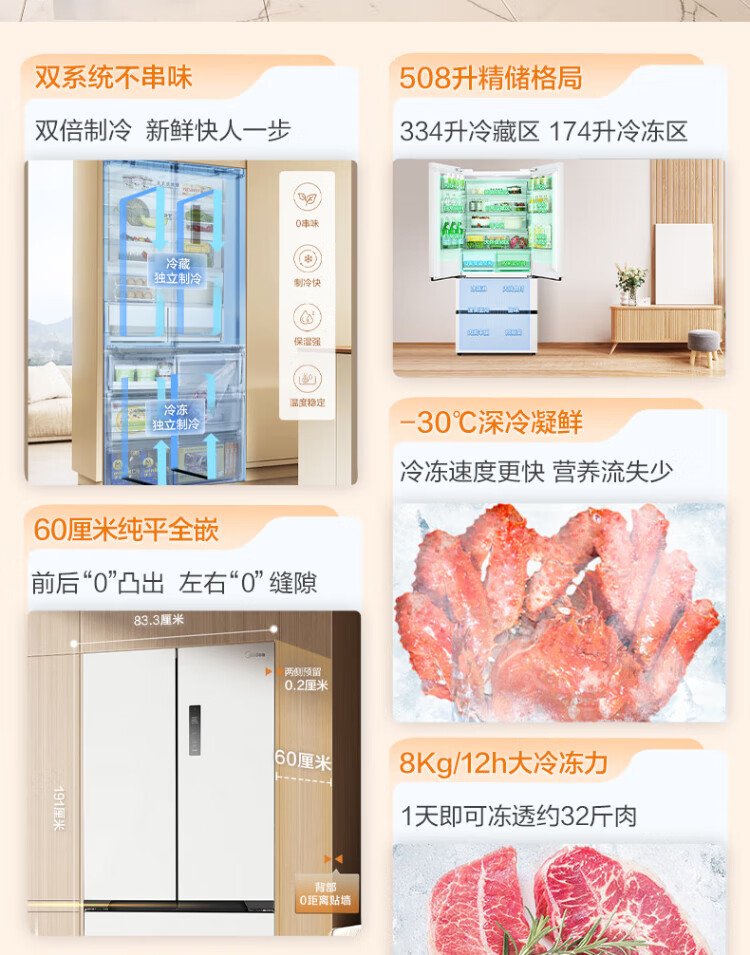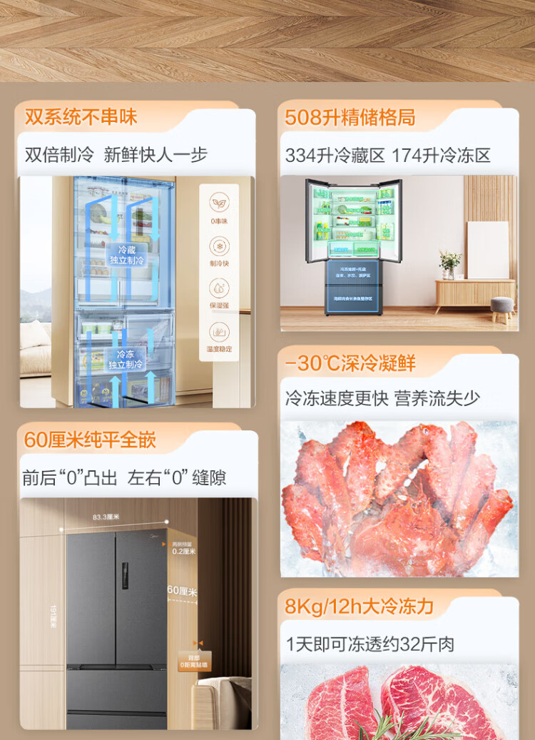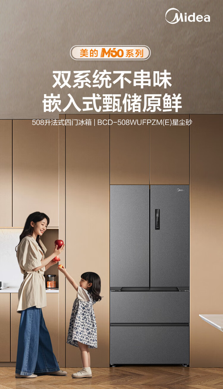 Midea Zhenxiang series 508 French multi-door 60cm ultra-thin zero-embedded four-door dual-system bottom cooling refrigerator subsidy instant discount BCD-508WUFPZM (E) Stardust Sand