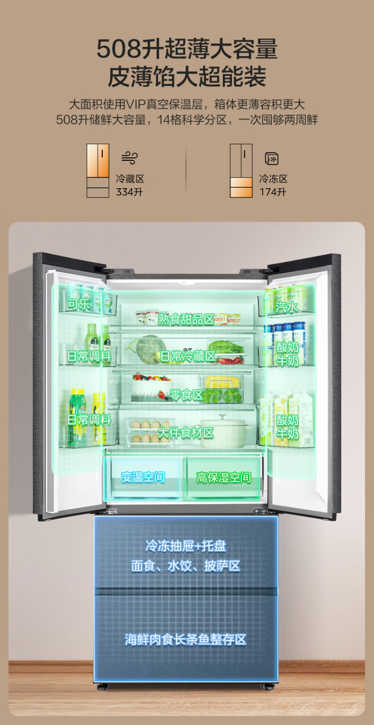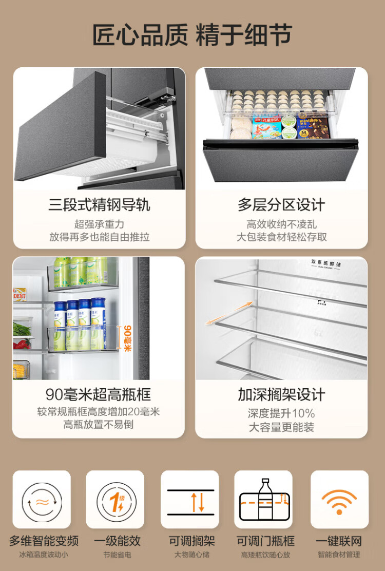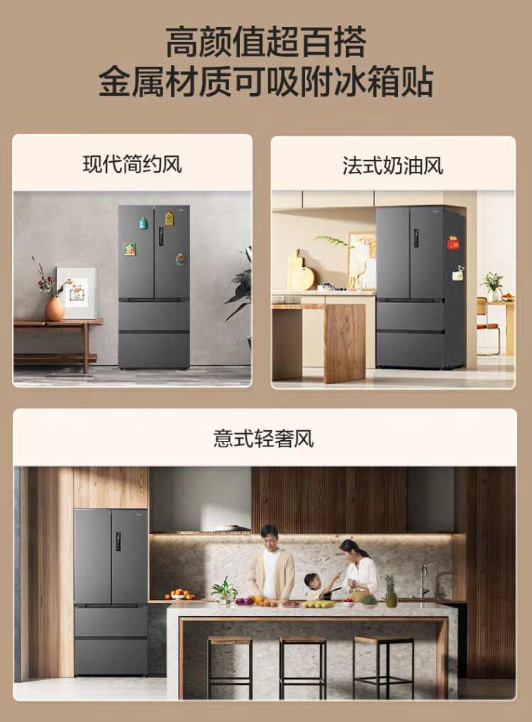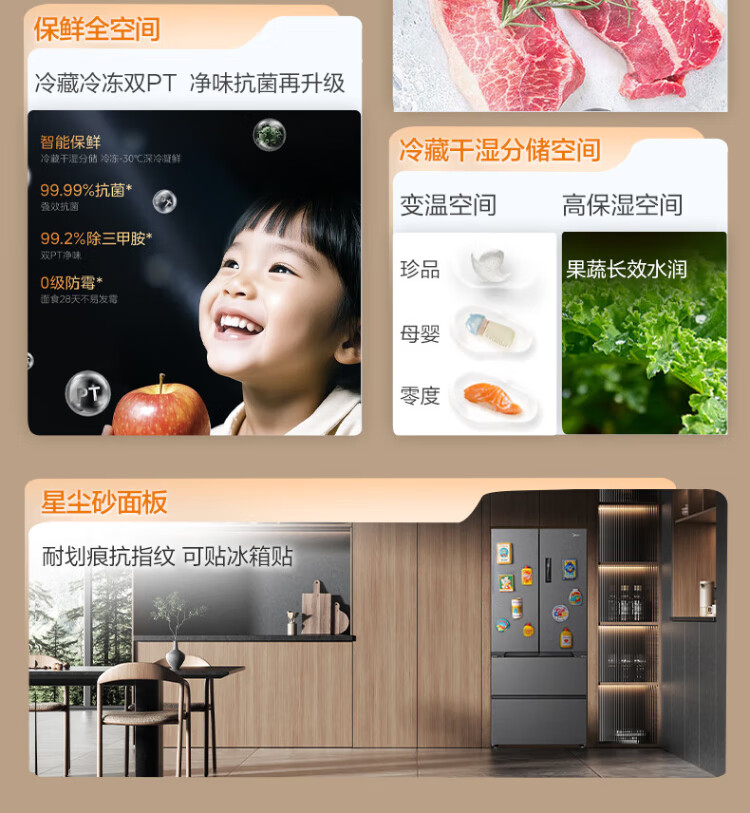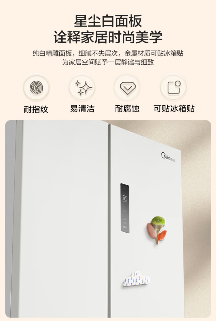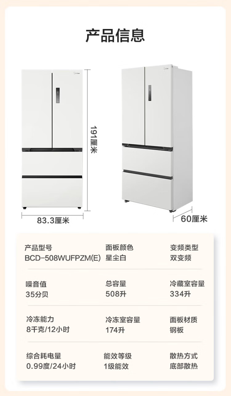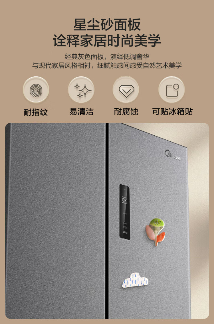 Midea Zhenxiang series 508 French multi-door 60cm ultra-thin zero-embedded four-door dual-system bottom cooling refrigerator subsidy instant discount BCD-508WUFPZM (E) Stardust Sand